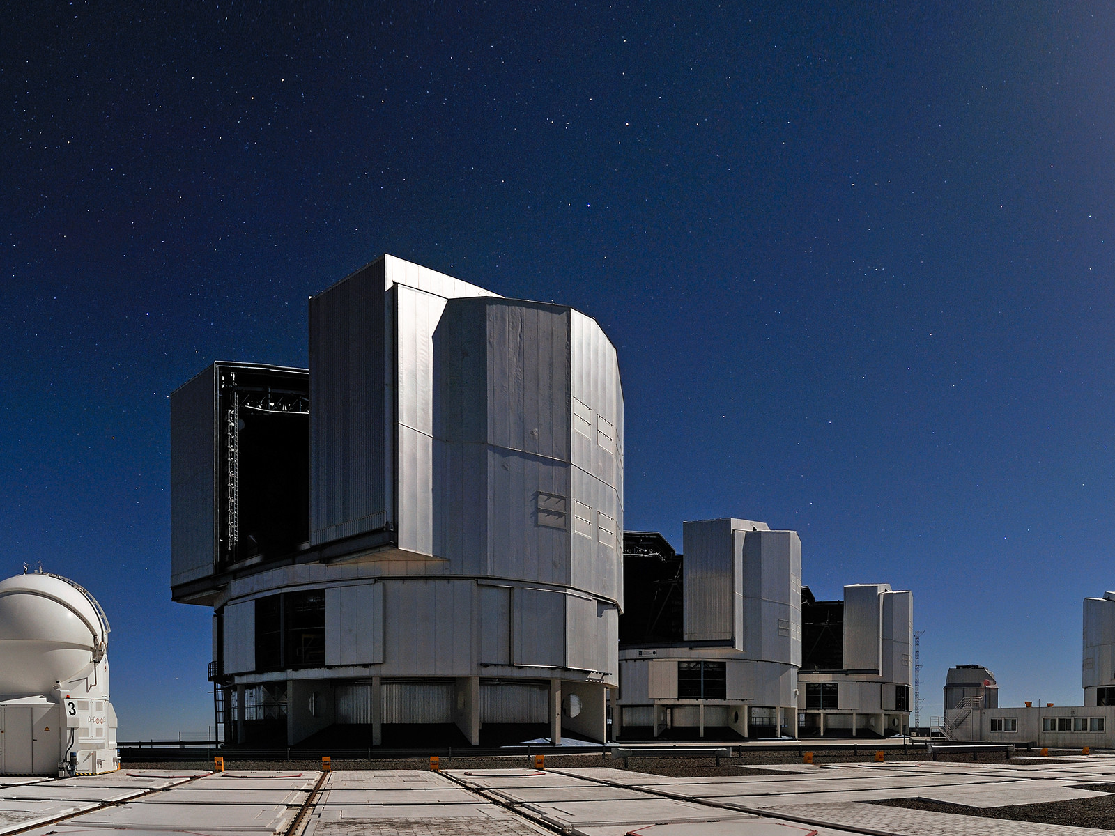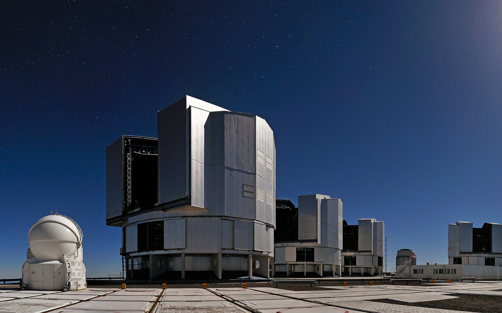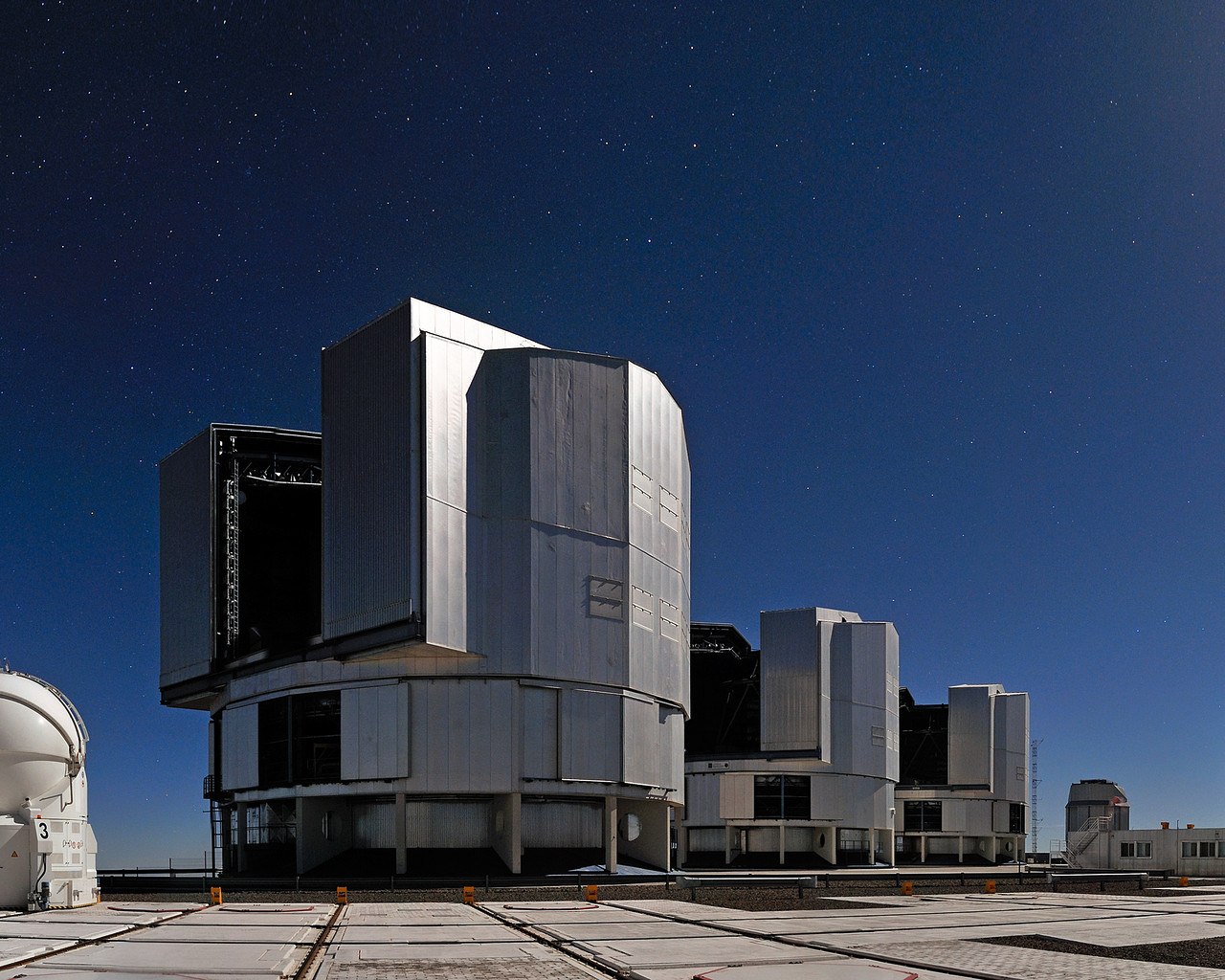 Two of the four 1.8-metre Auxiliary Telescopes, which are also part of the VLTI, can be seen in the picture together with the UTs. While the larger telescopes are fixed, these smaller instruments, in round enclosures, can be relocated to 30 different stations. With the ATs as part of the VLTI, astronomers can capture details up to 25 times finer than with a single UT.
