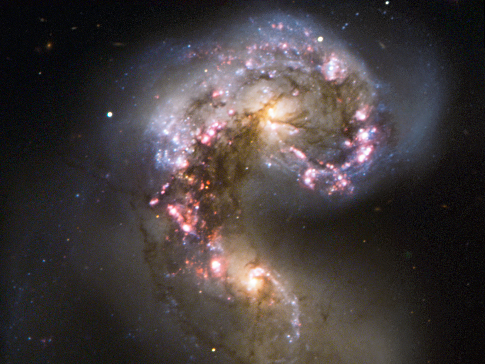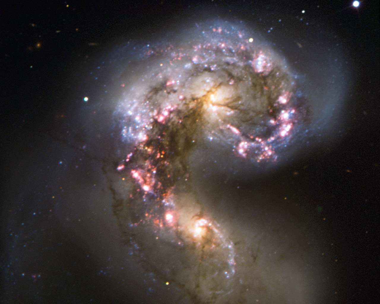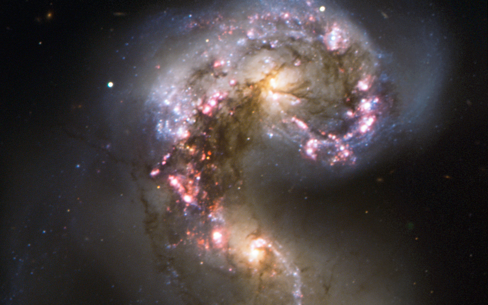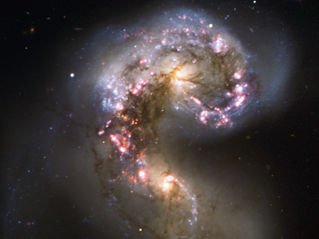 This VLT view focuses instead on the galaxies’ nuclei, where the real action is taking place as the two galaxies merge into a single giant galaxy. Spurred by shock waves created by their gravitational wrestling, the two galaxies have become dotted with brilliant blue hot young stars in star-forming regions, surrounded by glowing hydrogen gas, shown here in pink. The two pale yellow blobs are the cores of the original galaxies, shining with the light of old stars and picked out by delicate lanes of dust.