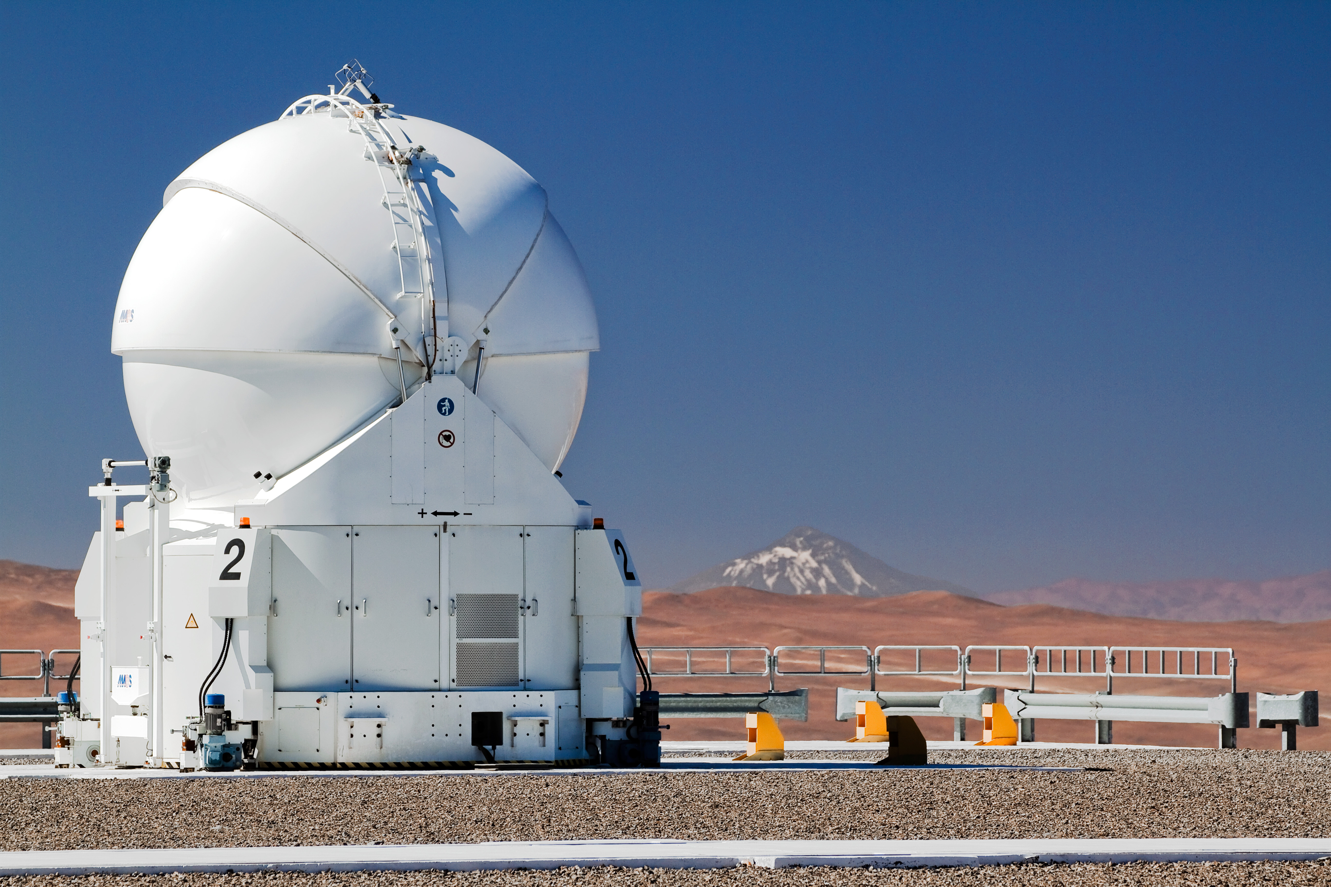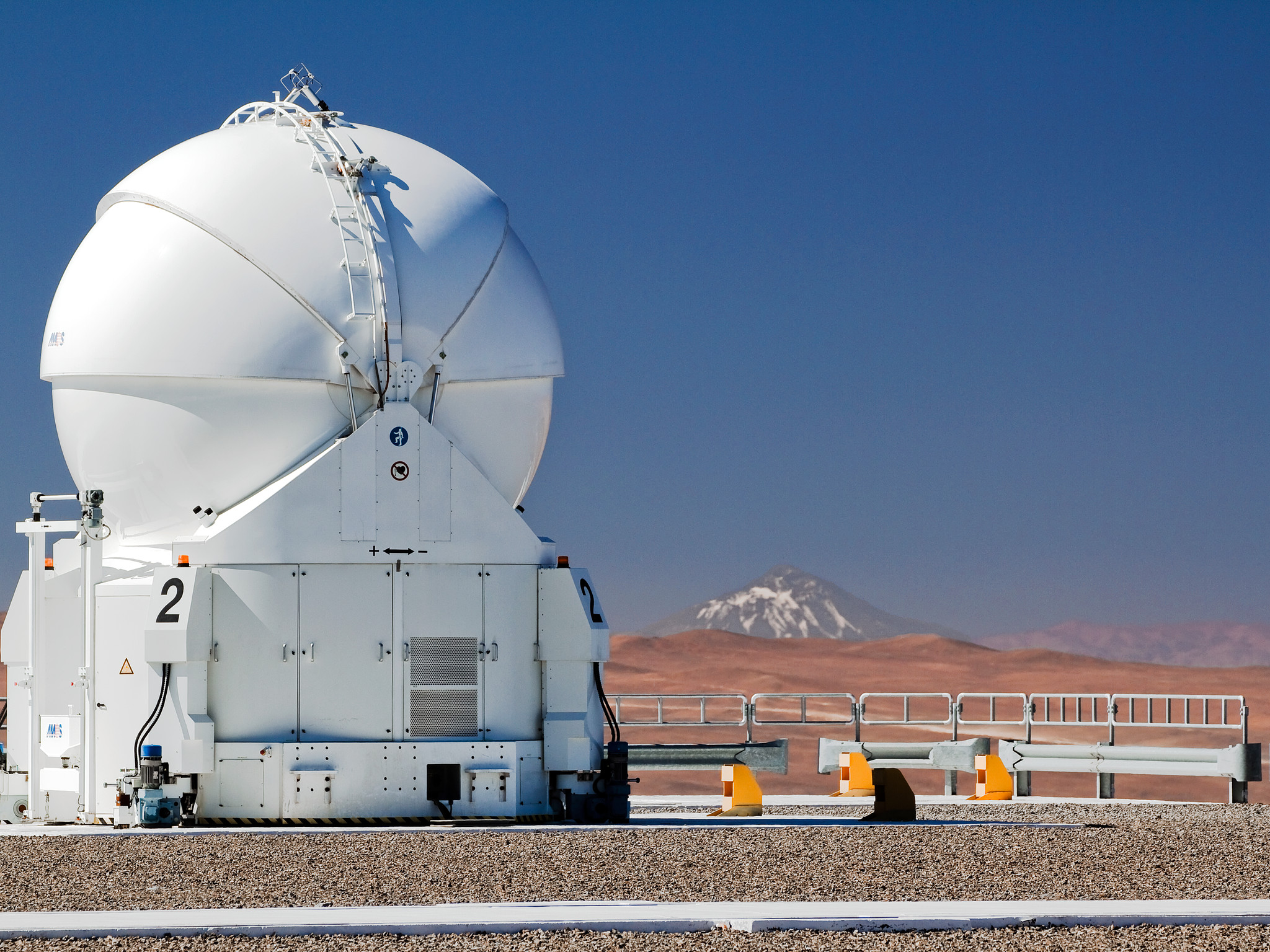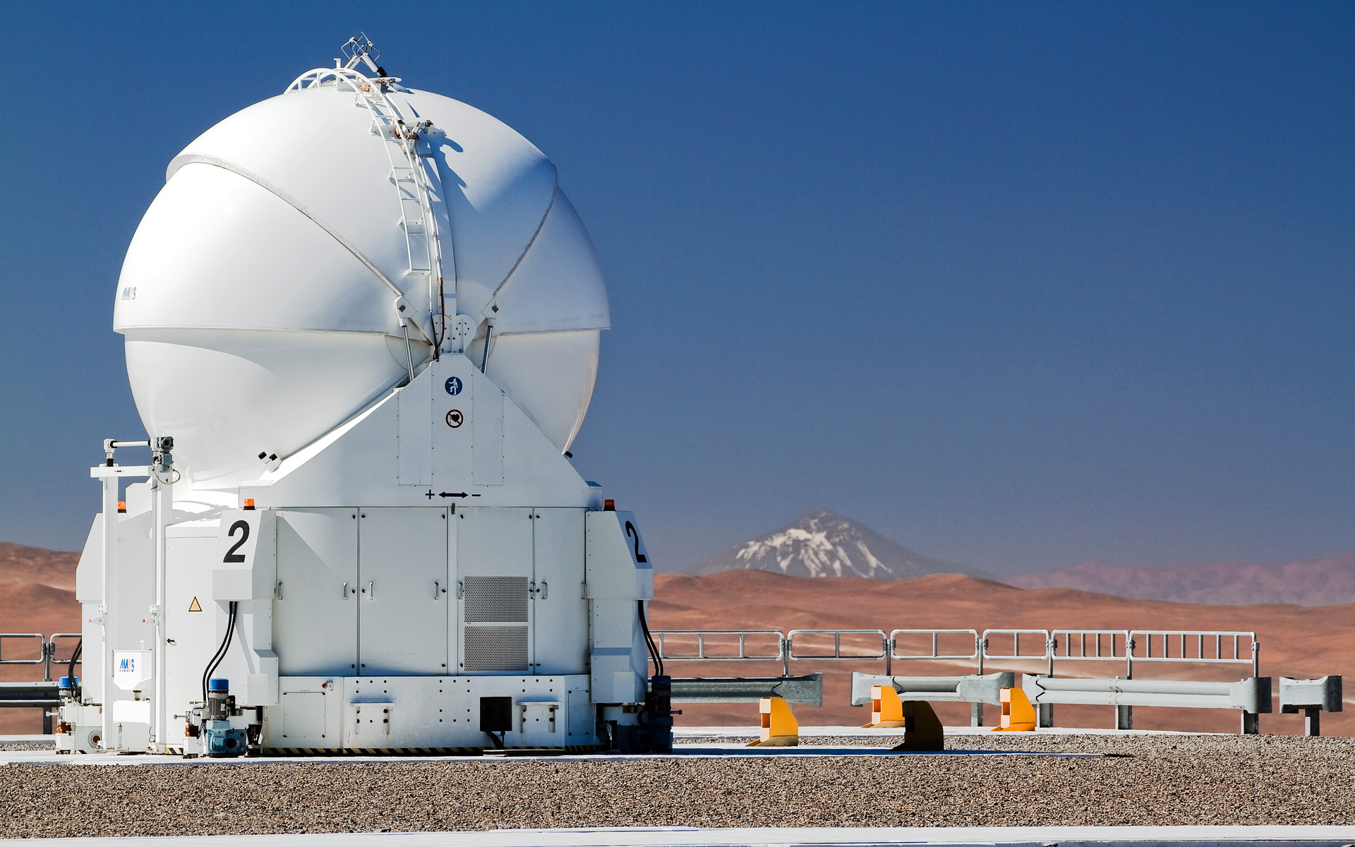 The magnificent 6739-metre volcano Llullaillaco stands proudly in the background of this photograph. Although it looks relatively close on the horizon, it is actually an incredible 190 kilometres away, on the border with Argentina. That Llullaillaco can be seen so clearly is evidence of the region’s unparallelled atmospheric conditions. The clear air is one of the many factors that make this such a wonderful location for astronomical observatories. It is from this excellent vantage point that ESO astronomers study objects that are not just hundreds of kilometres in the distance, but billions of light-years away.