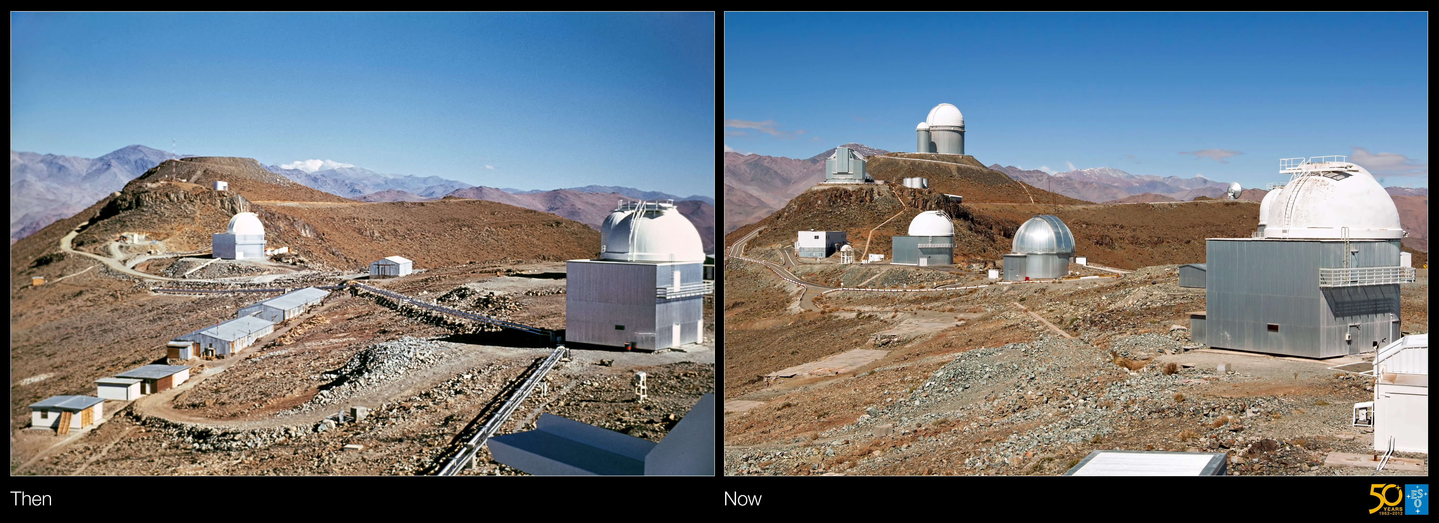 Our first stop on this journey through time is at La Silla, the first of ESO’s observatory sites. The historical image was taken in the late 1960s or early 1970s from the dome of the ESO 1.52-metre telescope, which had its first light in 1968. A second photograph, taken in the present day, shows how much the observatory has changed over the decades.