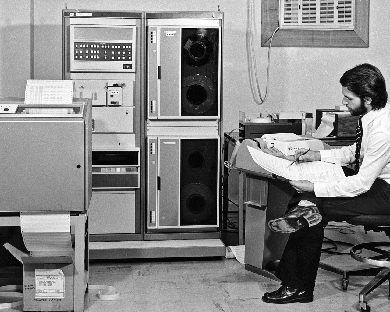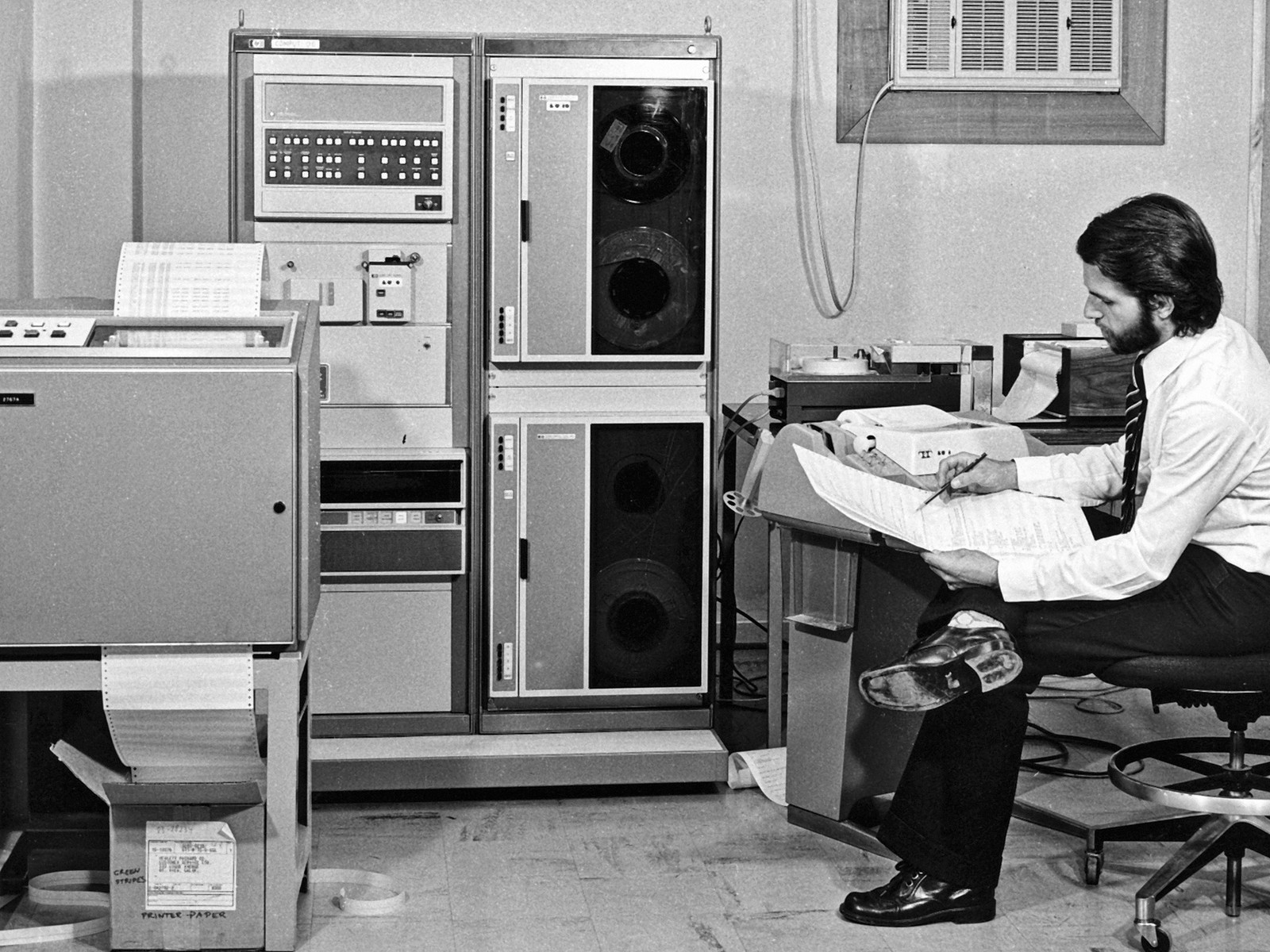 In this historical image, taken in 1974 in the ESO offices in Santiago, Chile, we can see the Austrian astronomer Rudi Albrecht, pencil in hand, poring over code in front of a teletype. He was working on software for the Spectrum Scanner attached to the ESO 1-metre telescope located at the La Silla Observatory. The data were processed in Santiago using the Hewlett Packard 2116 minicomputer which can be seen behind the printer. This bulky computer, with one processor and a breathtaking 16 kilobytes of magnetic-core memory (!), stored the results on magnetic tape, ready for further processing by visiting astronomers on computers at their home institutes. To handle files on tape that were larger than the available memory, Albrecht developed a virtual memory system, which he contributed to the Hewlett Packard Software Center.