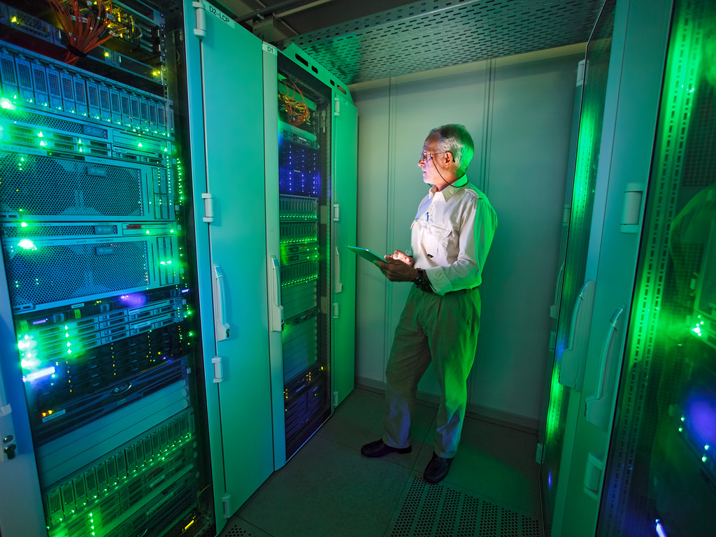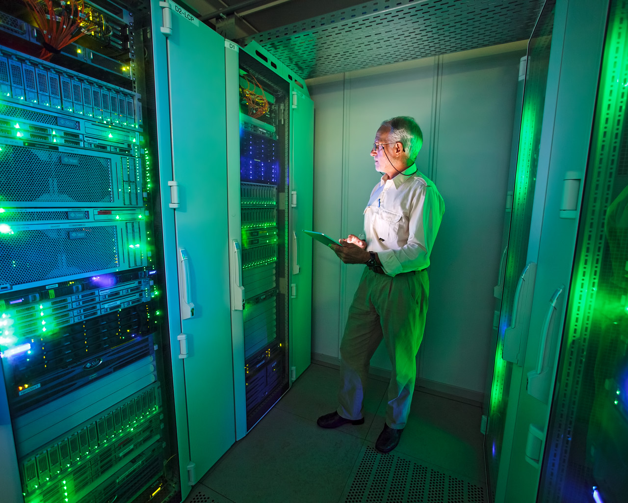This image shows the Austrian astronomer Rudi Albrecht in the Data Centre at ESO Headquarters in Garching bei München, Germany, which archives and distributes data from ESO’s telescopes. He is in front of a rack containing a system with 40 processor cores, 138 terabytes of storage capacity and 83 gigabytes of RAM — over 5 million times more than the machine used by him back in 1974! Even the tablet computer he is holding far outperforms the older machine, and provides a modern alternative to pencil and paper.