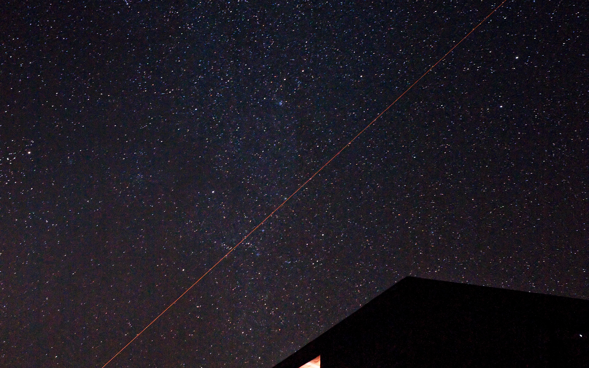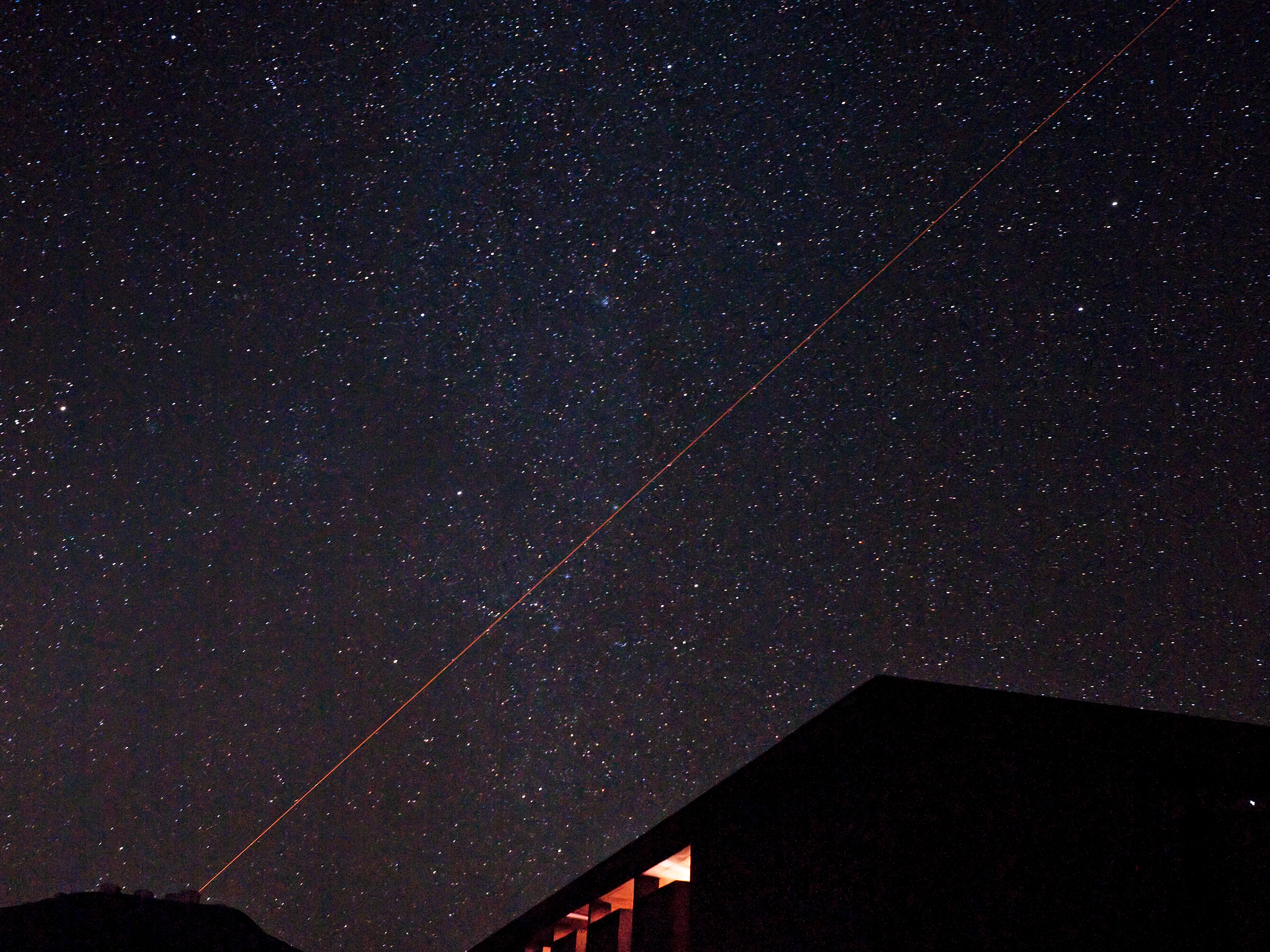 Night view of the Paranal Observatory, obtained on 21 March 2009. The Residencia — the place where staff can eat and sleep — is visible in the foreground, while one can distinguish the 8.2-metre Unit Telescopes of ESO’s Very Large Telescope in the higher background. Yepun, the Unit Telescope no. 4, is seen using the laser guide star to assist the adaptive optics instruments on the VLT. This allows astronomers to obtain images free from the blurring effect of the atmosphere, regardless of the brightness and location on the sky of the observed target. The image shows the great value of the dark night sky above Paranal. The band of the Milky Way is running through the image vertically. Orion and the Orion Nebula can be seen in the upper left corner along with a number of other interesting deep-sky objects in Auriga, the Charioteer. Tremendous efforts are being put into preventing light pollution from the Residencia and surrounding cities. Only long exposures with sensitive digital cameras are able to reveal the dim lights from the residencia rooms.