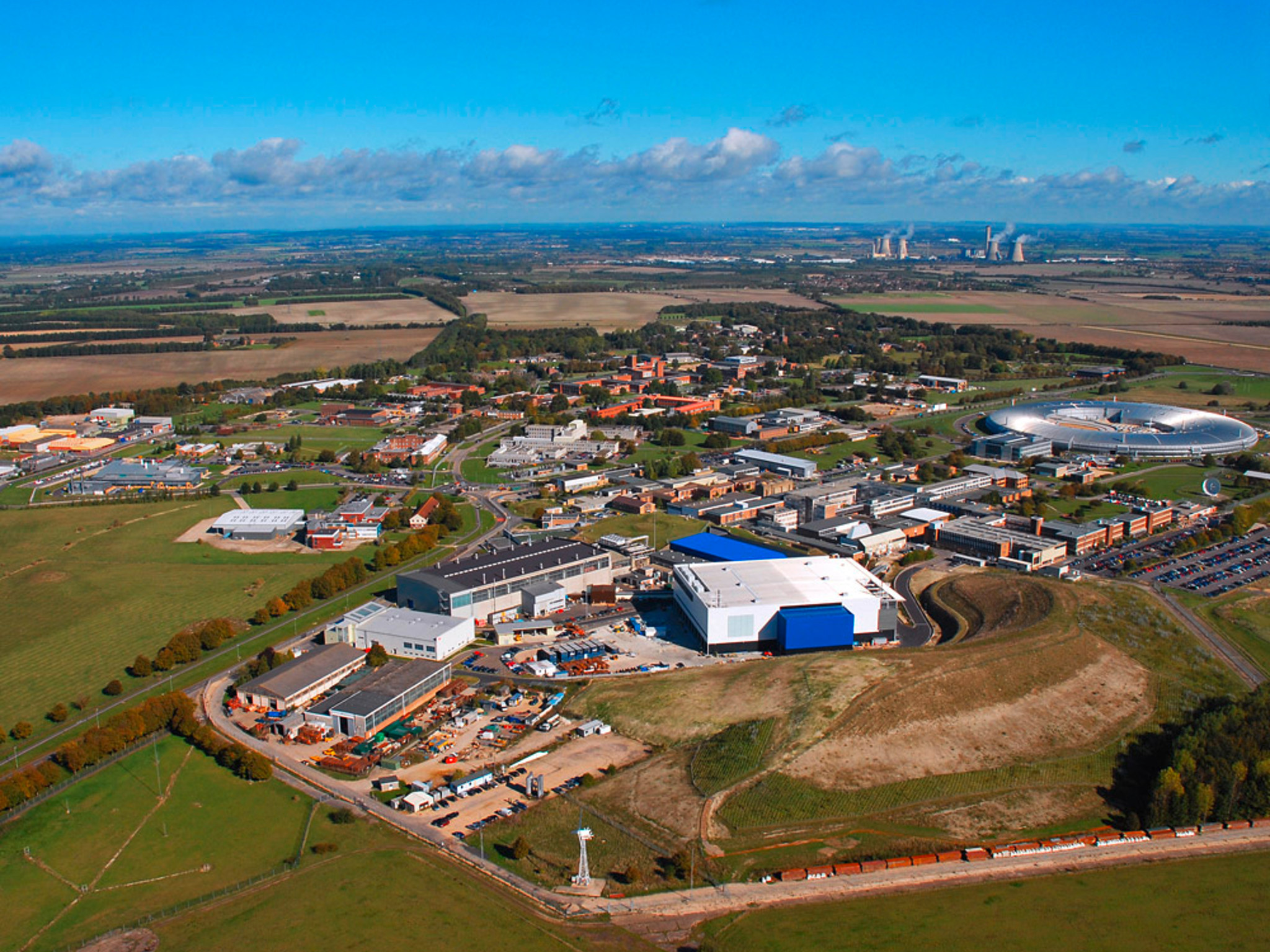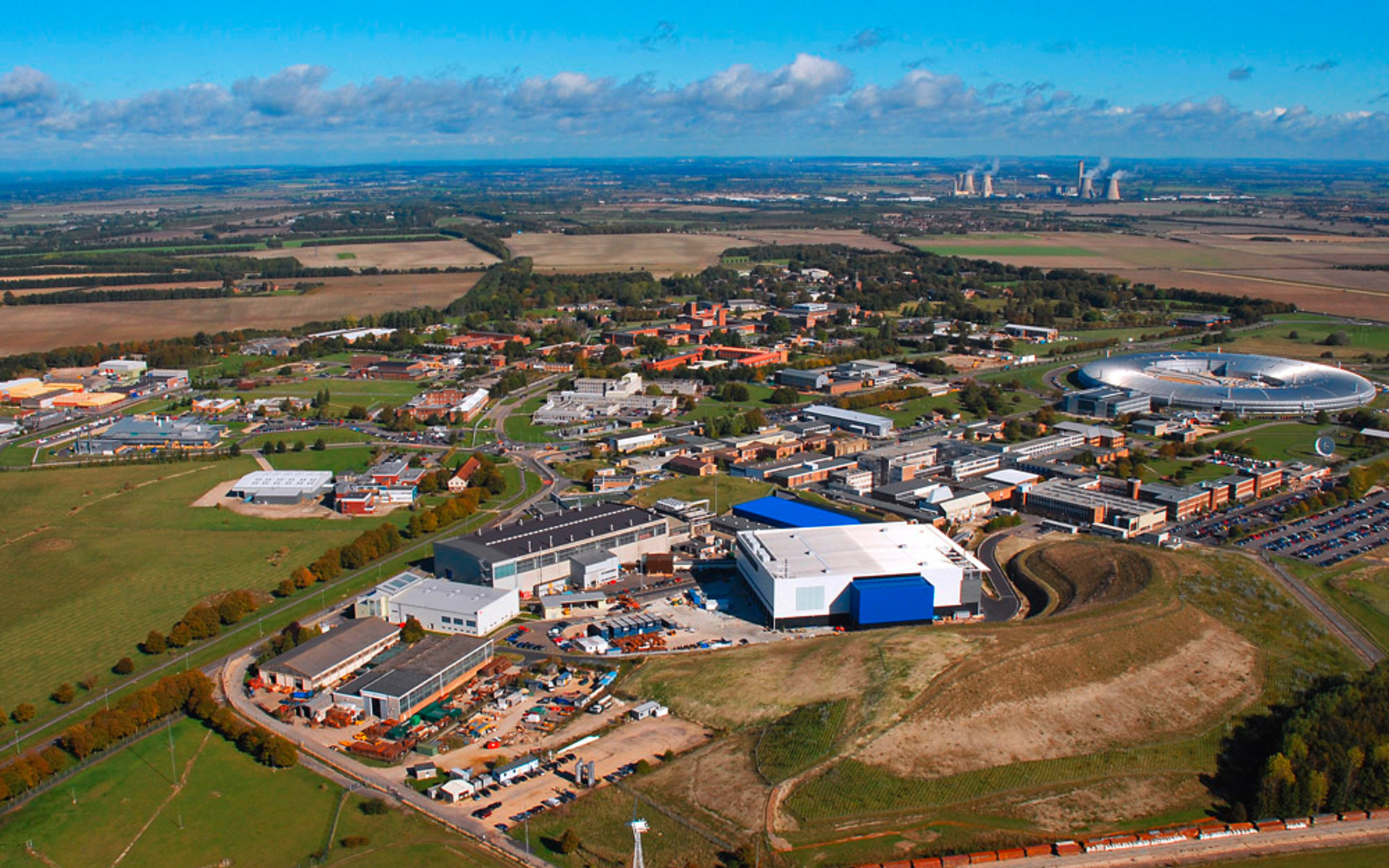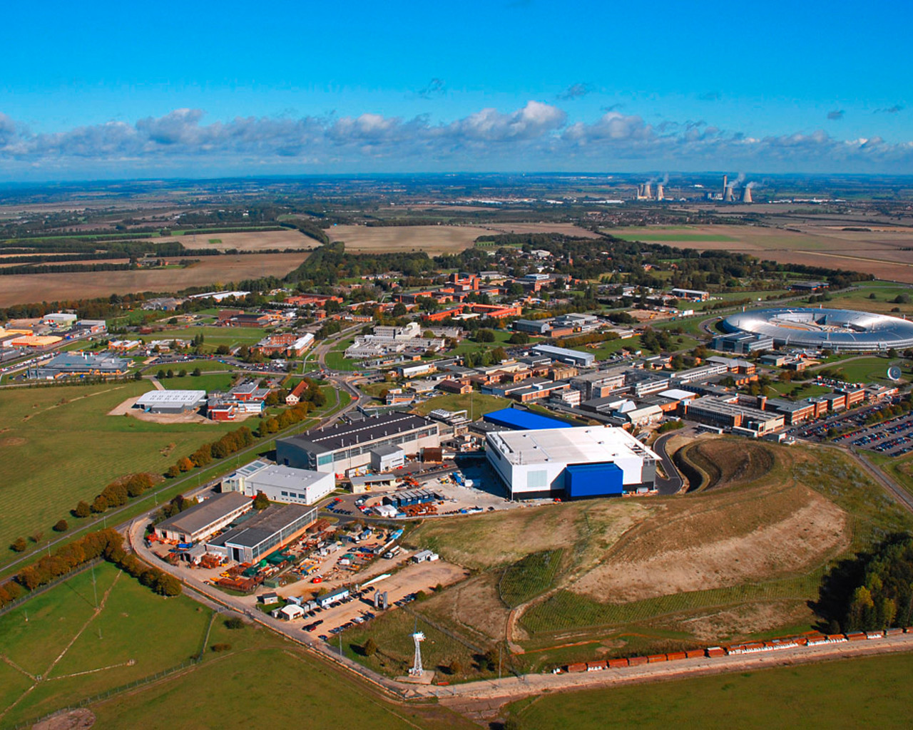 Aerial view of Harwell Oxford, showing RAL in the foreground and the Diamond Light Source in the background.