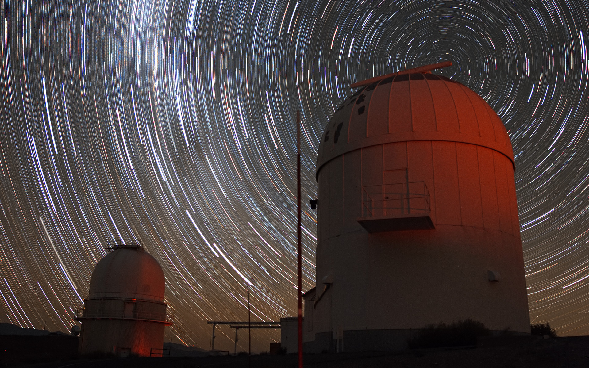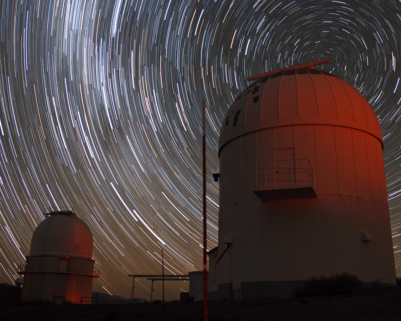 A long series of exposure at night captures these impressive star trails over ESO’s La Silla observatory. The stars appear as trails because of the apparent motion of the sky, which is, in fact, due to the rotation of the Earth on its own axis. The picture is taken looking toward the south. The celestial south pole is visible on the right, above the dome of the telescope seen in the foreground. The lighter area on the left is the diffuse glow of the Large and the Small Magellanic Clouds, two irregular galaxies which are neighbours of our Milky Way galaxy.