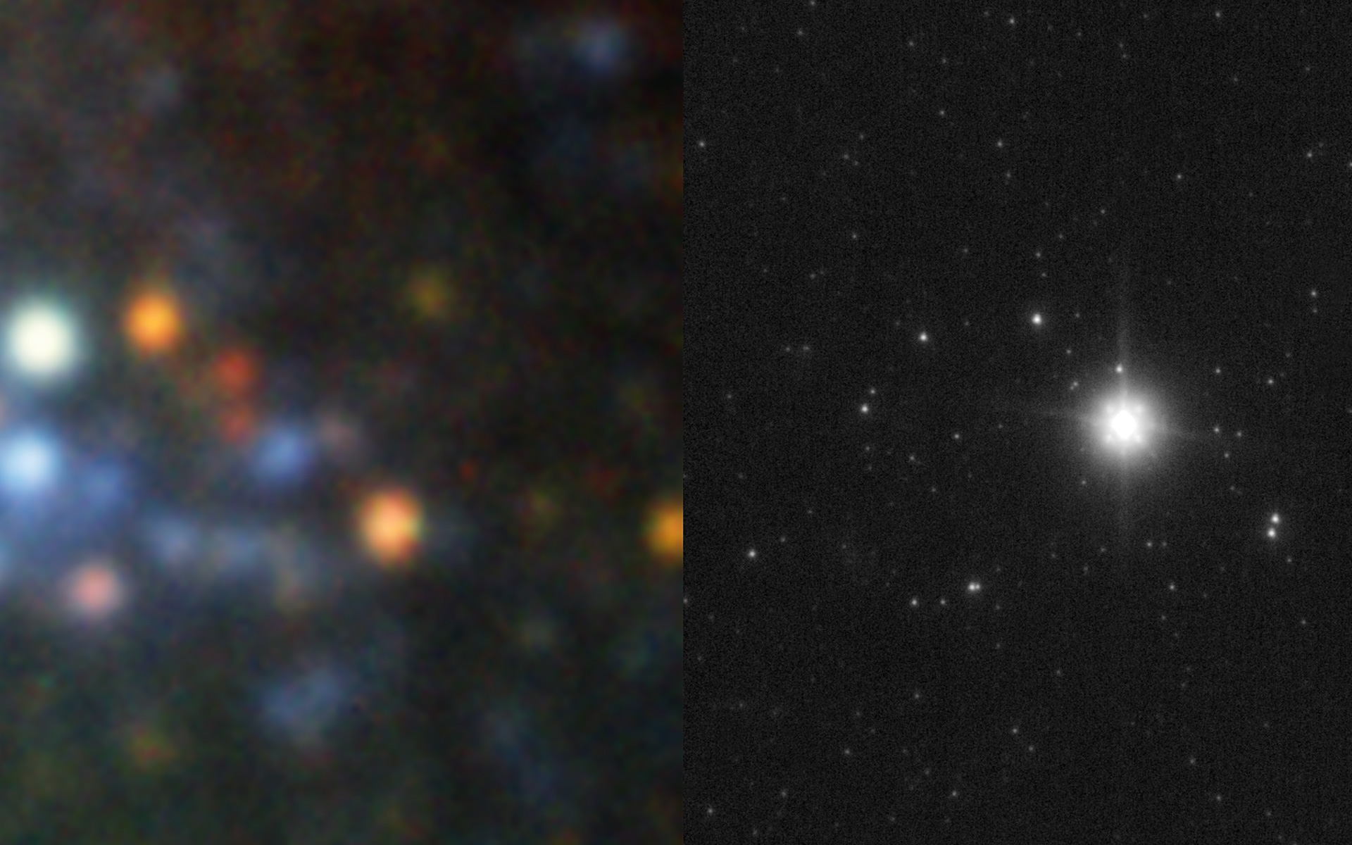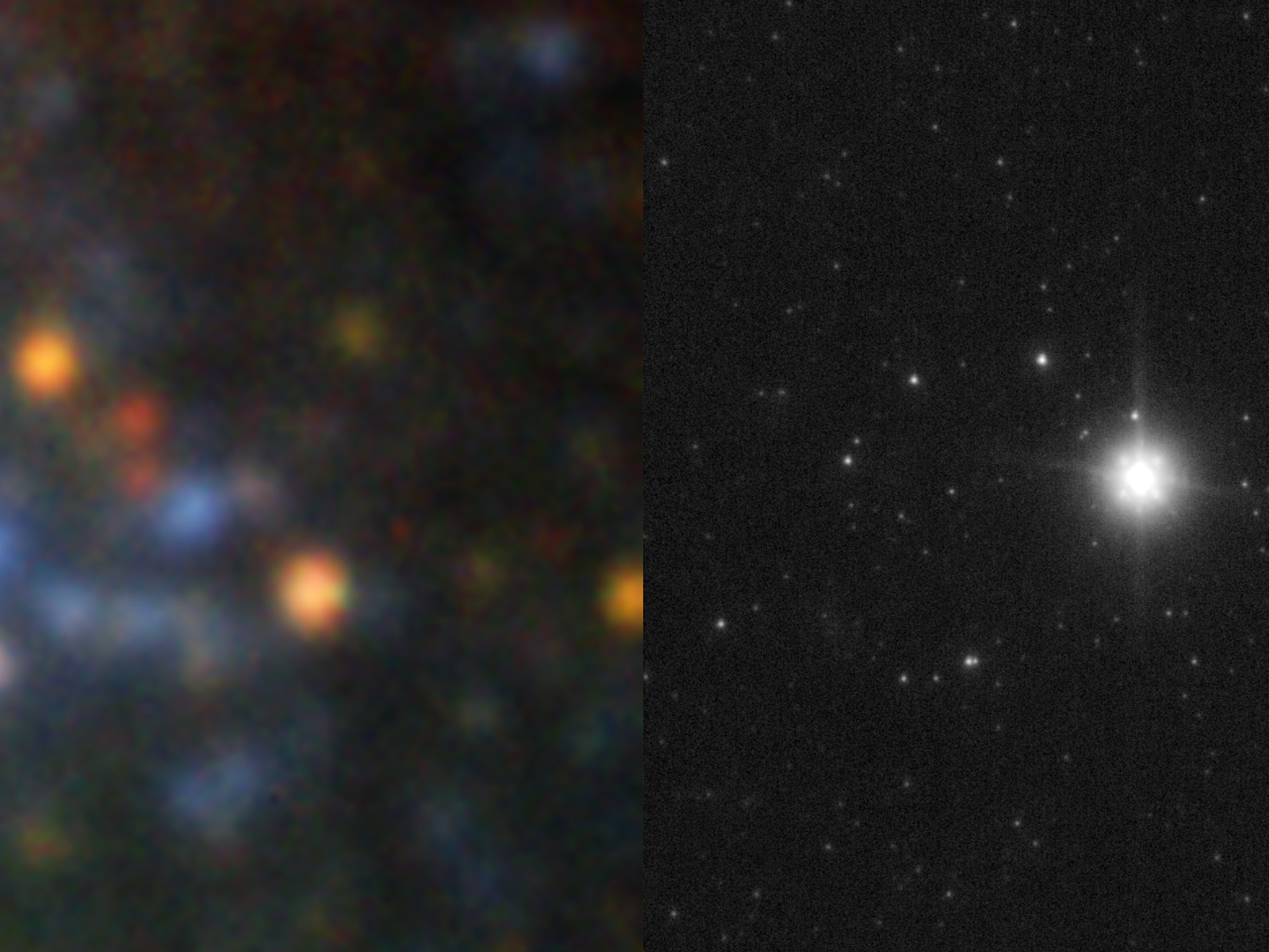 The image shows the star before it exploded (left), as observed with ISAAC and FORS on ESO's Very Large Telescope, and after the explosion (right), as seen by the very sharp NACO.