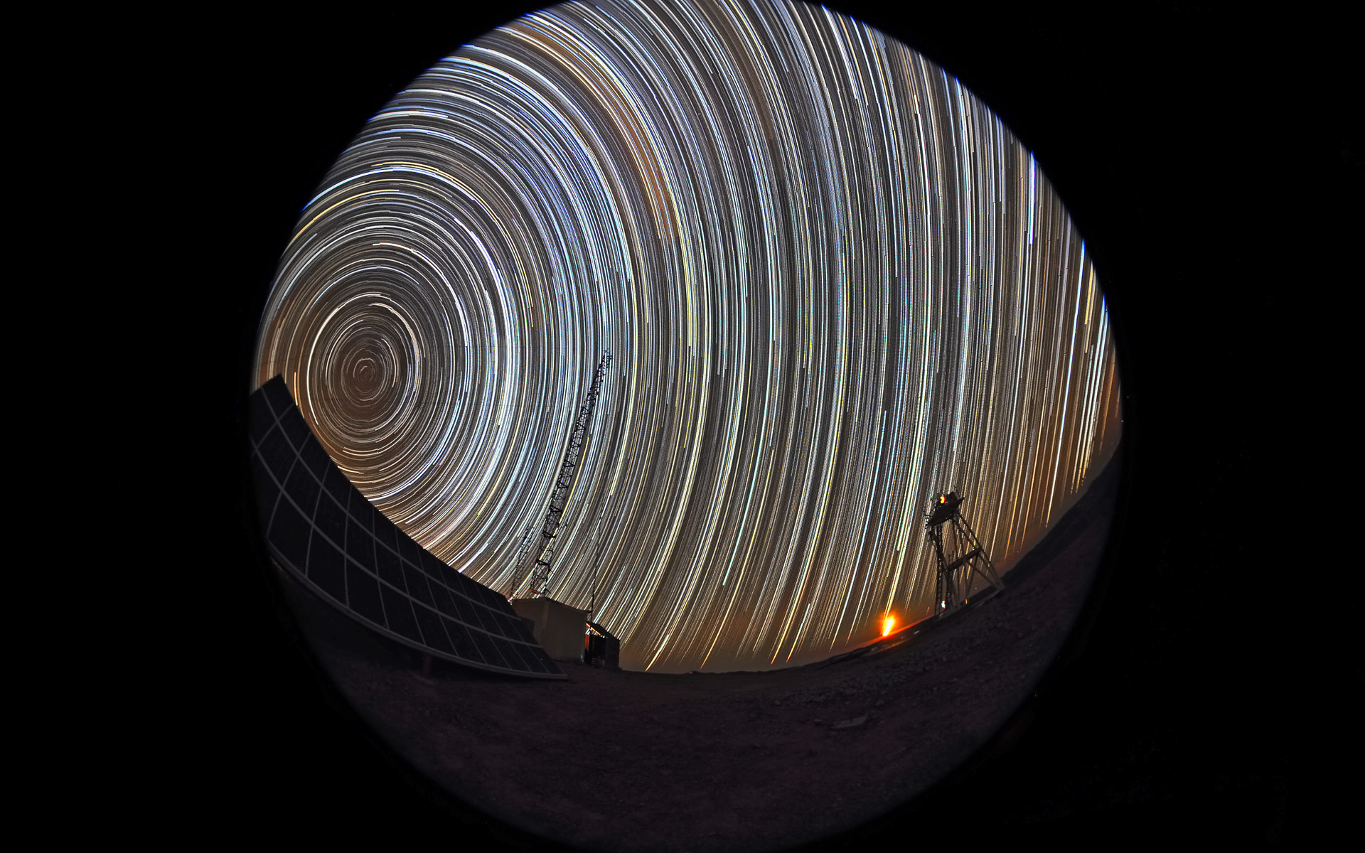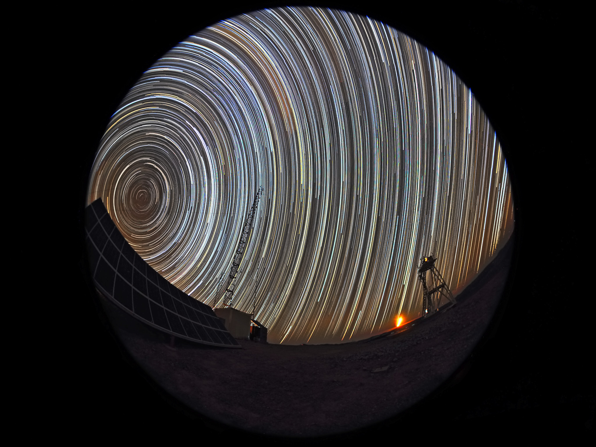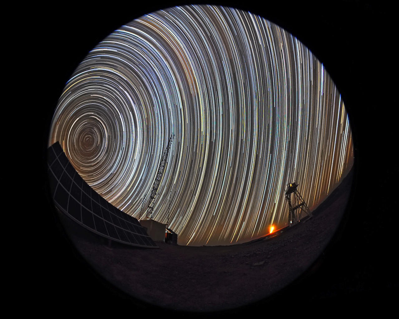This long exposure photograph shows the motion of the stars in the sky above Cerro Armazones, future home of the European Extremely Large Telescope. The photographer used a fish-eye lens to obtain the round effect.