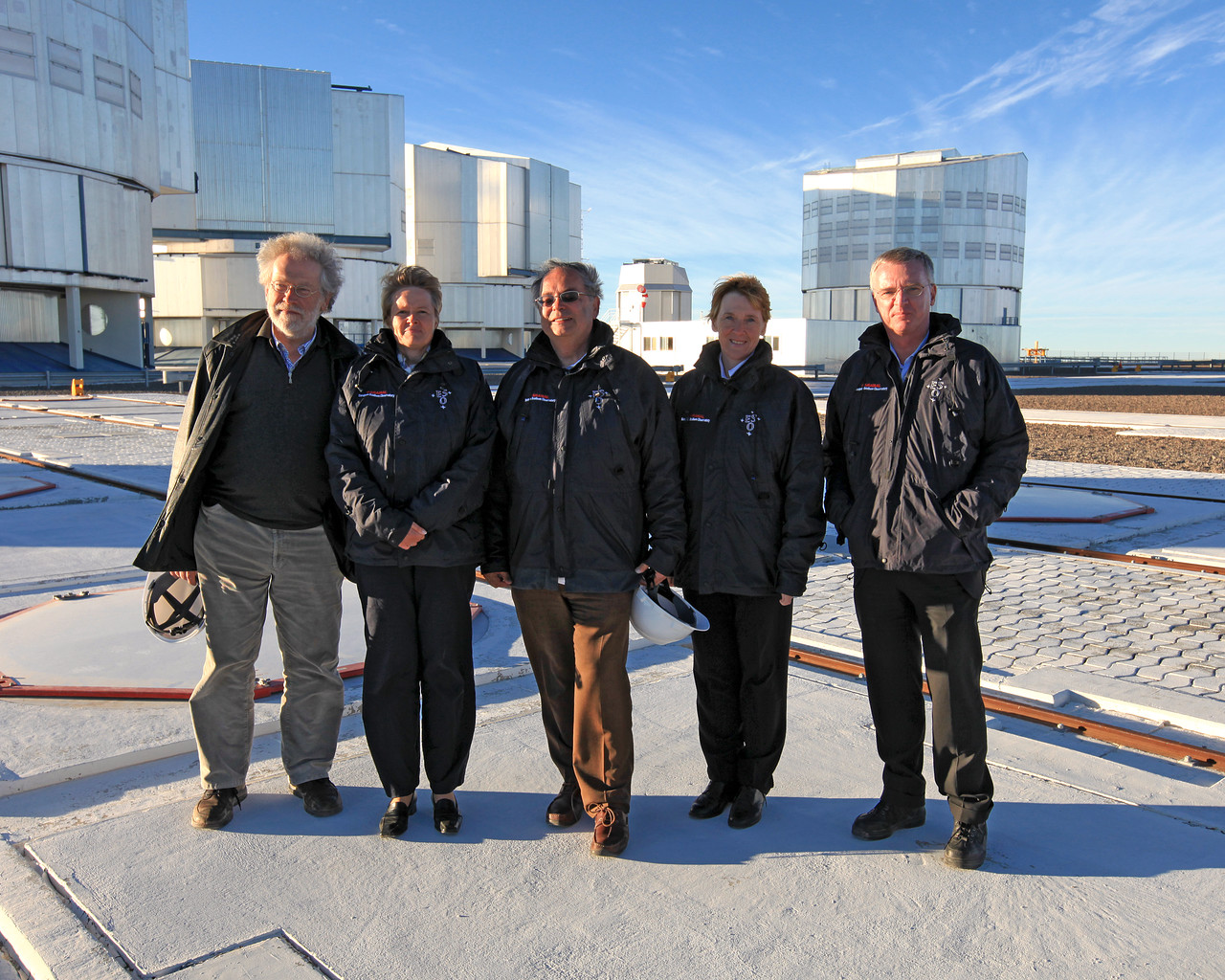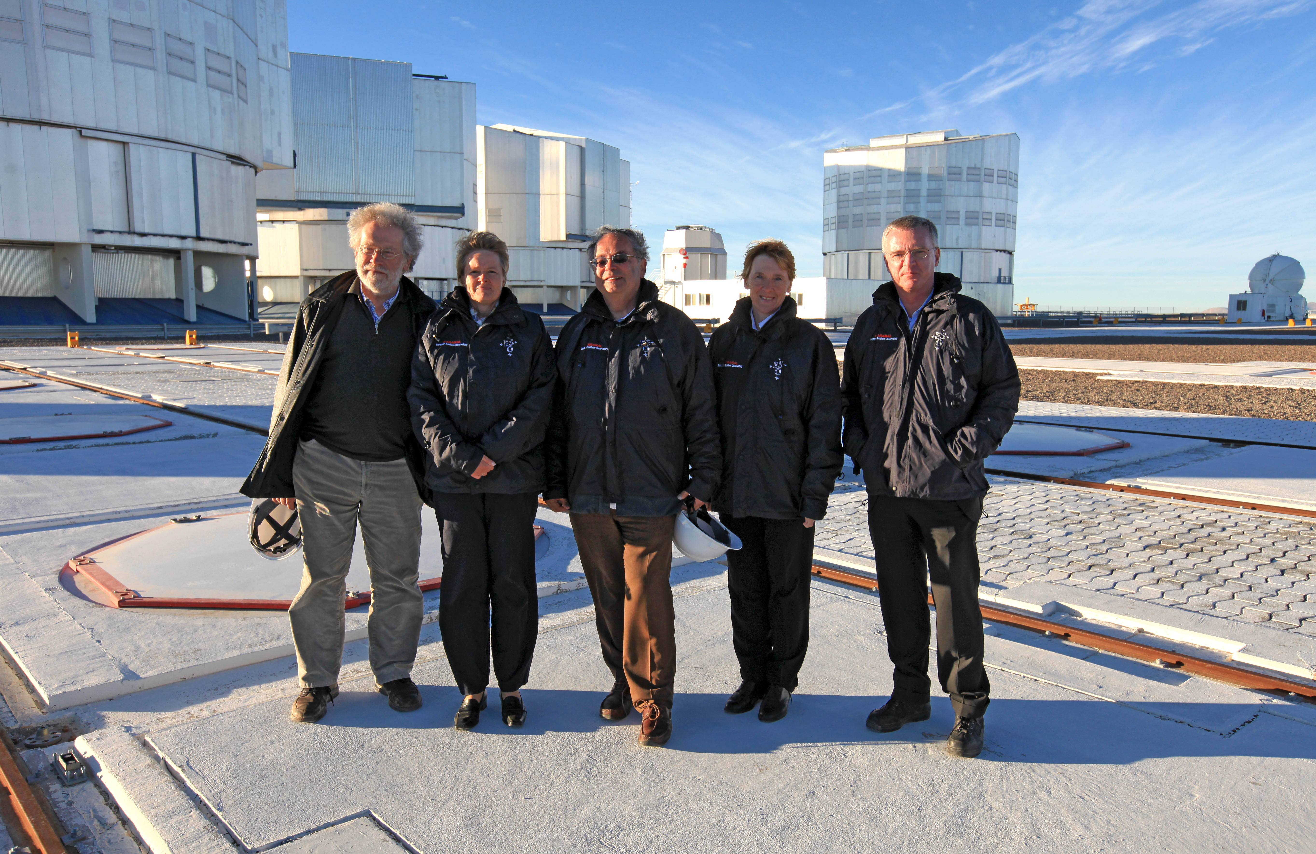 A delegation of members of the Austrian Ministry of Science and Research as well as representatives of several Austrian scientific institutes visits ESO’s Paranal Observatory on 22 May 2011. In the picture, taken on the VLT platform, are from left to right: Heinz Engl, elected Rector of the University of Vienna; Sabine Schindler, Director of the Institute for Astrophysics and Particle Physics at the University of Innsbruck; Daniel Weselka, Director of Basic Research and Research Infrastructure Department of the Austrian Ministry of Science and Research; Barbara Weitgruber, Director General of Scientific Research and International Affairs of the Austrian Ministry of Science and Research; Tim de Zeeuw, ESO Director General.