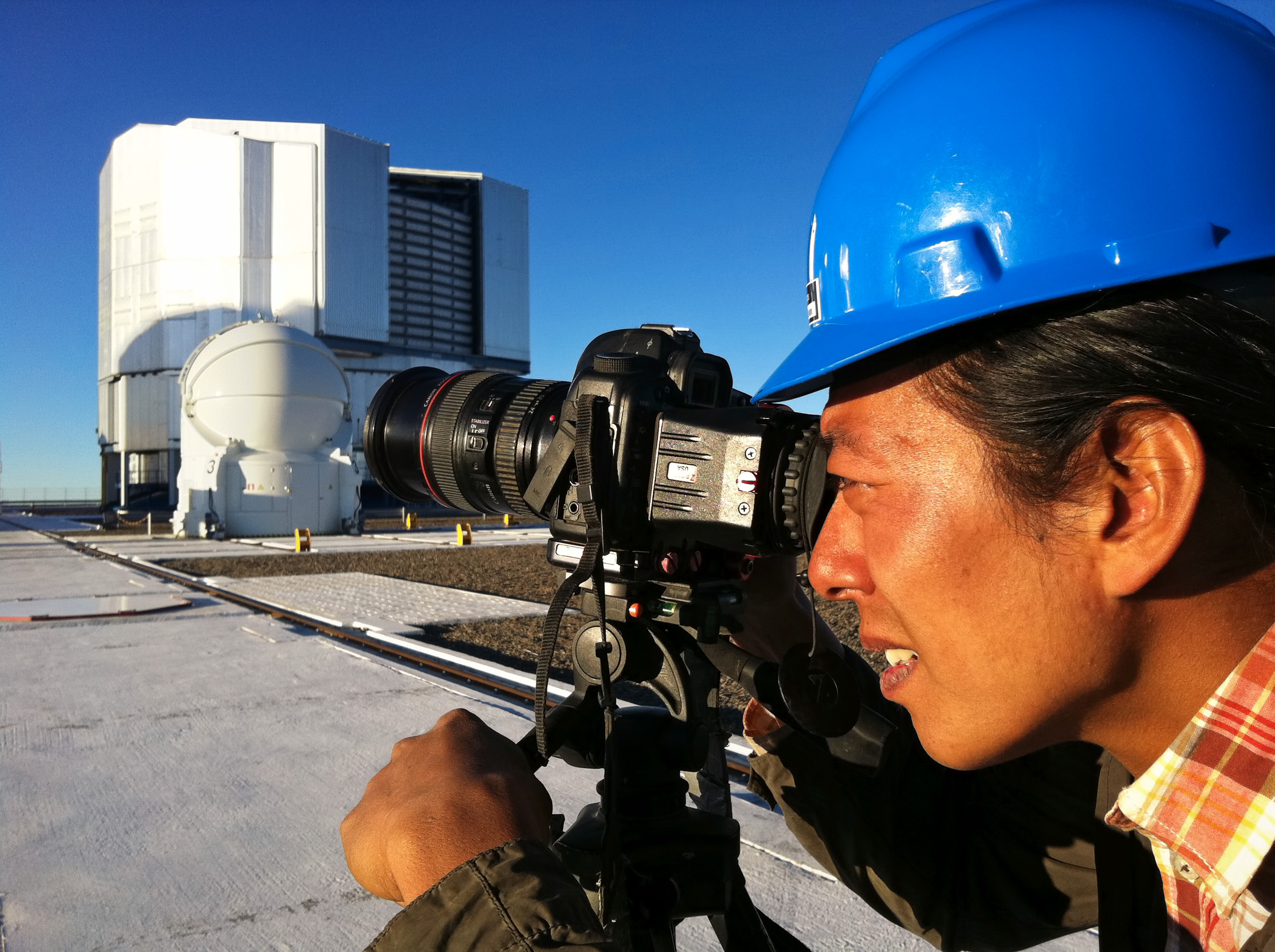 Kyle G. Johnson, the producer and host of the Chinese TV travel series All the Way South, filming at sunset from the Very Large Telescope platform at Cerro Paranal on 5 December 2011.