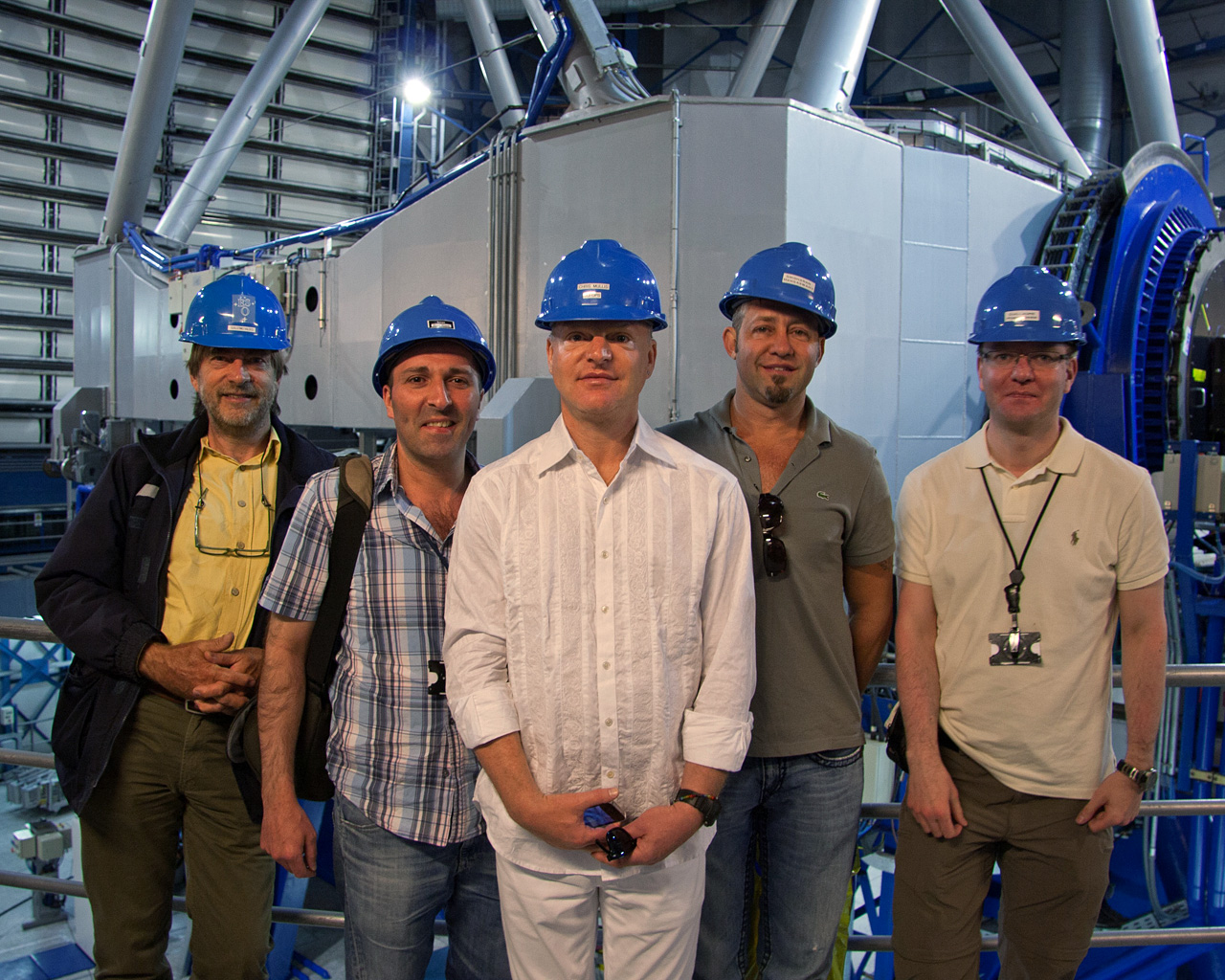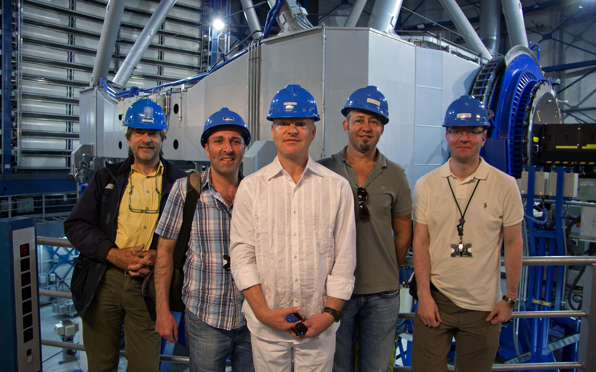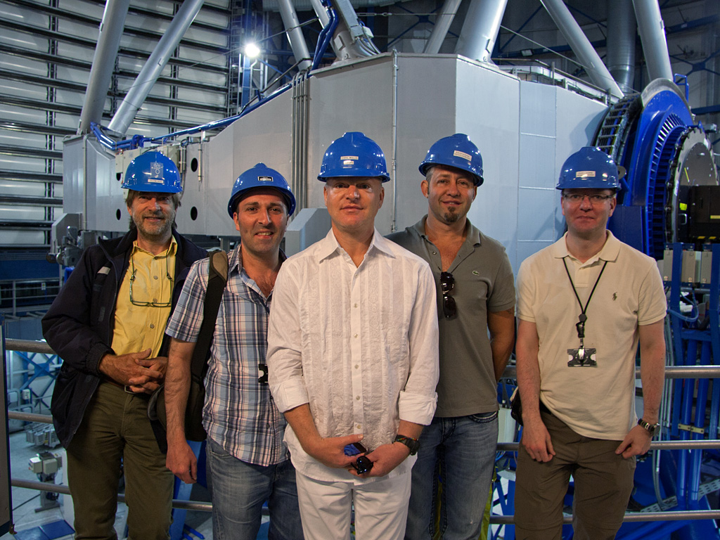 Andy Bell, the lead singer from the British synthpop band Erasure, is seen here with ESO staff in front of one of the Very Large Telescope Unit Telescopes at ESO’s Paranal Observatory in Chile’s Atacama desert. Andy Bell visited Paranal and took this opportunity to shoot an exclusive video Erasure — Fill Us With Fire (ESO 50th Anniversary Exclusive) for his latest single.