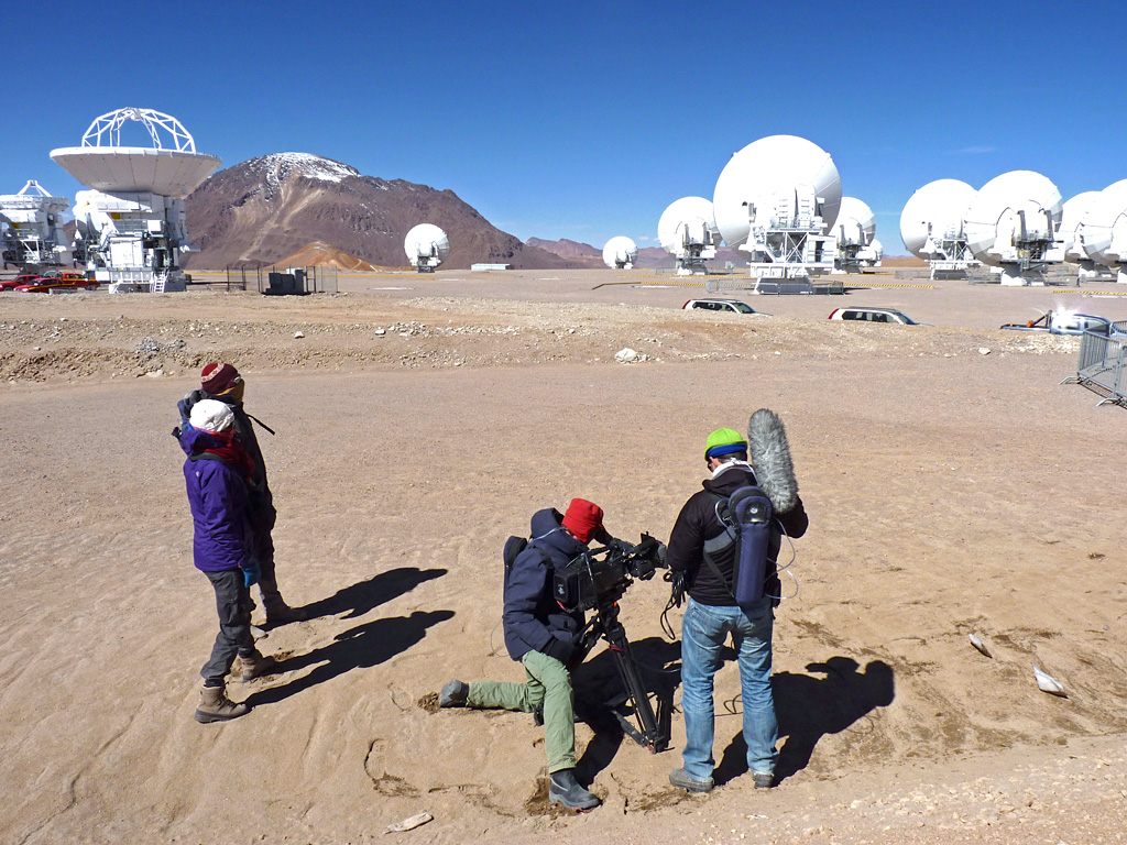 A crew from the Dutch public broadcaster VPRO and the Dutch Research School for Astronomy (NOVA) visited the ALMA Observatory from 1–6 September 2012, to film an episode of the Dutch television science programme Labyrint. The crew is working on the Chajnantor, the site of ALMA, at 5000 metres above sea level. In the background, several antennas clustered around the centre of the ALMA array are visible.