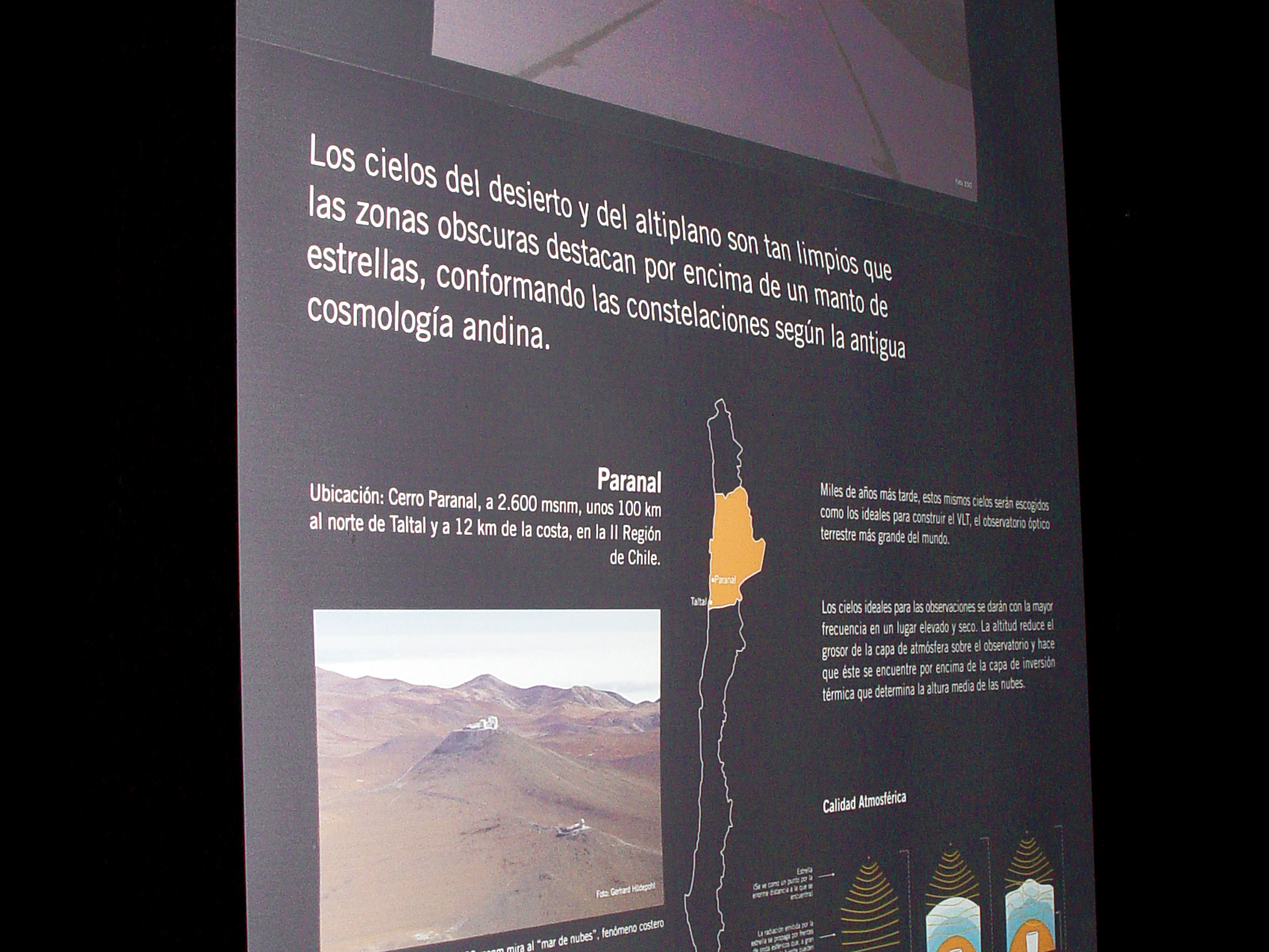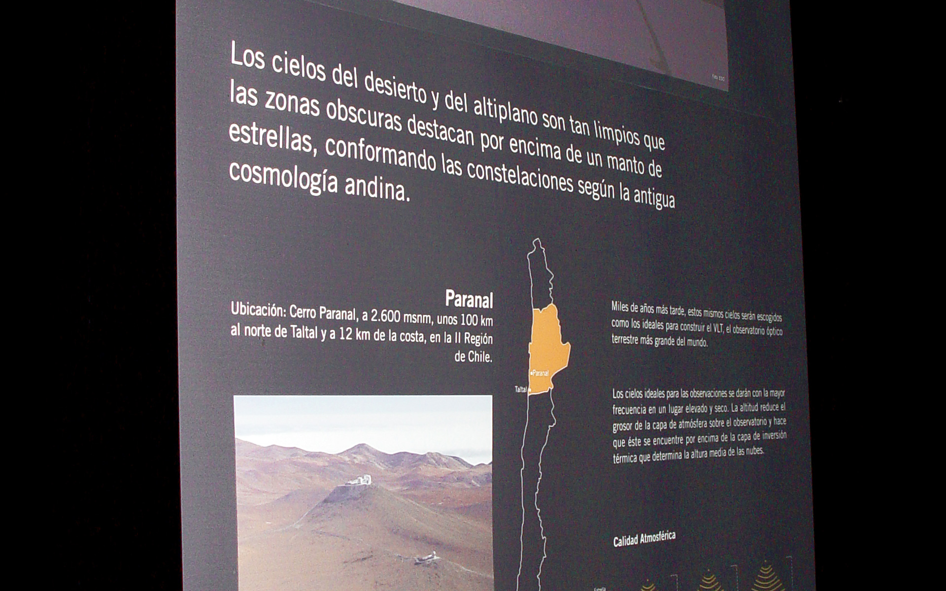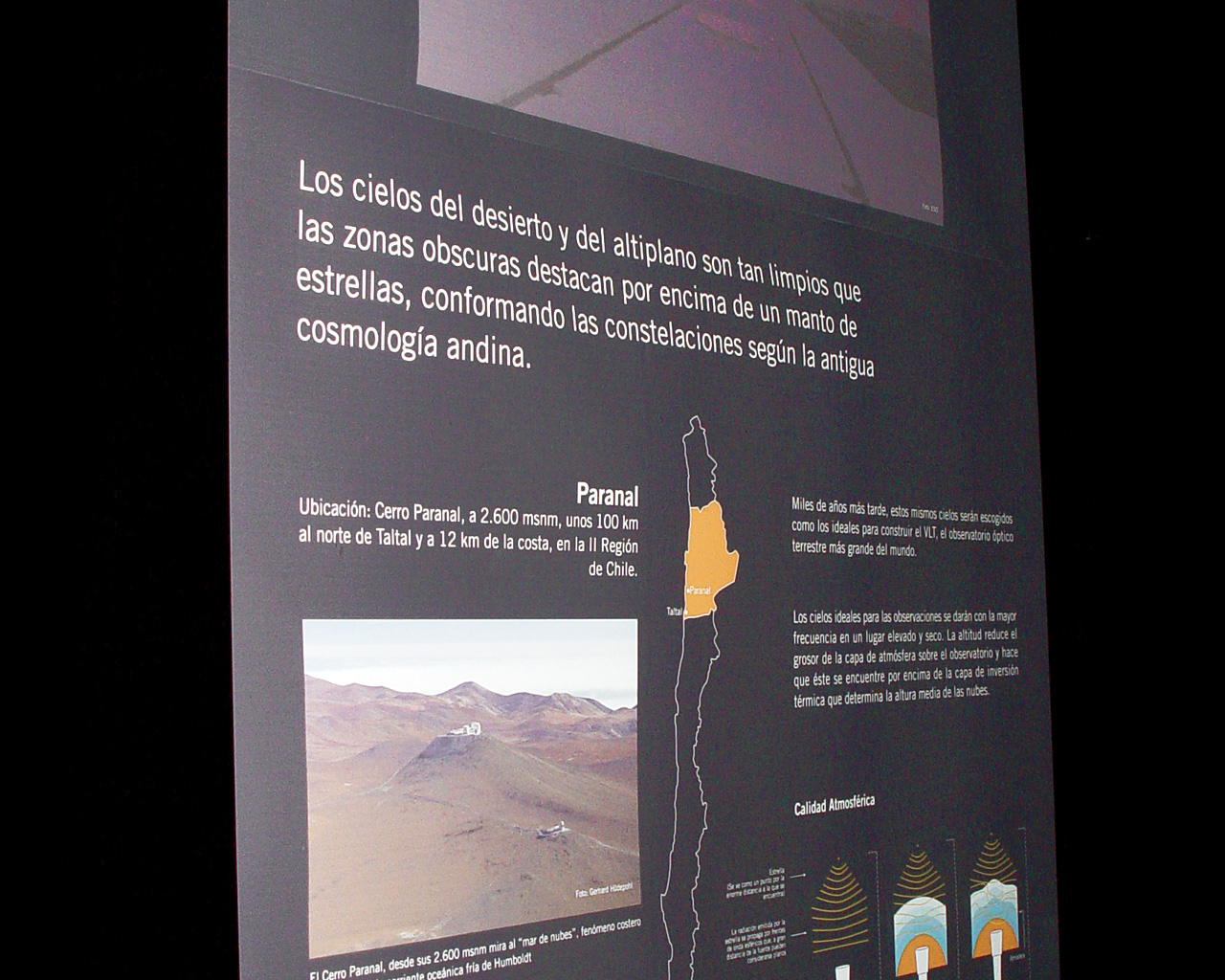ESO permanent exhibition at the Museum Augusto Capdeville in Taltal, the Paranal Observatory’s host municipality, in Chile’s Region II. The exhibition includes six backlit panels and other interactive elements which invite the visitors to discover the Universe and think about the effects of light pollution. It was inaugurated on 12 September 2007, as part of the fruitful cooperation between ESO and the Municipality of Taltal. The panel in the picture explains why the Paranal area is such an excellent site for astronomical observations.