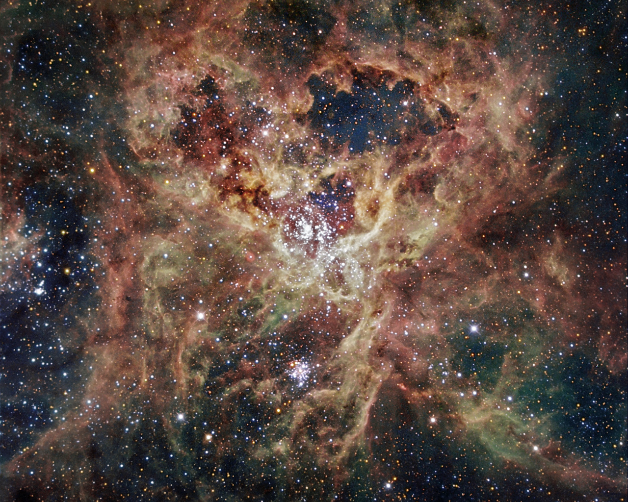 Located inside the Large Magellanic Cloud (LMC) – one of our closest galaxies – in what some describe as a frightening sight, the Tarantula nebula is worth looking at in detail. Also known as 30 Doradus or NGC 2070, the nebula owes its name to the arrangement of its bright patches that somewhat resemble the legs of a tarantula. Taking the name of one of the biggest spiders on Earth is very fitting in view of the gigantic proportions of this celestial nebula — it measures nearly 1,000 light years across ! Its proximity, the favourable inclination of the LMC, and the absence of intervening dust make this nebula one of the best laboratories to better understand the formation of massive stars. This spectacular nebula is energised by an exceptionally high concentration of massive stars, often referred to as super star clusters. This image is based on data acquired with the 1.5 m Danish telescope at the ESO La Silla Observatory in Chile, through three filters (B: 80 s, V: 60 s, R: 50 s).
