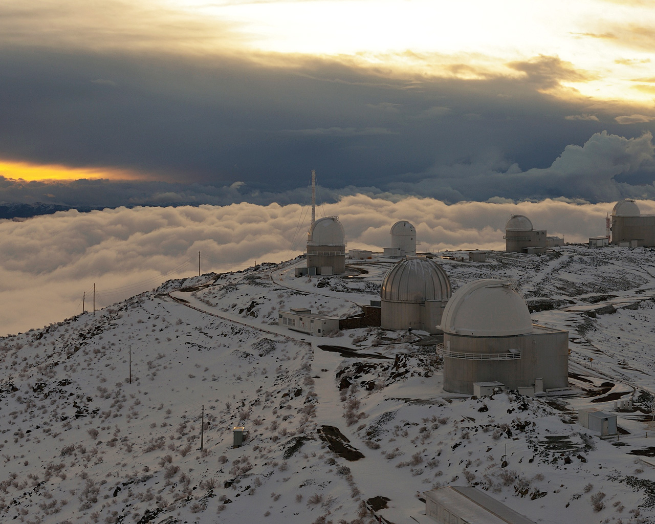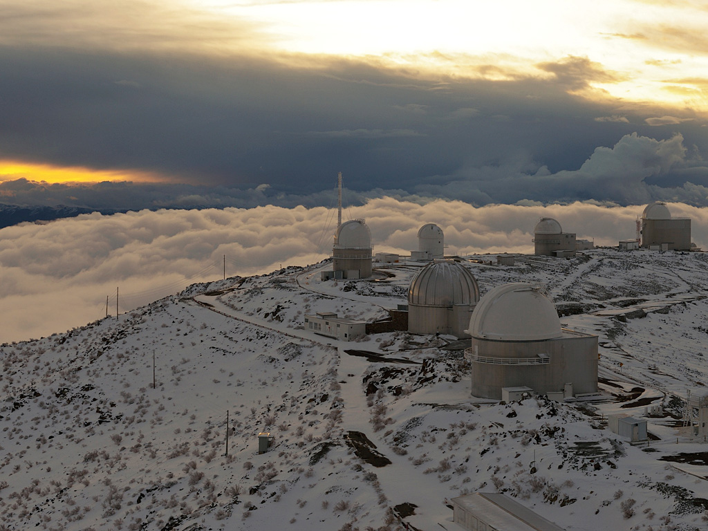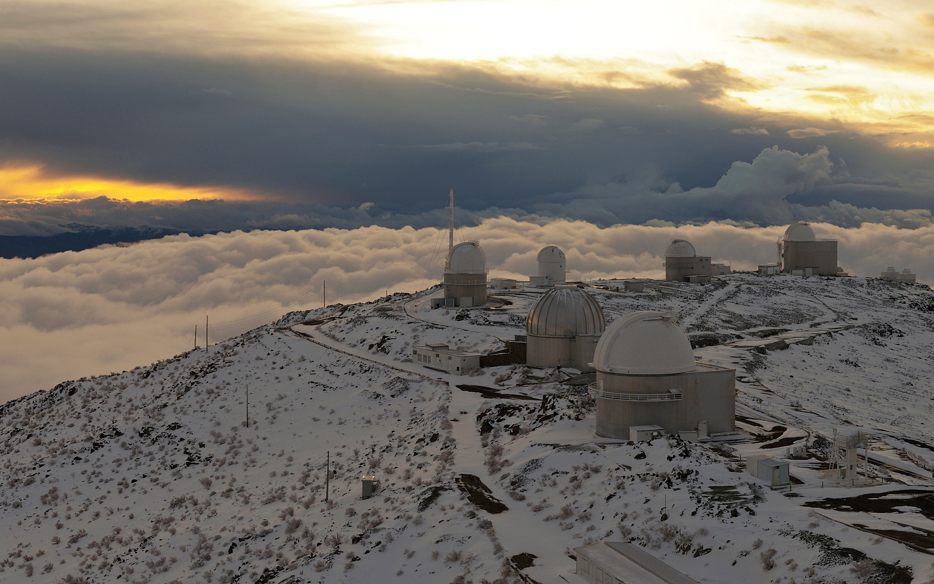 The stunning sight of La Silla Observatory after a snow storm. High up in the Atacama desert, above the clouds, you can see the clouds sprawl around this site of astronomical observation.