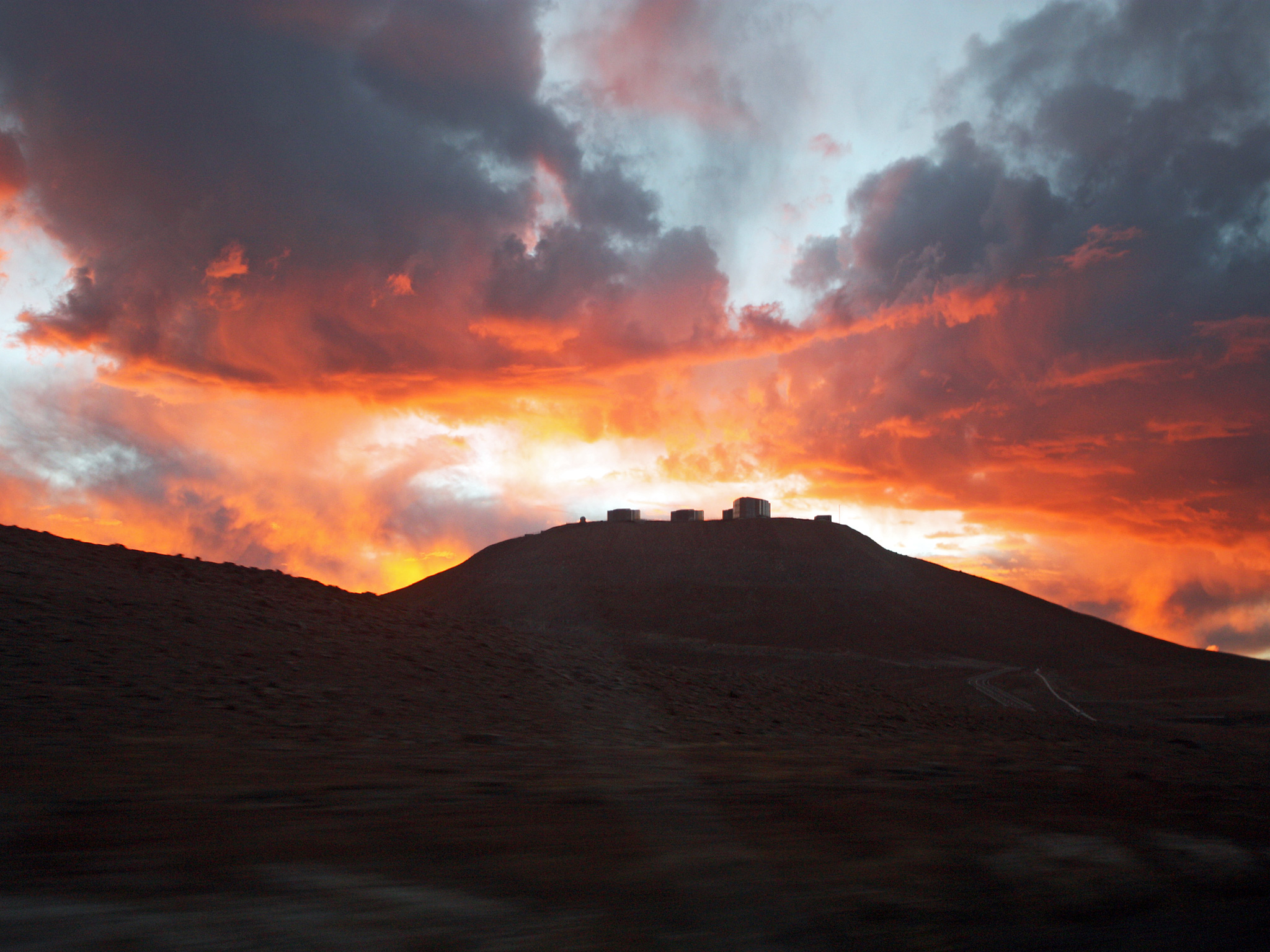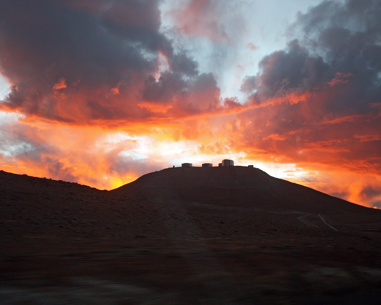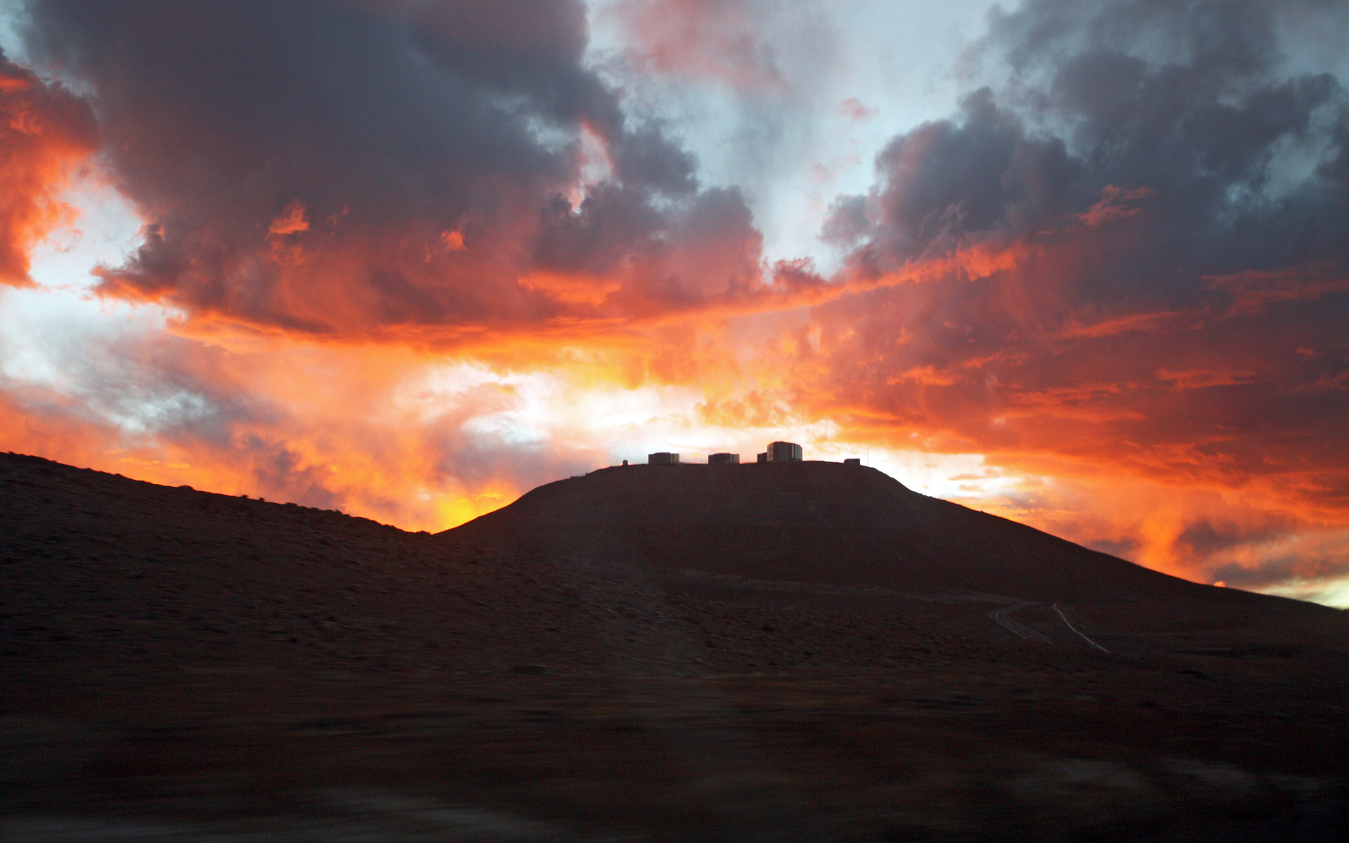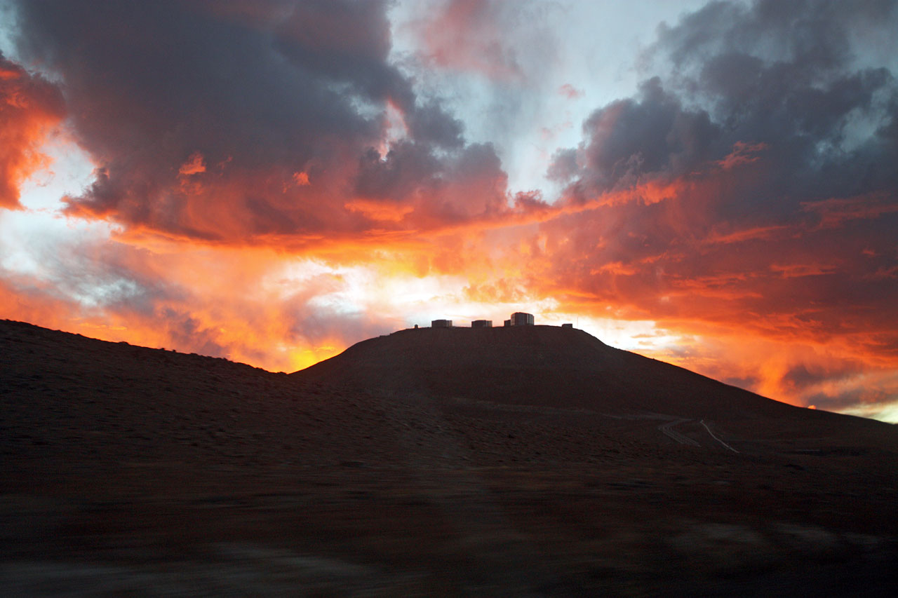 The Very Large Telescope (VLT) atop the 2600-metre-high Cerro Paranal is silhouetted by the sky at sunset.