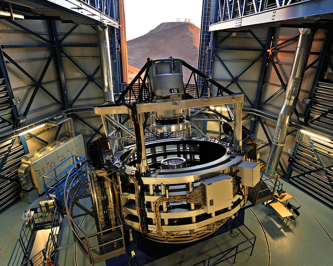 This spectacular view of the VISTA telescope was taken from the roof of the building during the opening of the enclosure at sunset. The VLT is visible on the neighbouring mountain. VISTA is the largest survey telescope in the world and it is dedicated to mapping the sky at near-infrared wavelengths. Its primary mirror is 4.1 metres in diameter and is the most highly curved of its size. The extremely high curvature reduces the focal length, making the structure of the telescope extremely compact. VISTA can map large areas of the sky quickly and deeply.