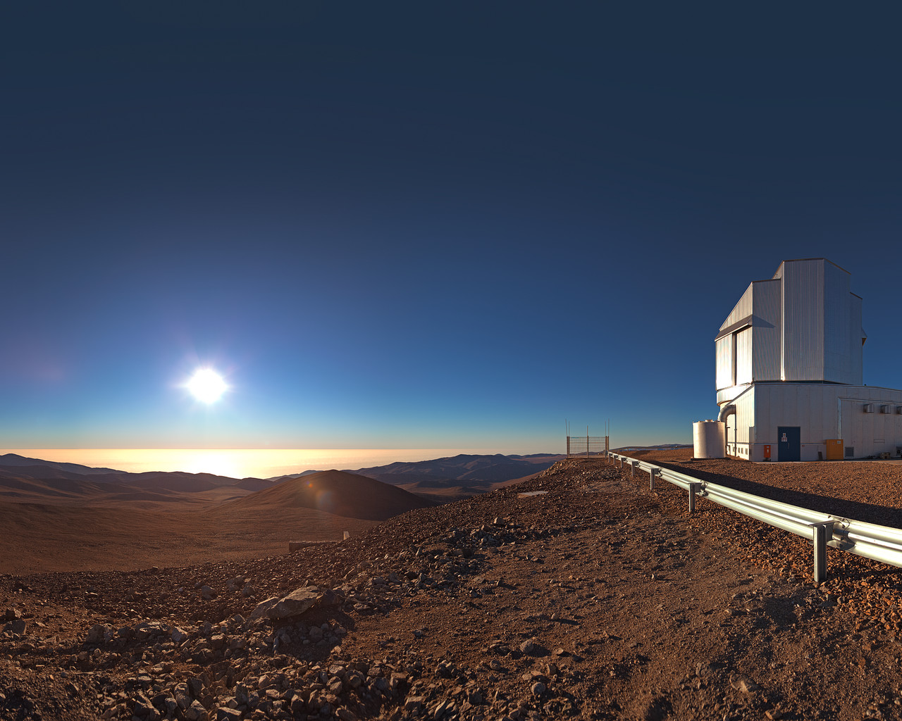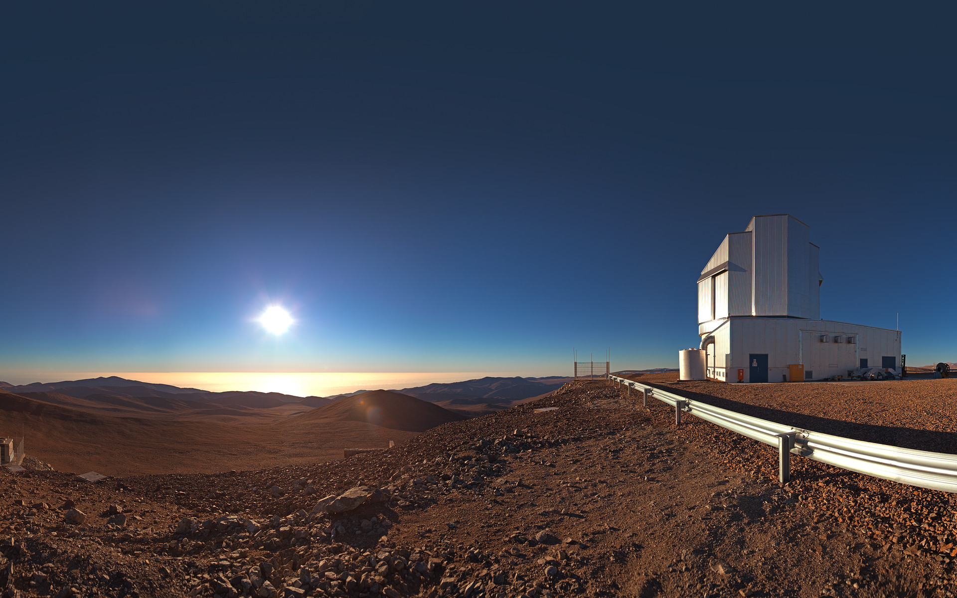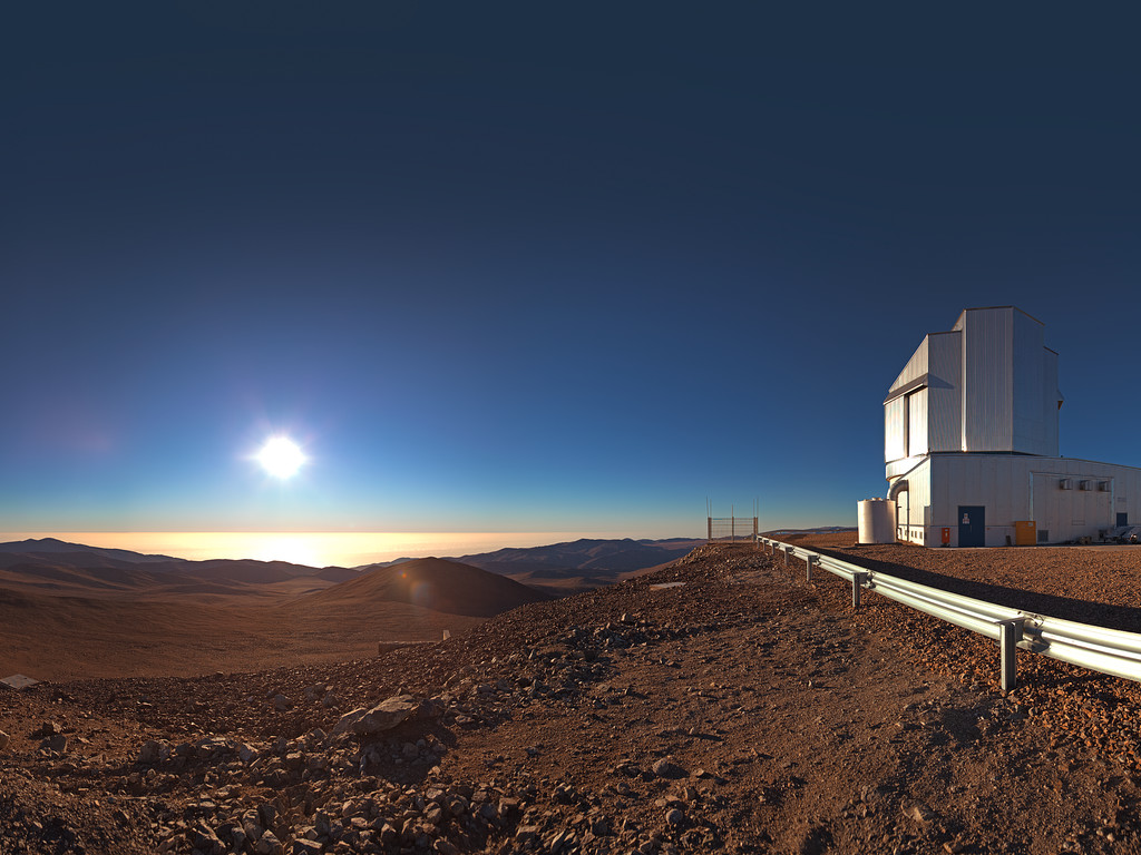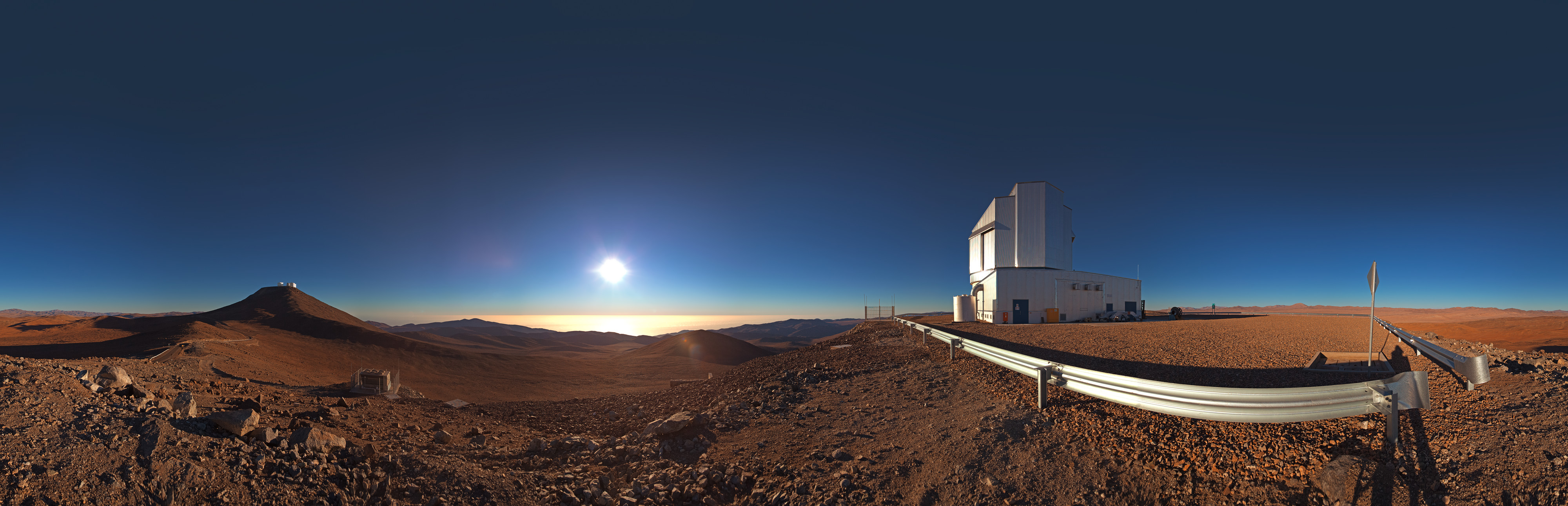 Panorama of the view from Paranal Observatory. The telescope to the right is the Visible and Infrared Survey Telescope for Astronomy (VISTA). VISTA is a wide-field telescope designed for performing a series of very broad surveys of the sky in infrared light. Thanks to its fairly large primary mirror, with a diameter of 4 metres, these surveys will show quite faint objects. The goal of these surveys is to create large catalogues of celestial objects for statistical studies and to identify new targets for the VLT.