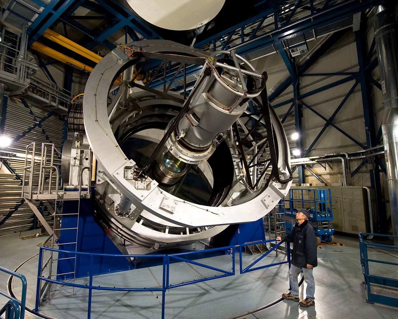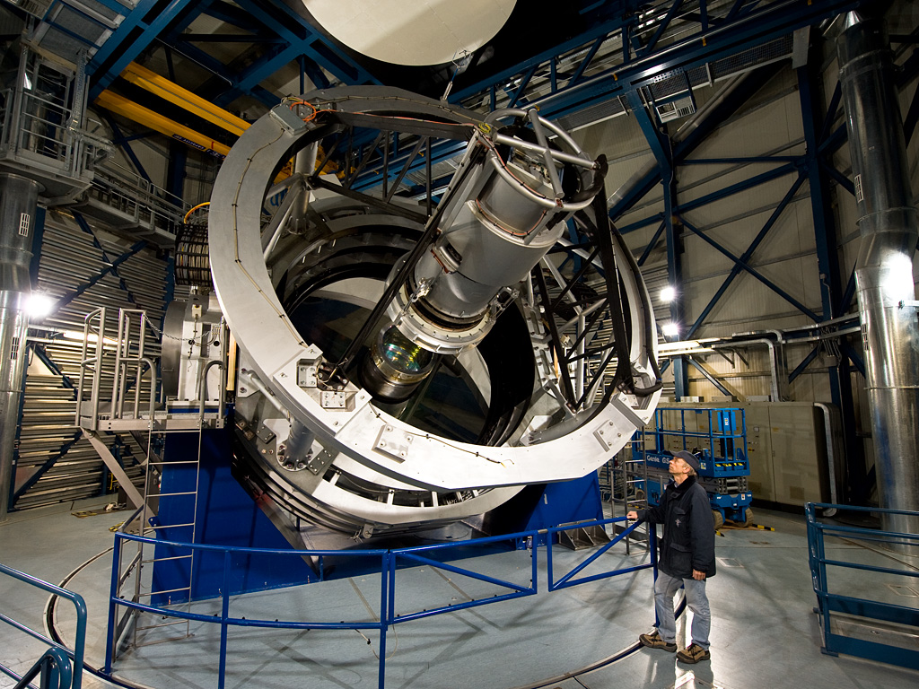 The Paranal engineer Gerhard Hüdepohl checks the VISTA telescope. VISTA is the largest telescope in the world dedicated to surveying the sky and has a huge camera sensitive to near-infrared wavelengths. Its primary mirror is 4.1 metres in diameter and is the most highly curved of its size. The extremely high curvature reduces the focal length, making the structure of the telescope extremely compact. This design enables VISTA to map large areas of the sky quickly and deeply.