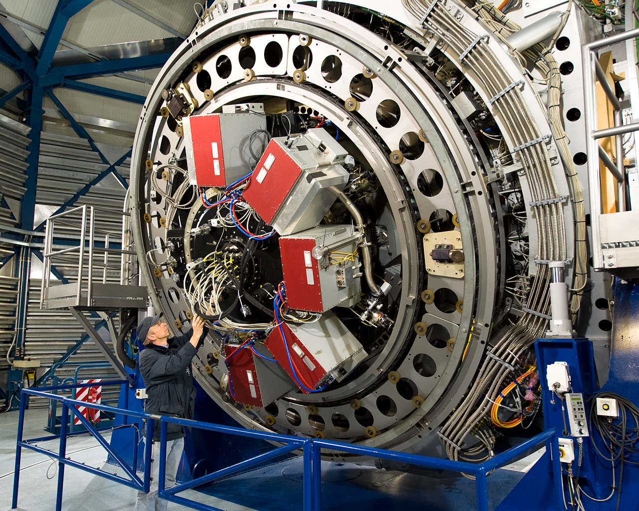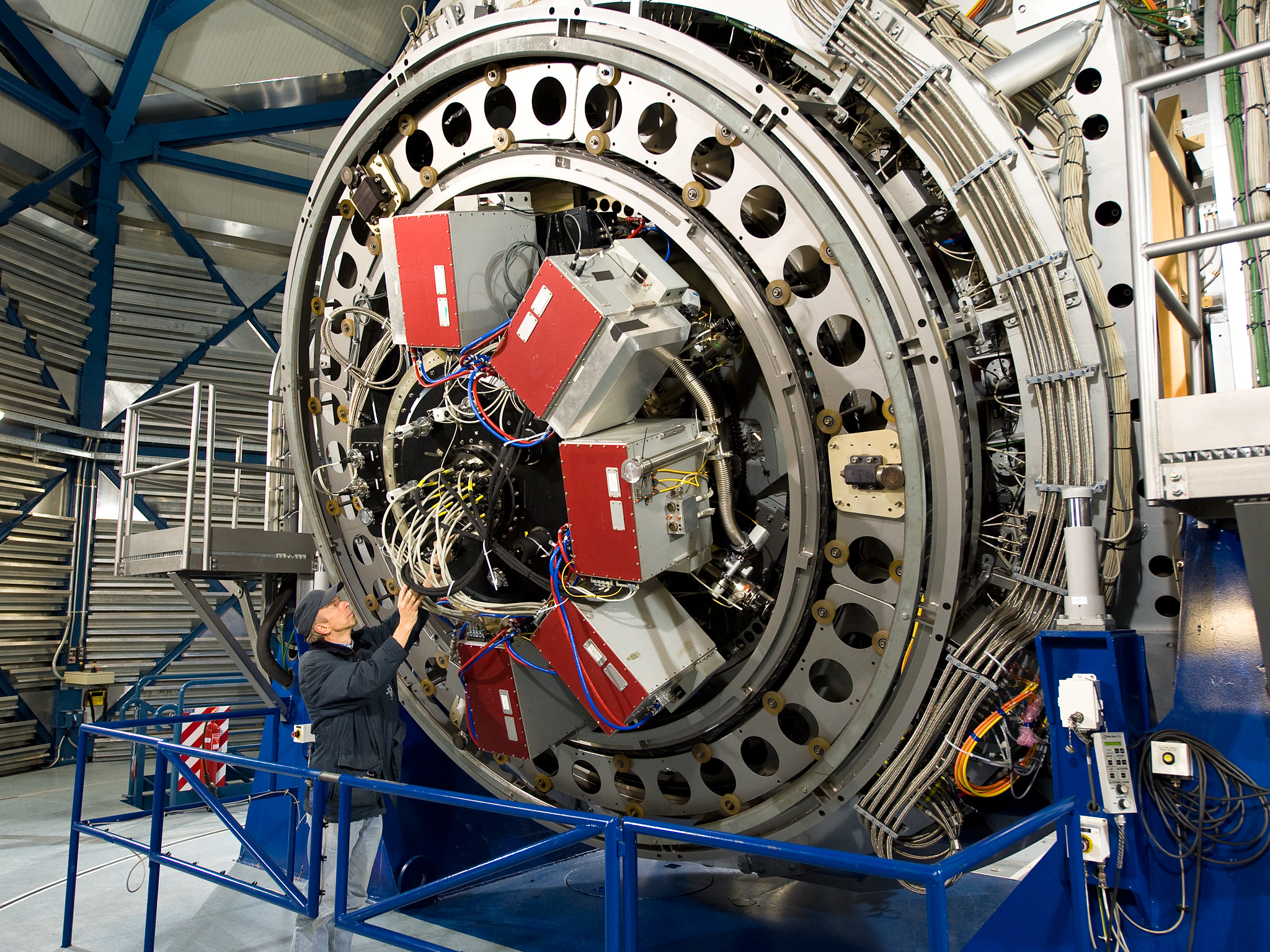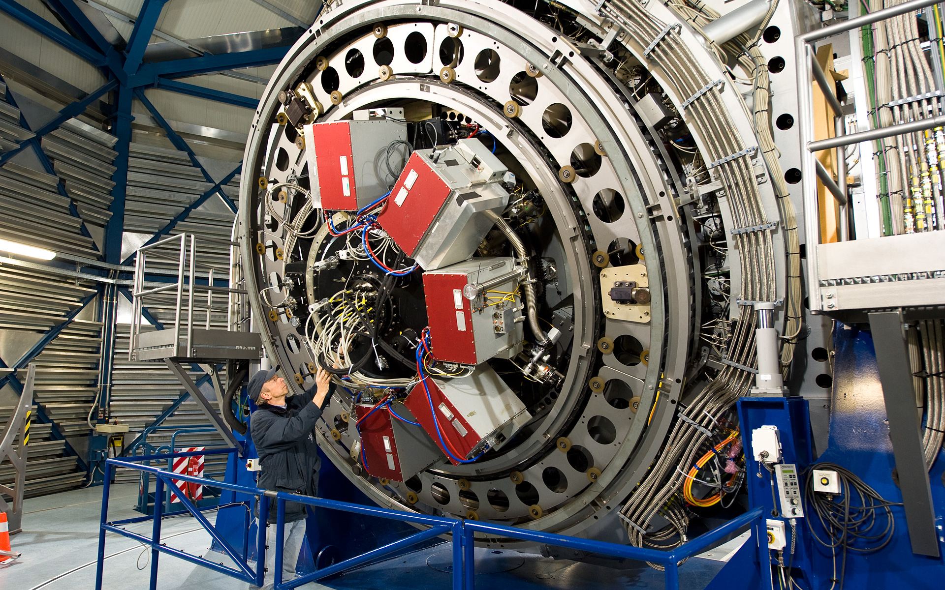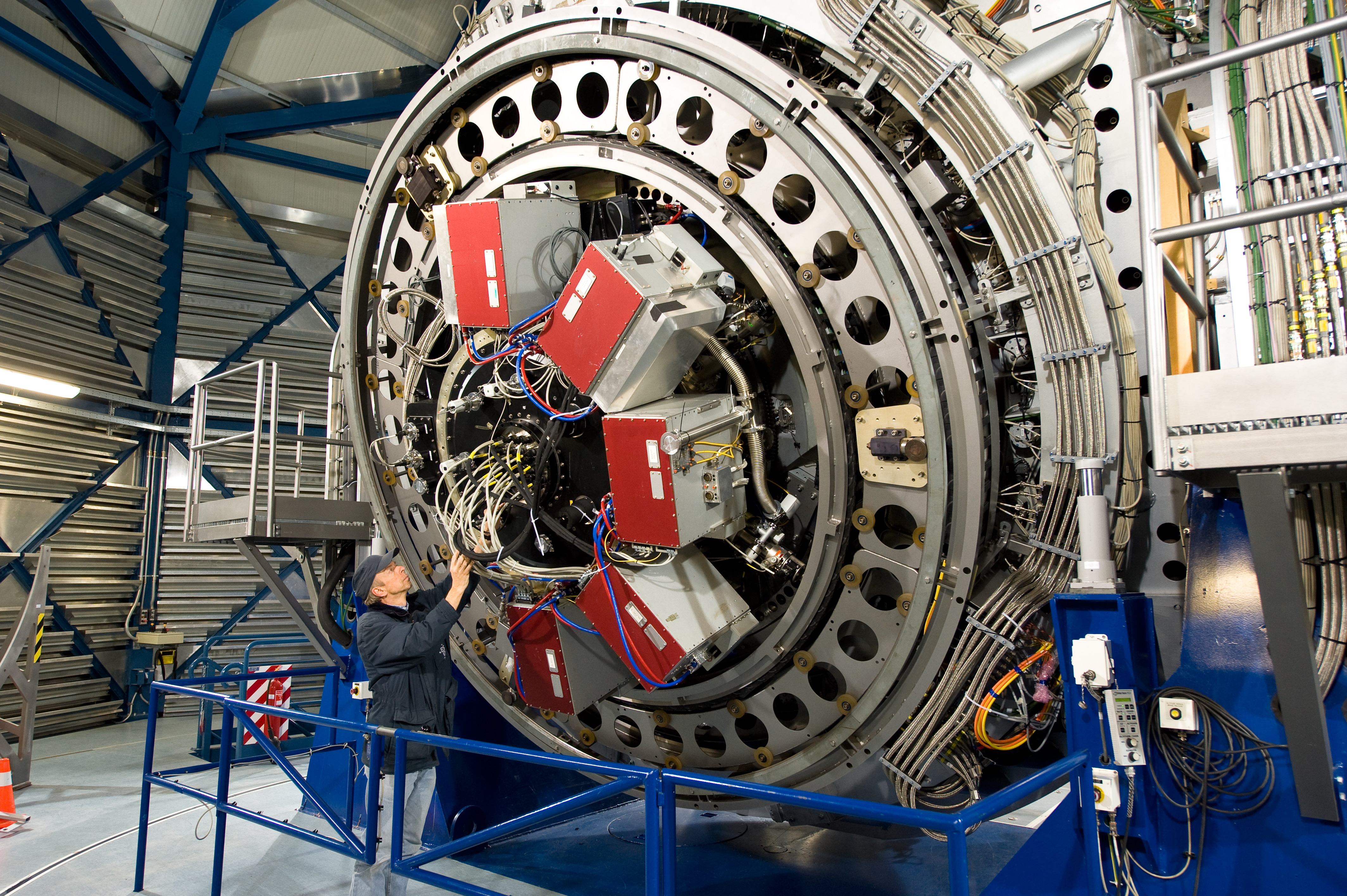 The Paranal engineer Gerhard Hüdepohl checks the huge camera attached at the Cassegrain focus of VISTA, directly below the cell of the main mirror. VISTA´s powerful eye is a 3-tonne camera containing 16 special detectors sensitive to infrared light with a combined total of 67 megapixels. It will have widest coverage of any astronomical near-infrared camera. VISTA is the largest telescope in the world dedicated to surveying the sky at near-infrared wavelengths.