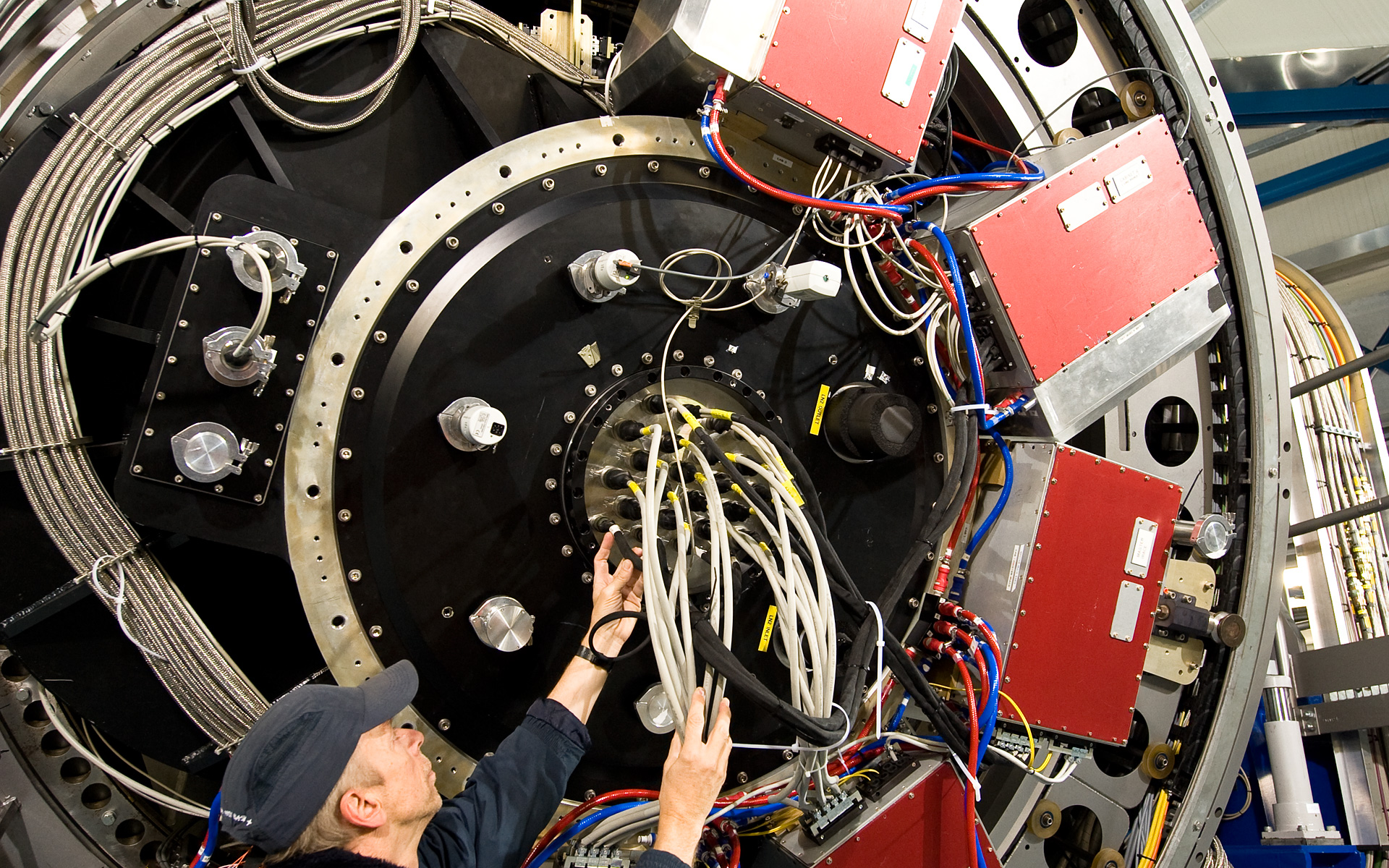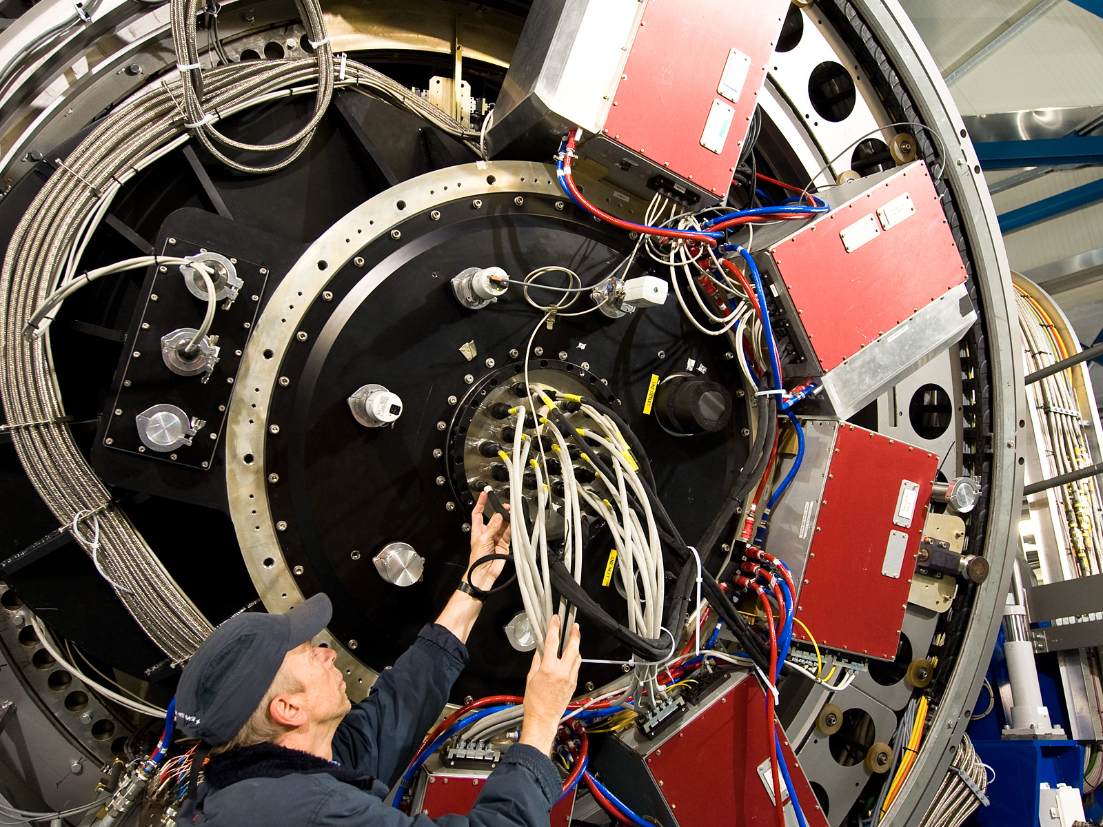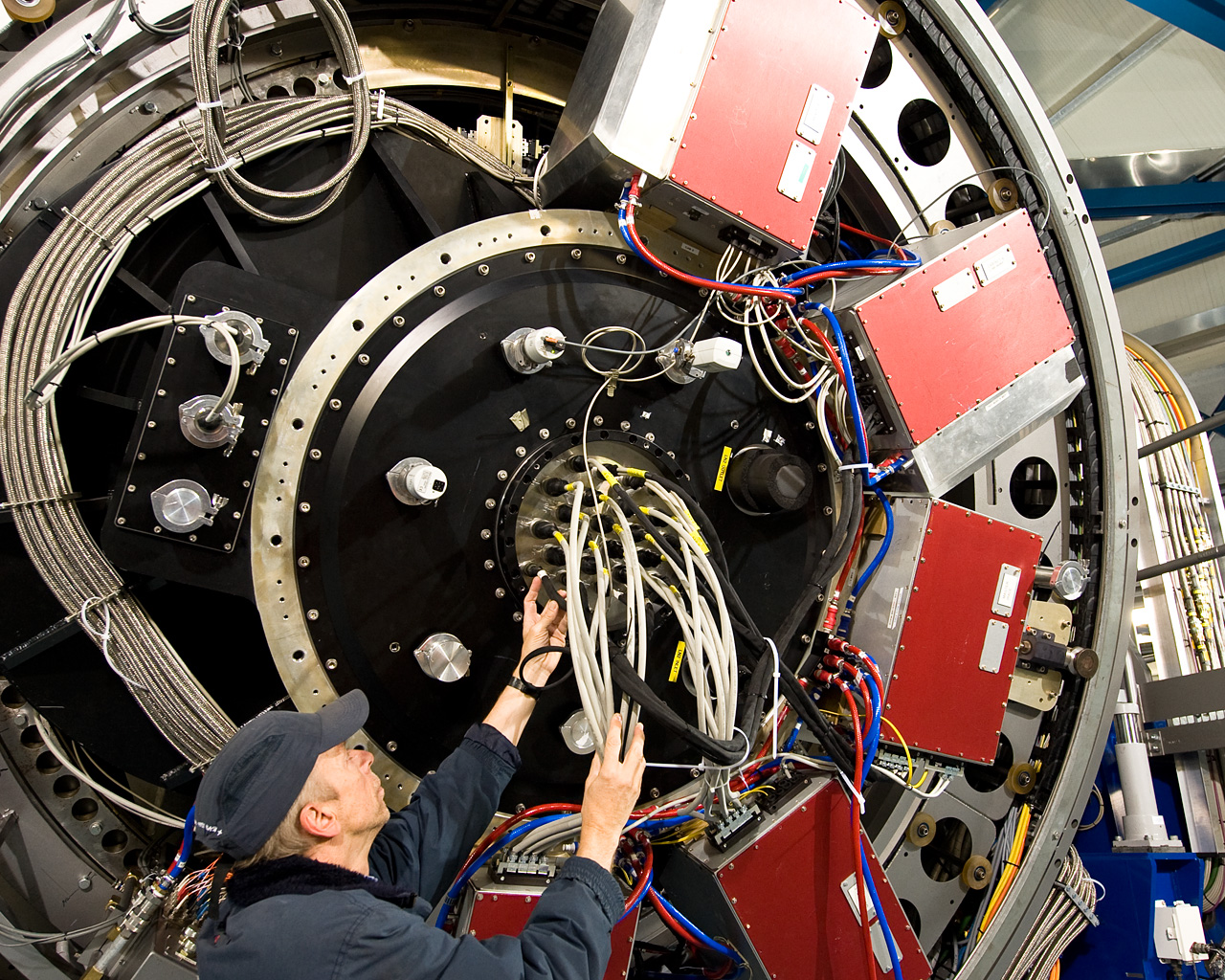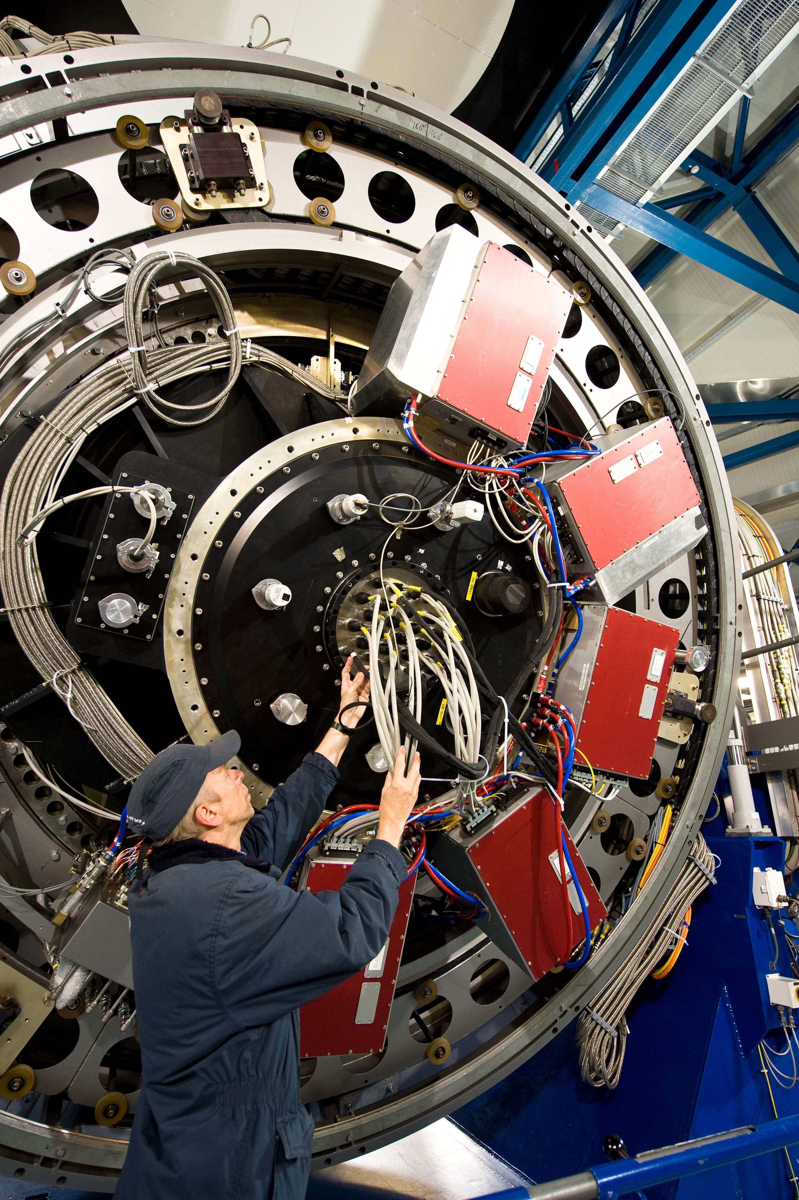 The Paranal engineer Gerhard Hüdepohl checks the huge camera at the Cassegrain focus of VISTA, directly below the cell of the main mirror. The VISTA´s powerful eye is a 3-tonne camera containing 16 special detectors sensitive to infrared light with a combined total of 67 megapixels. It has the widest coverage of any astronomical near-infrared camera. VISTA is the largest telescope in the world dedicated to surveying the sky.