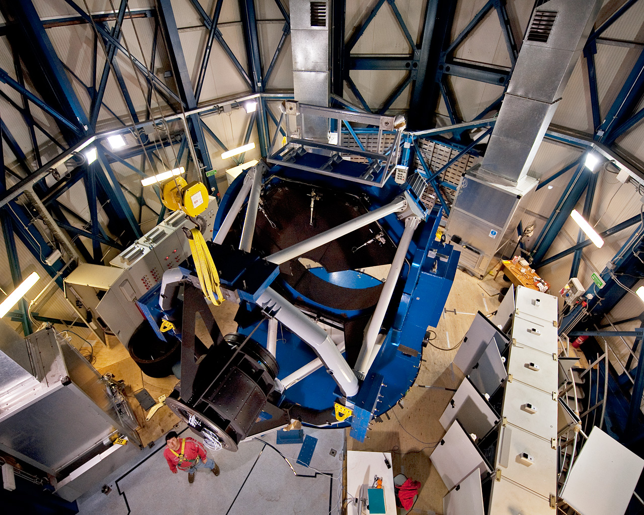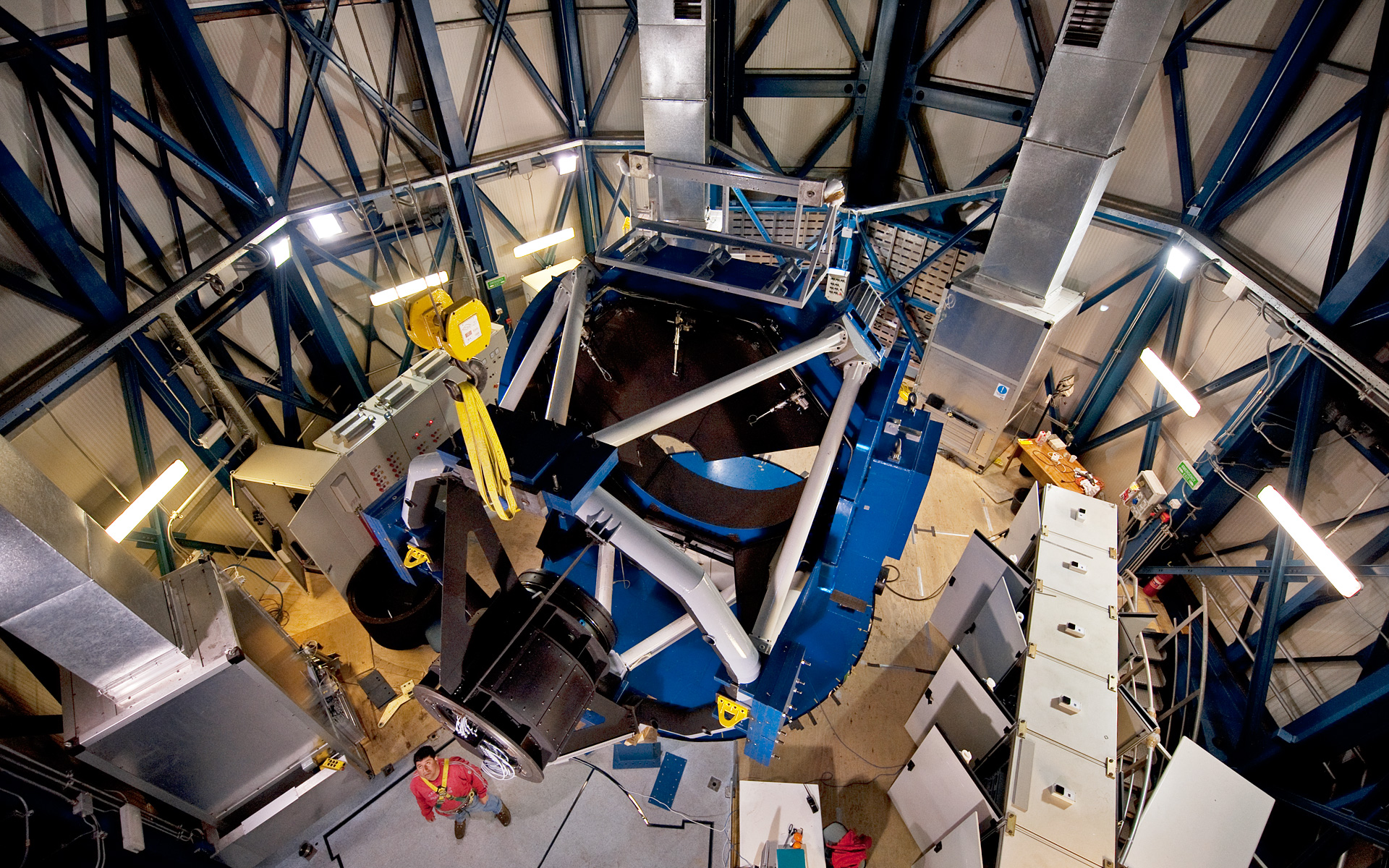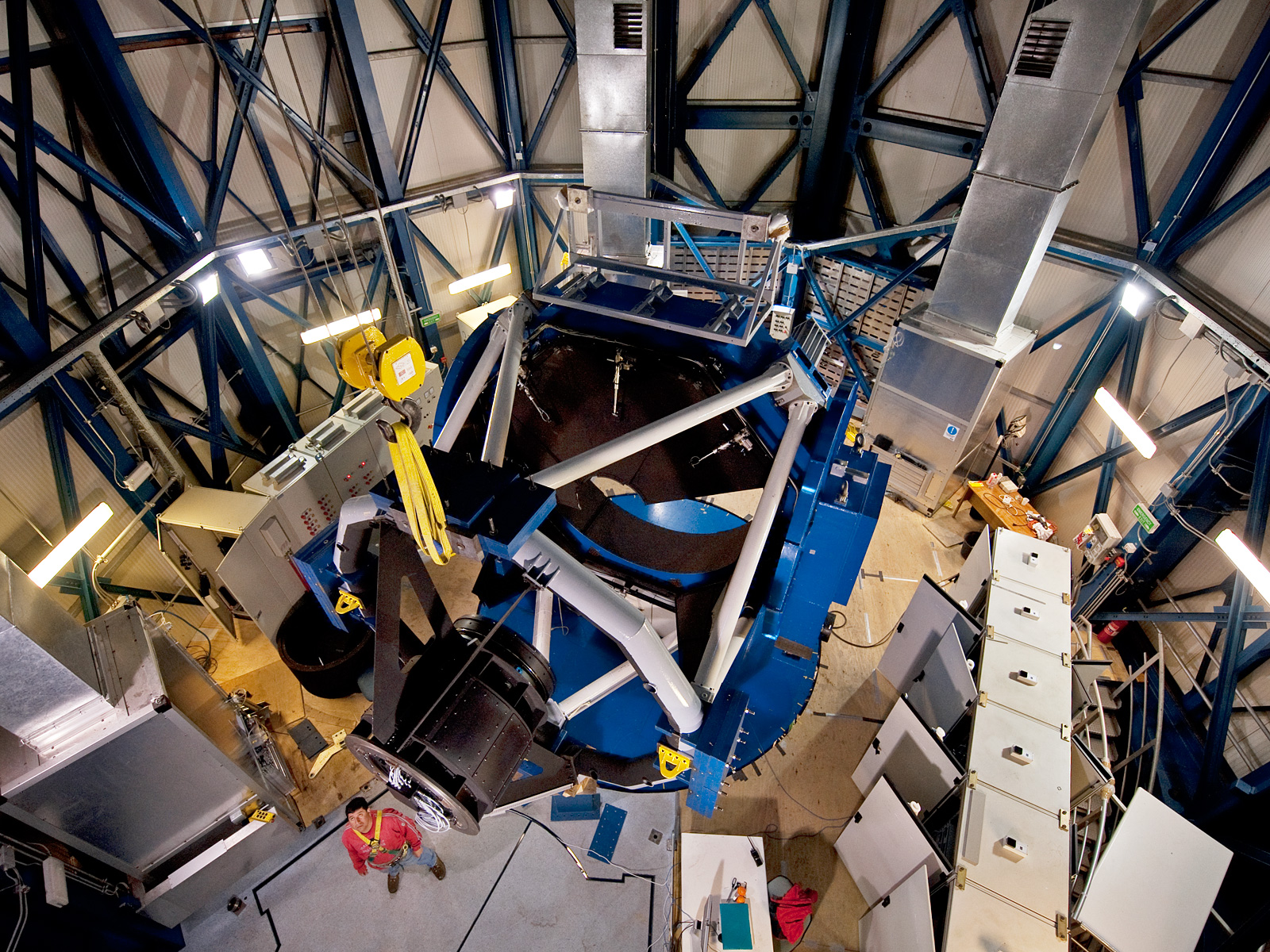 Wide-angle view of the VLT Survey Telescope (VST) taken from the top of its enclosure. The structure of the telescope is ready to receive its "eye", a 2.6-metre-diameter mirror. The VST will be equipped with a 256-megapixel camera, OmegaCam, with a field of view four times the area of the full Moon. Together with the VISTA infrared survey telescope, located on a peak near Cerro Paranal, the VST will produce far more data every night than all the other instruments of the VLT combined — a total of more than 100 terabytes of data per year.