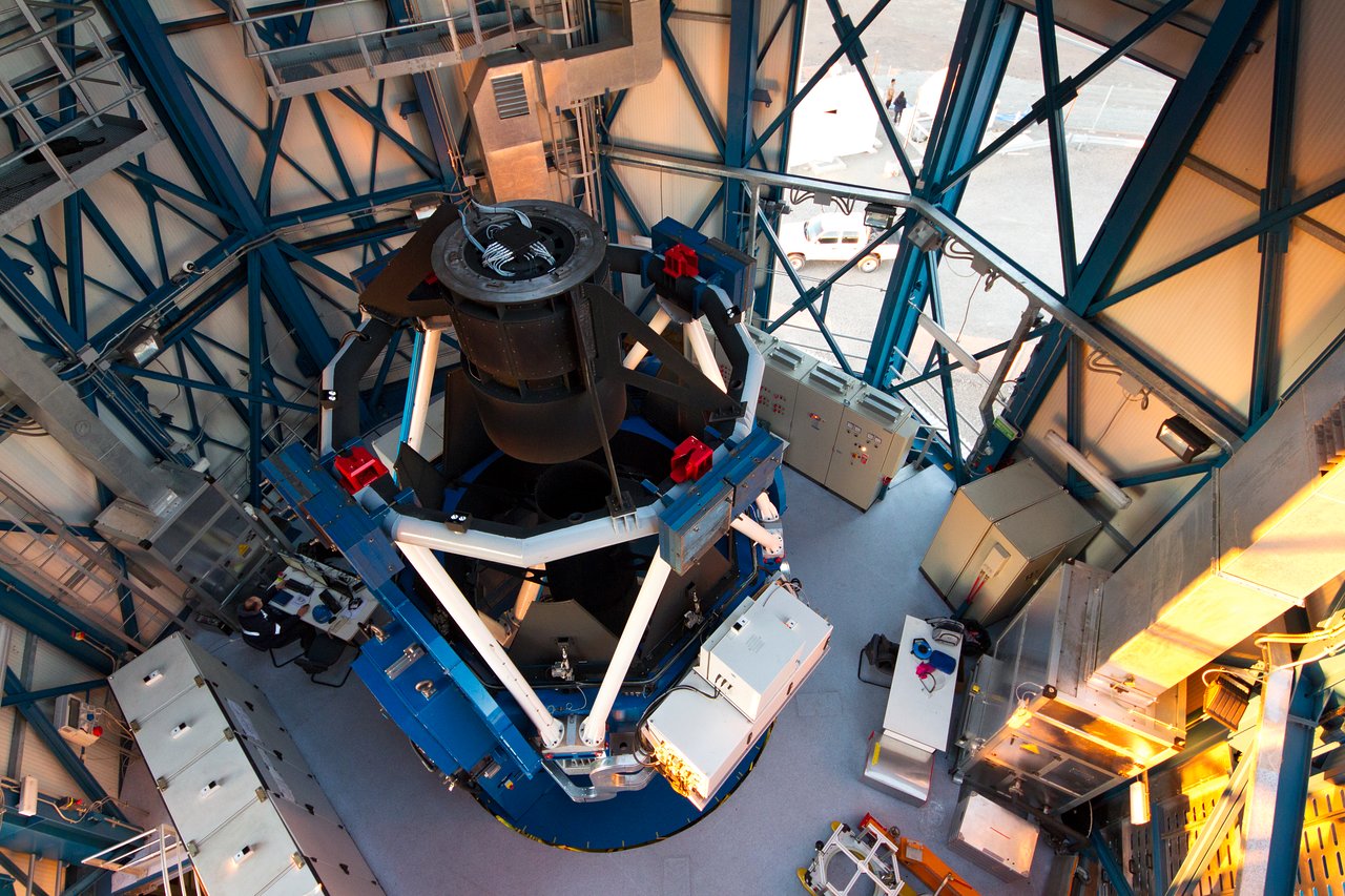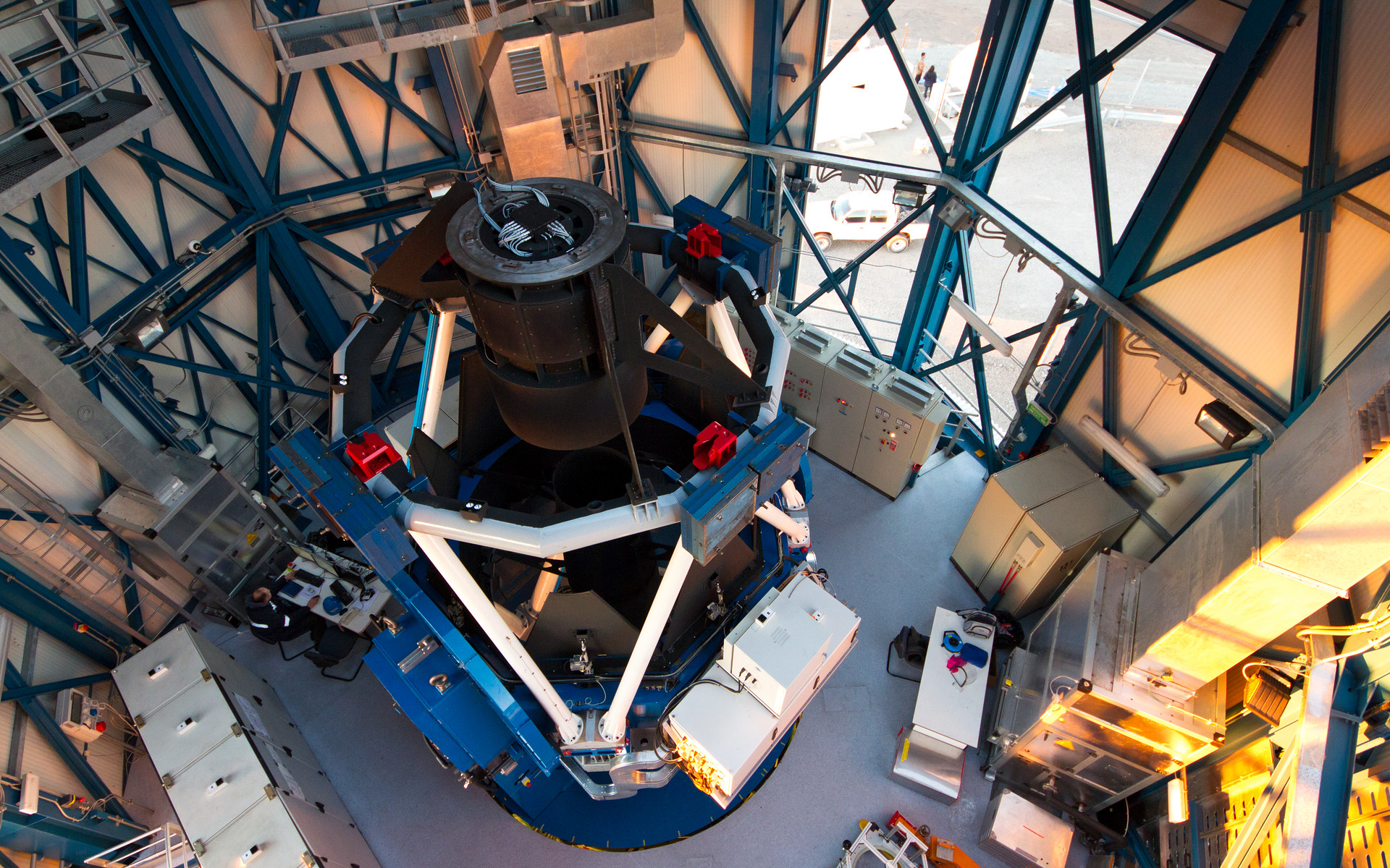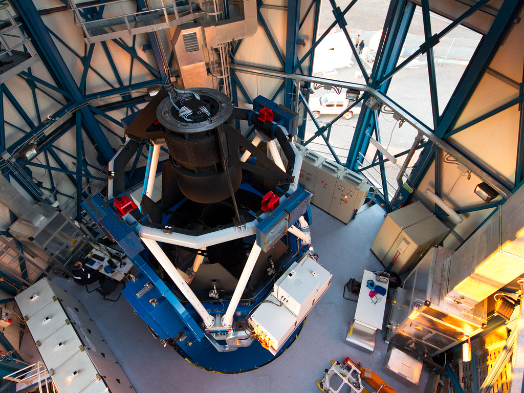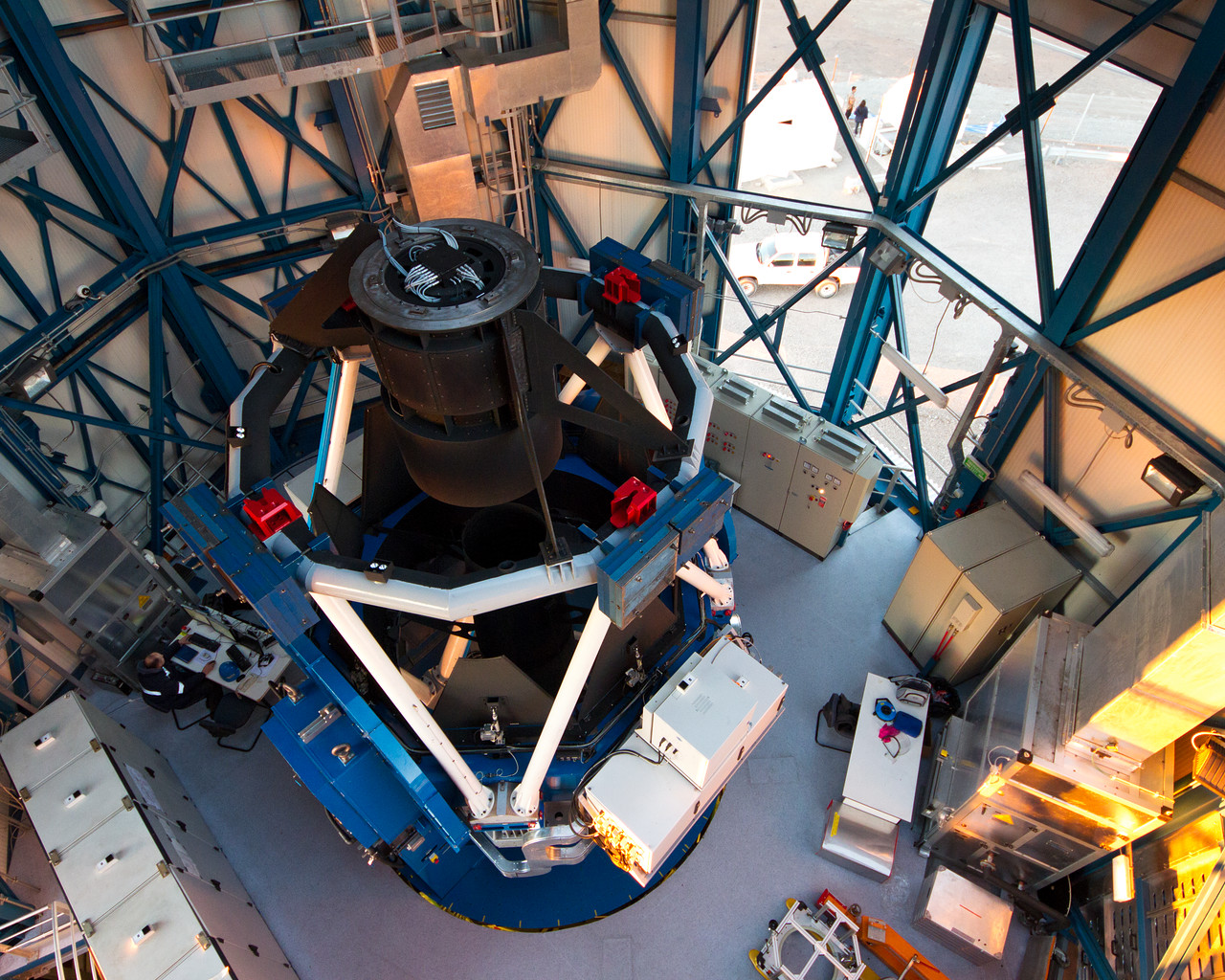 The VLT Survey Telescope (VST) at Cerro Paranal. The VST is a state-of-the-art 2.6-metre telescope equipped with OmegaCAM, a monster 268 megapixel CCD camera with a field of view four times the area of the full Moon. It will survey the visible-light sky. The VST is the result of a joint venture between ESO and the Capodimonte Astronomical Observatory (OAC) of Naples, a research centre of the Italian National Institute for Astrophysics (INAF).