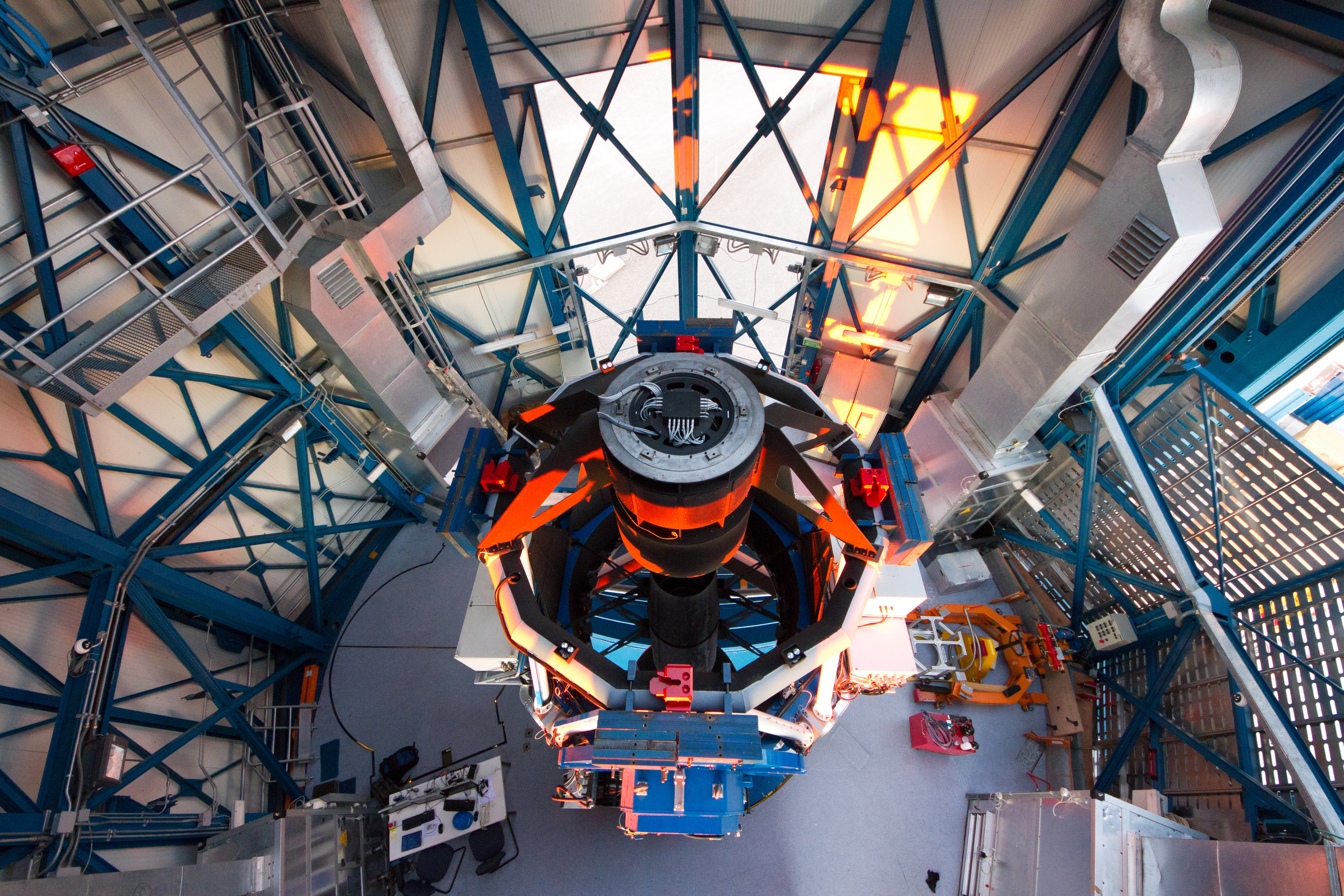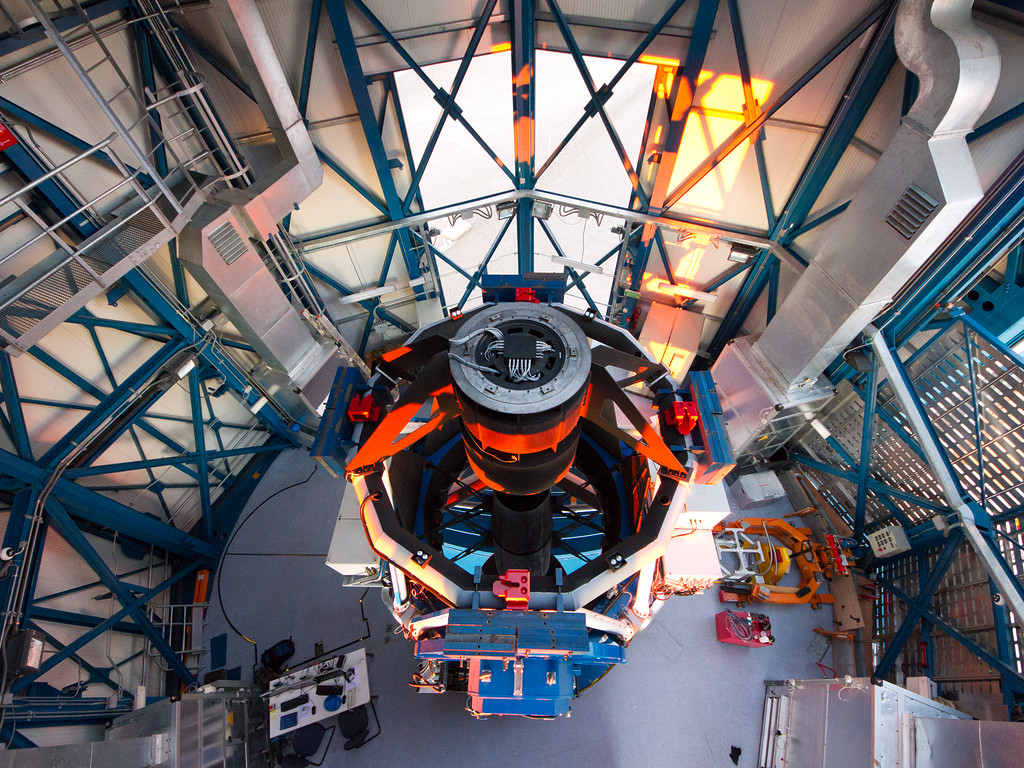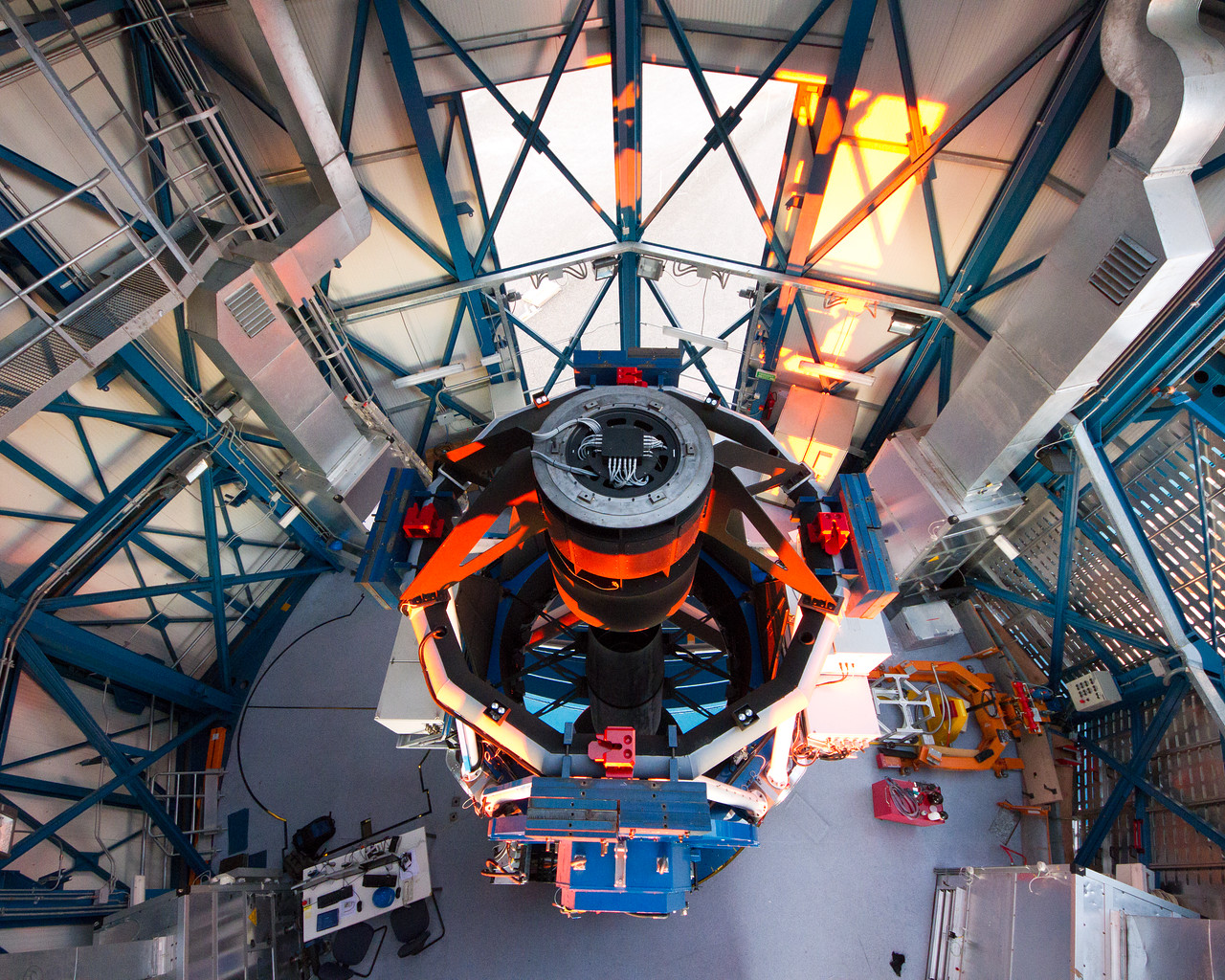 The VLT Survey Telescope (VST) at Cerro Paranal. The VST is a state-of-the-art 2.6-metre telescope equipped with OmegaCAM, a monster 268 megapixel CCD camera with a field of view four times the area of the full Moon. It will survey the visible-light sky. The VST is the result of a joint venture between ESO and the Capodimonte Astronomical Observatory (OAC) of Naples, a research centre of the Italian National Institute for Astrophysics (INAF).