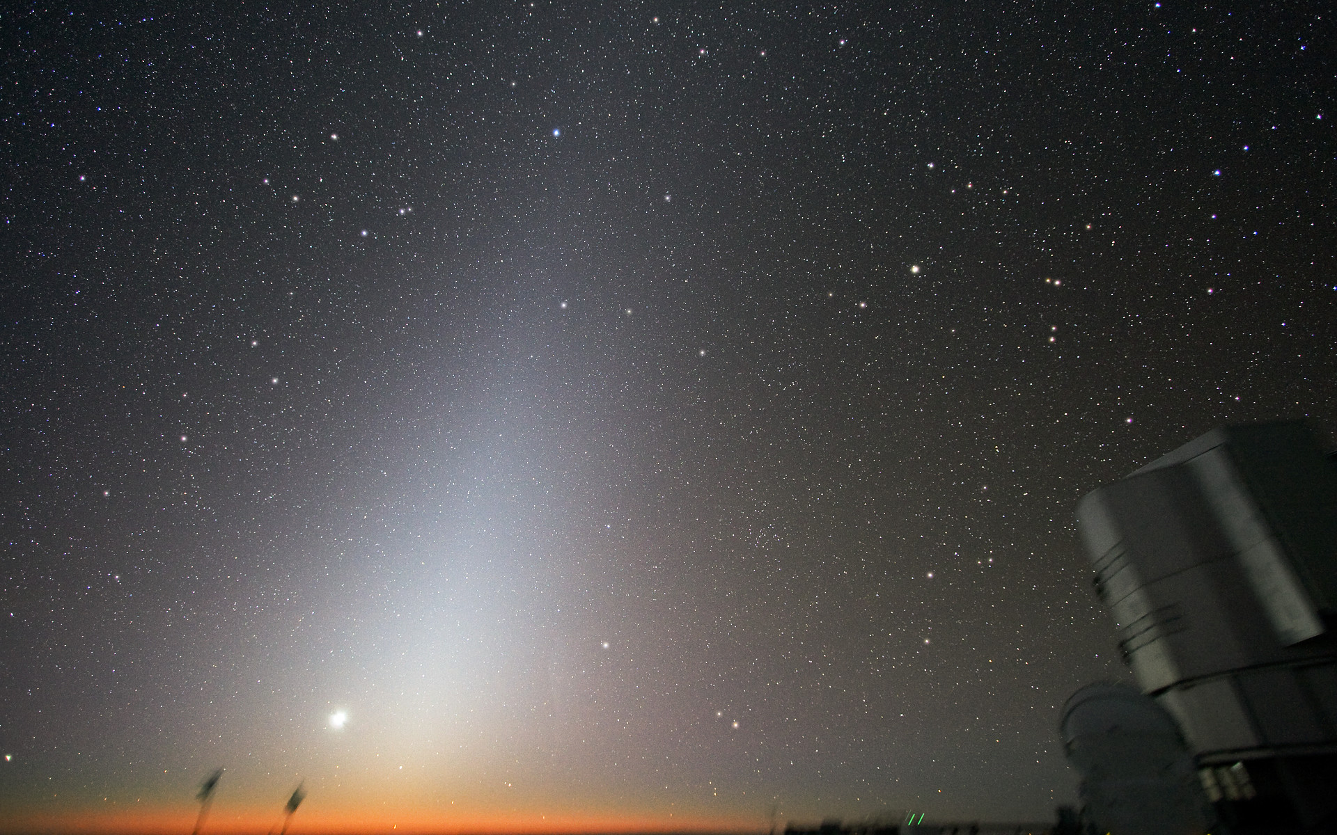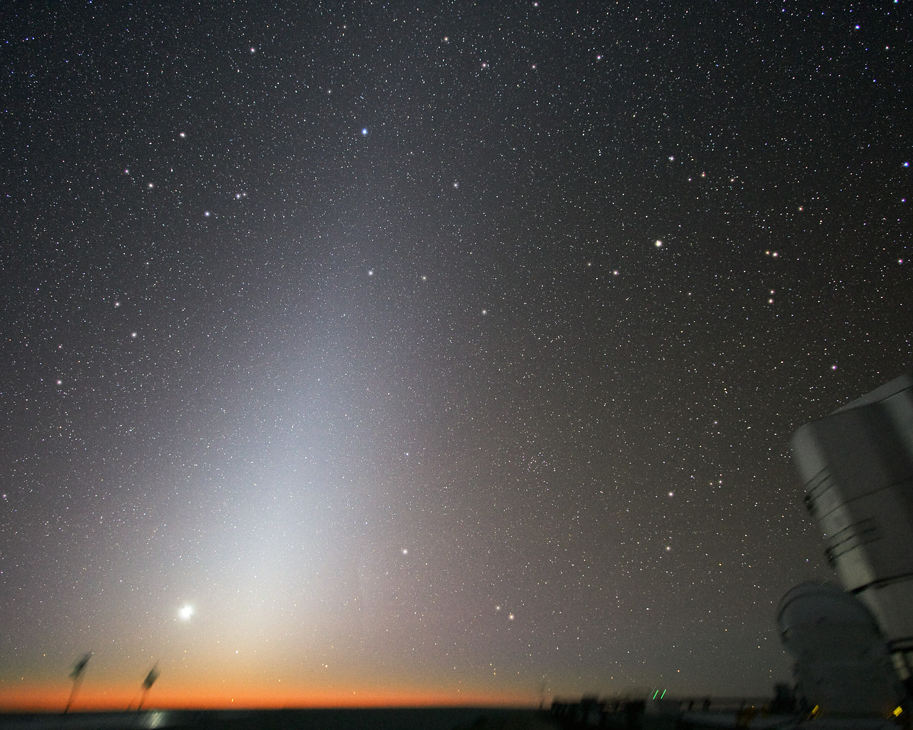 The Moon is rising, with zodiacal light shining on top of it, in the breathtaking framework of ESO’s Very Large Telescope (VLT) observatory on Cerro Paranal. One of the four 8.2-metre VLT Unit Telescopes, along with one of the four 1.8-metre Auxiliary Telescopes, is visible to the right.