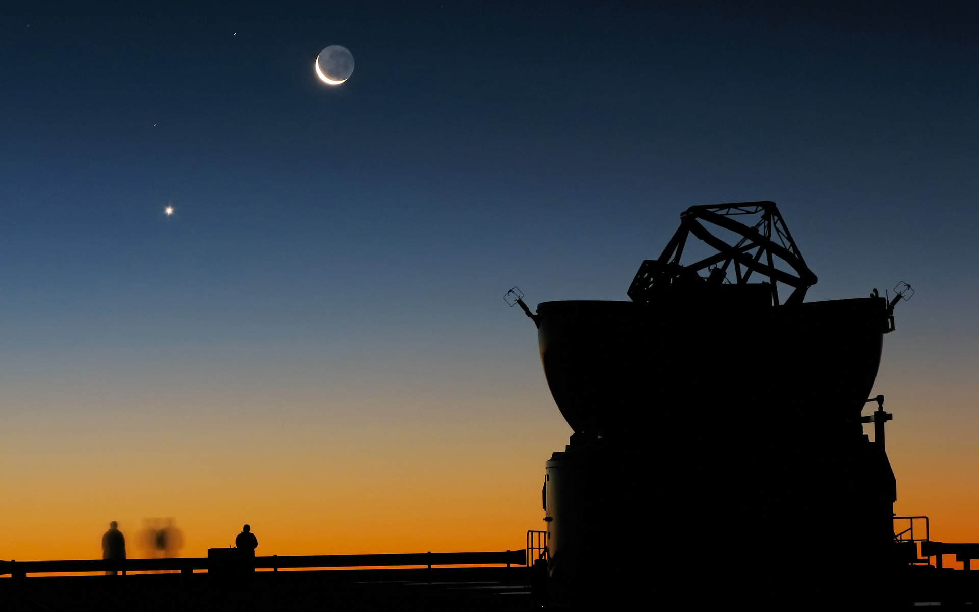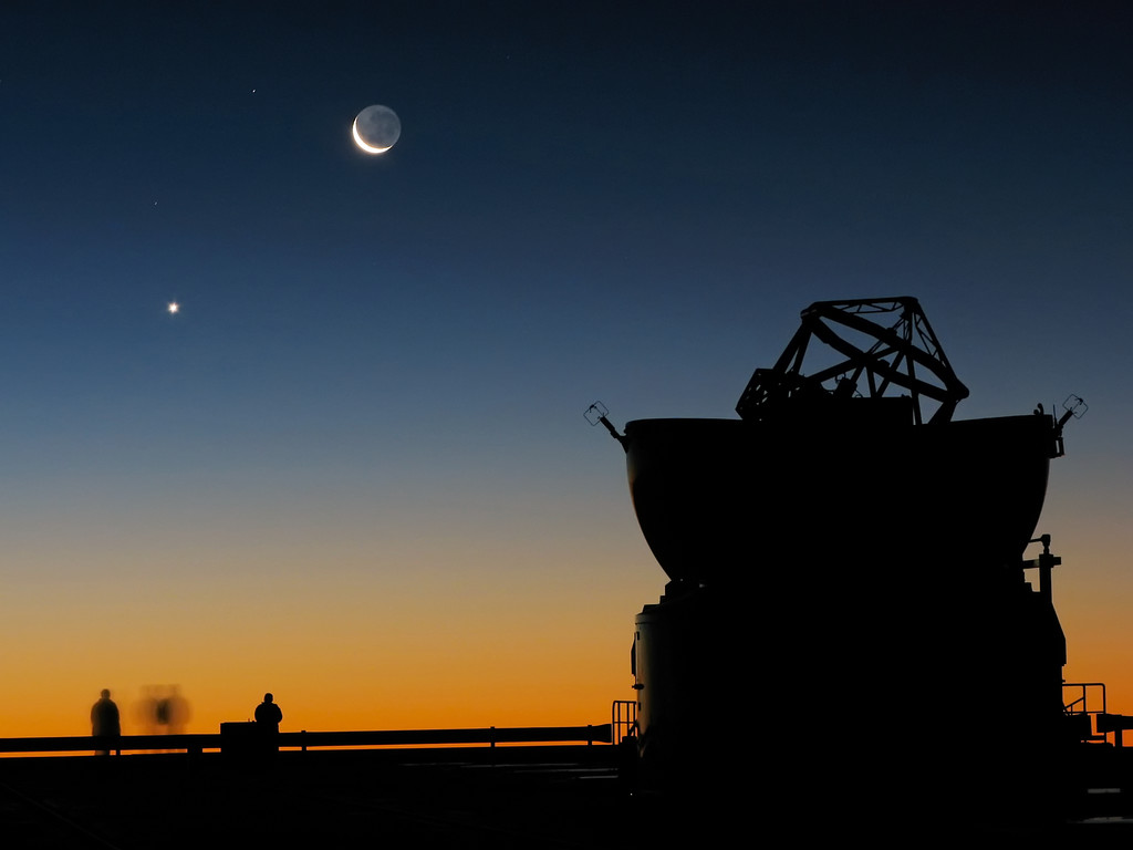 The dome of one of the VLT’s Auxiliary Telescopes is seen in the foreground. The crescent Moon and, to its left, planet Venus, make for a beautiful scenery.