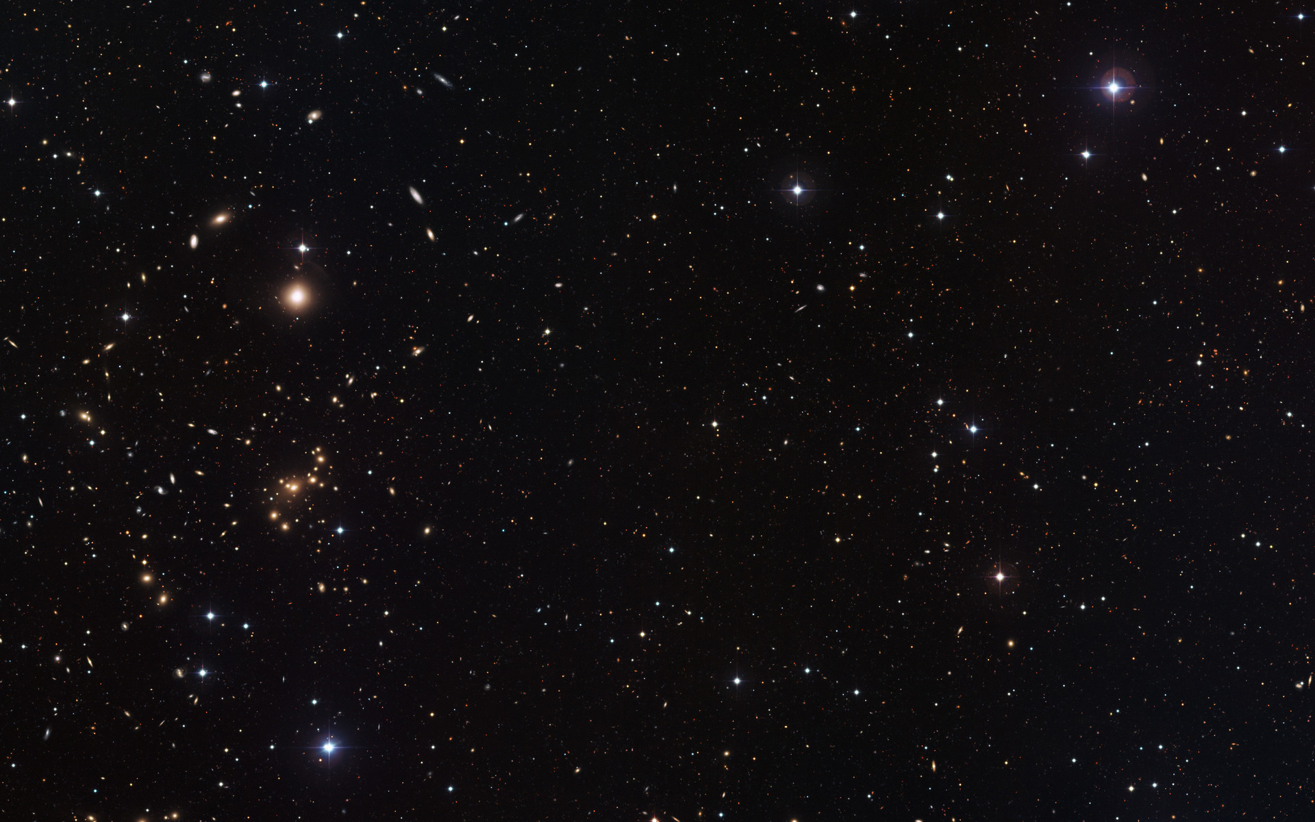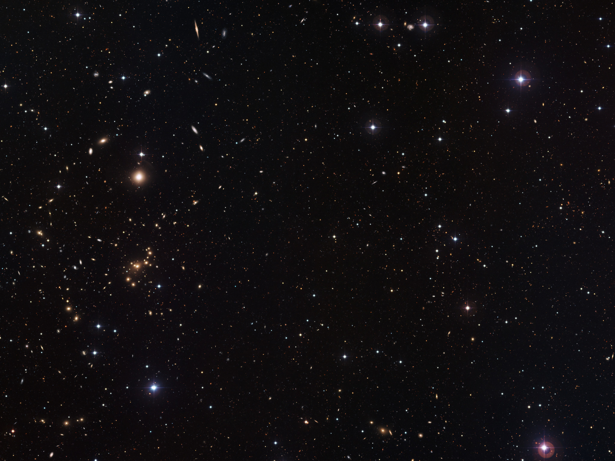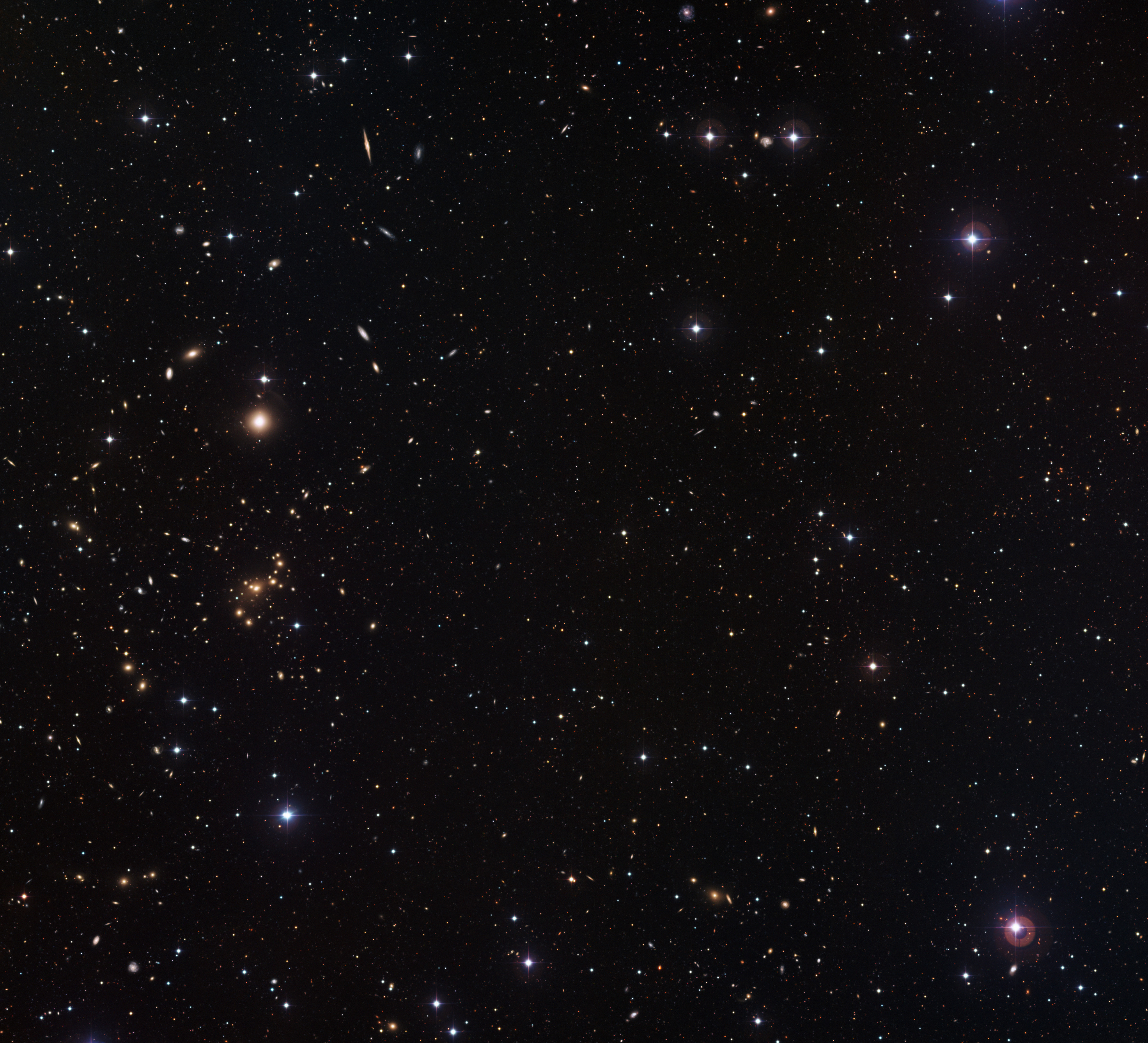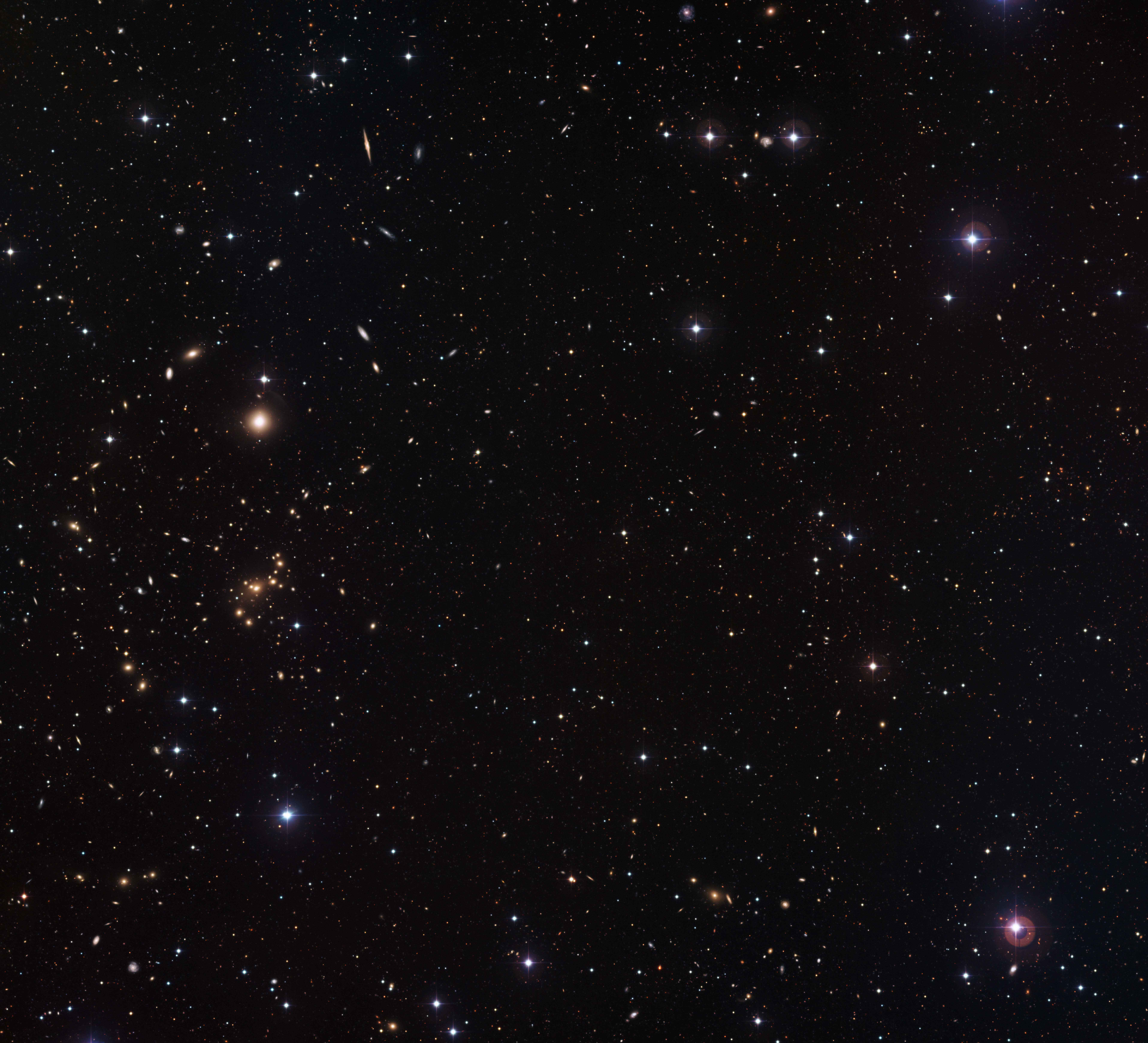 Una moltitudine di galassie deboli, piccoli punti luminosi sparsi nel cielo oscuro, furono catturati dal Wide Field Imager montato sul telescopio da 2.2-metri di proprietà ESO e MPG situato al osservatorio La Silla in Cile. Immagini come quella mostrata sopra sono strumenti potenti per capire come sia distribuita la materia oscura nelle galassie.
