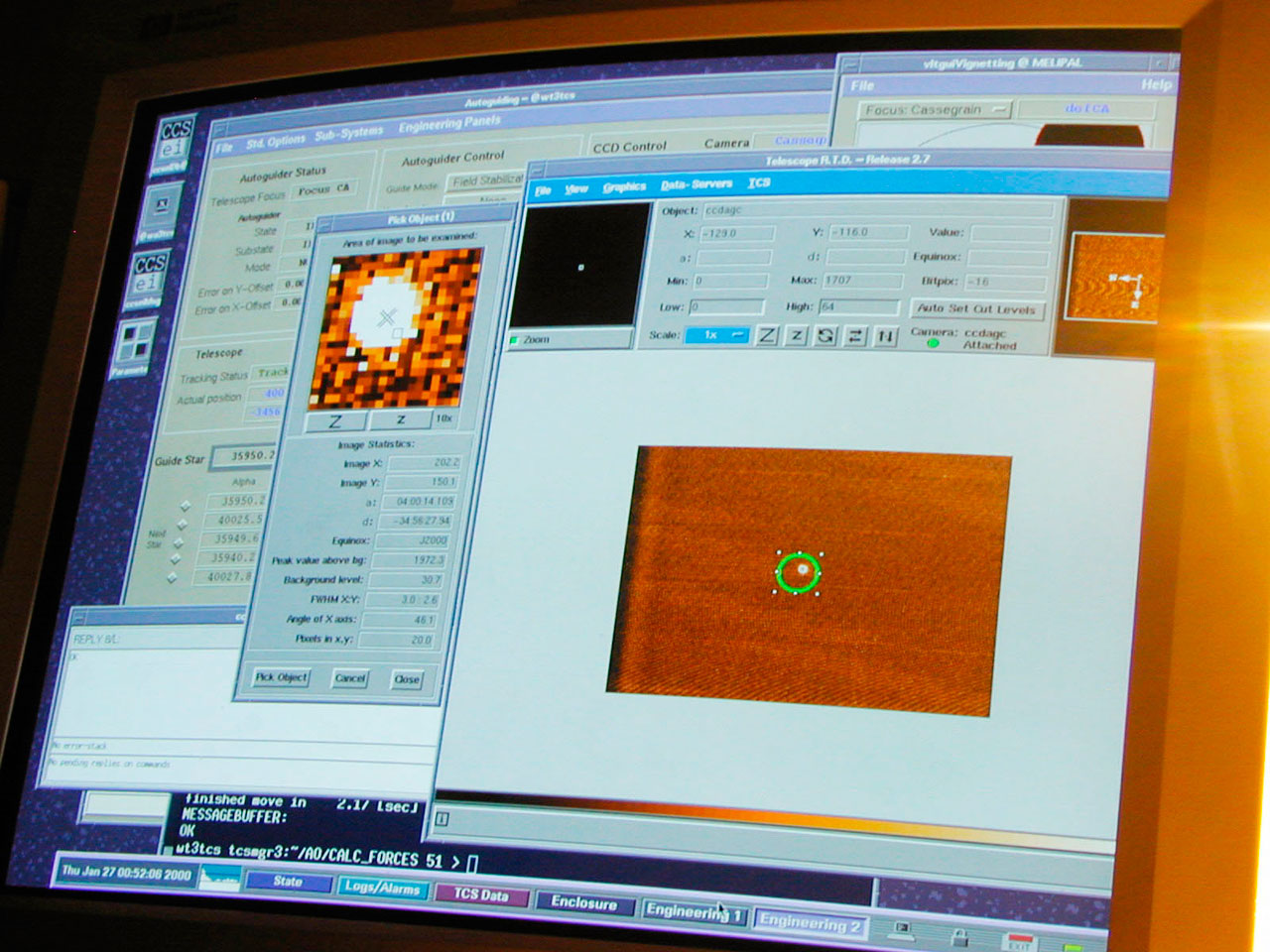 Following two days of preliminary adjustments after the installation of the secondary mirror, cf. ESO Press Photos eso0003, MELIPAL was pointed to the sky above Paranal for the first time, soon after sunset in the evening of January 26. The light of a bright star was directed towards the Guide Probe camera, and the VLT Commissioning Team, headed by Dr. Jason Spyromilio, initiated the active optics procedure. This adjusts the 150 computer-controlled supports under the main 8.2-metre Zerodur mirror as well as the position of the secondary 1.1-metre Beryllium mirror. After just a few iterations, the optical quality of the recorded stellar image was measured as 0.46 arcsec (ESO Press Photo eso0004), a truly excellent value, especially at this stage!