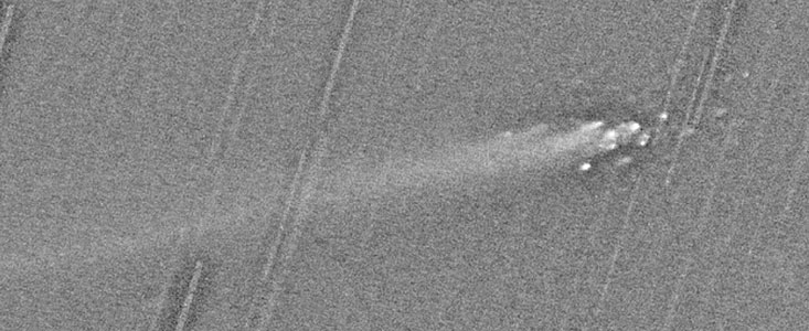 The proposal was successful and three short exposures were made by the ESO staff astronomers at Paranal in the early evening of August 6 with the FORS-1 multi-mode instrument. More than a dozen condensations are seen in Comet LINEAR, as "mini-comets" with tails. At the centre of each of them is a piece of the disintegrating cometary nucleus, perhaps some tens of metres across.
