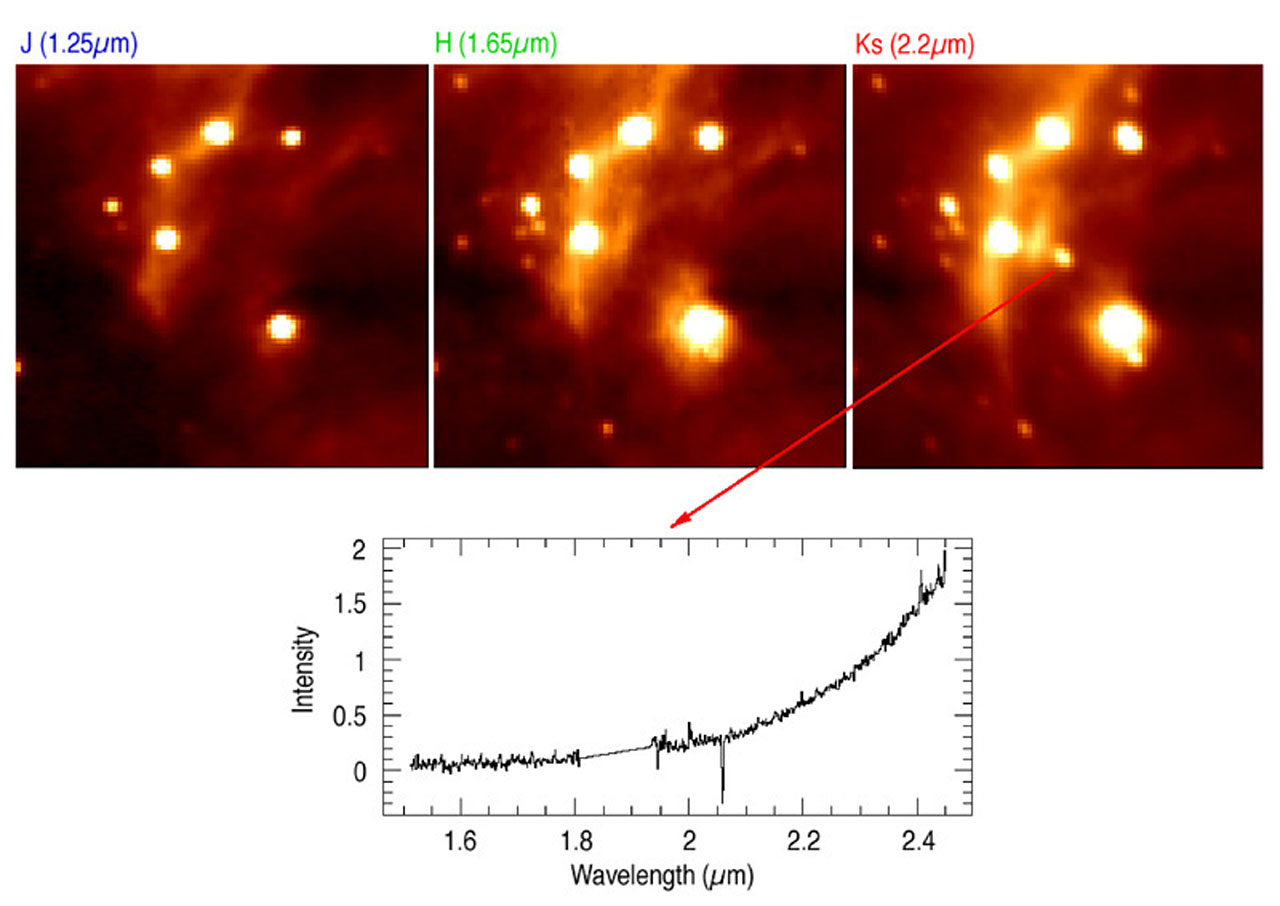 The spectrum shows a featureless "continuum" that rises steeply towards long wavelengths, exactly as expected for a star in the process of formation, deeply embedded in dust. It is easily distinguishable from stars that have already formed, since their spectra display several absorption features and rise towards shorter wavelengths instead.