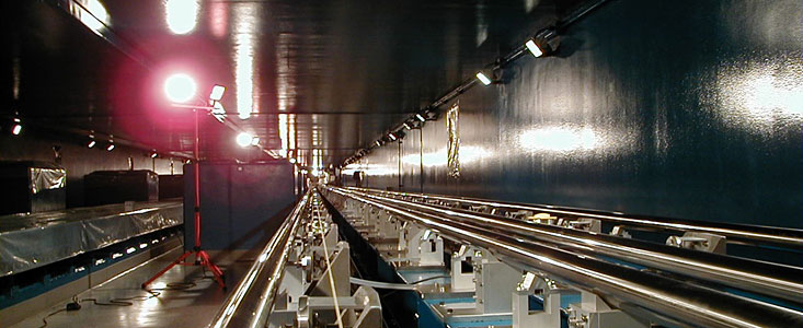 The assembly of the translation mechanisms for the first two Delay Lines in the tunnel started in mid-2000. This included the alignment of their rails and supports to the extreme accuracy of about 0.25 mm over a total distance of 66.7 metres (ESO Press Photos eso0032a-b). To achieve such an unusually high precision, ESO - in collaboration with the French company FOGALE - developed a measurement system that is based on the water-level principle.