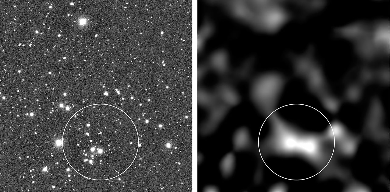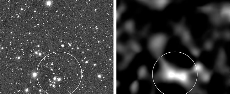Much weaker lensing effects (by less massive objects) are in fact present everywhere in the Universe, but they are not easy to detect. This was the effect the astronomers searched for. It manifests itself as a small stretching in a particular direction of the images of all galaxies that are located behind the gravitational lens. This phenomenon may then be observed as an alignment of galaxies in that particular sky area. The existence of the lens and its overall mass and extension can then be determined, albeit with some uncertainty only.