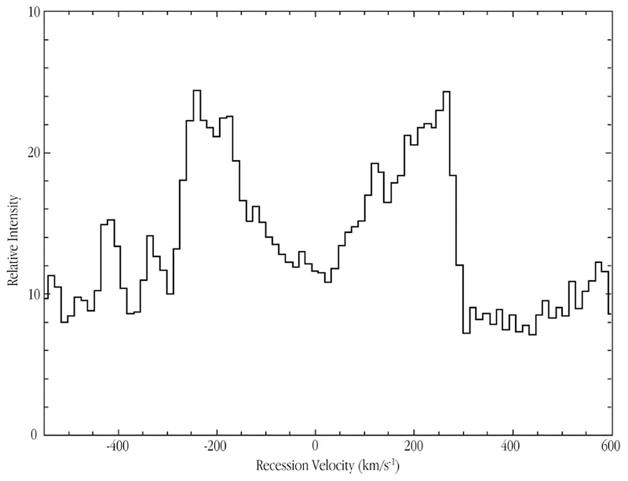 The derived spectral profile of the H-alpha line is shown in ESO Press Photo eso0041 . The shape is very unusual and implies that the emitting region is probably not concentrated at the centre of the galaxy, but most likely has a disk-like structure. Taking into account the inclination of the galaxy (50°), the difference in velocity between the two peaks is 830 km/sec, i.e. the rotational velocity is half of that, 415 km/sec, or significantly more than what is measured in normal spiral galaxies.