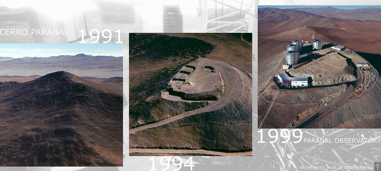 Following the decision in December 1987 by the ESO Council to embark upon the VLT Project (with Massimo Tarenghi as Project Manager), Paranal was chosen as the site in 1991. In the meantime, the Chilean Government had resolved to donate an area of approx. 700 km 2 around this mountain to ESO, and construction work started the same year. The left photo shows Paranal at this stage.