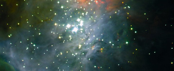The Trapezium Cluster is a group of young stars that appears to the unaided eye as a faint central 'star' in the Orion Nebula . This cluster is located at a distance of about 1200 light-years and contains nearly 1000 stars, most of which are younger than 1 million years. The stars in this cluster are in their infancy when compared to our middle-aged Sun that is about 4.6 billion years old (reduced to a human timescale, they would be just 3 days old, compared to the Sun's 40 years). Among the hundreds of normal stars in the Trapezium Cluster, astronomers have previously identified a population of objects so faint that they have been considered as prime candidates for very young Brown Dwarfs.