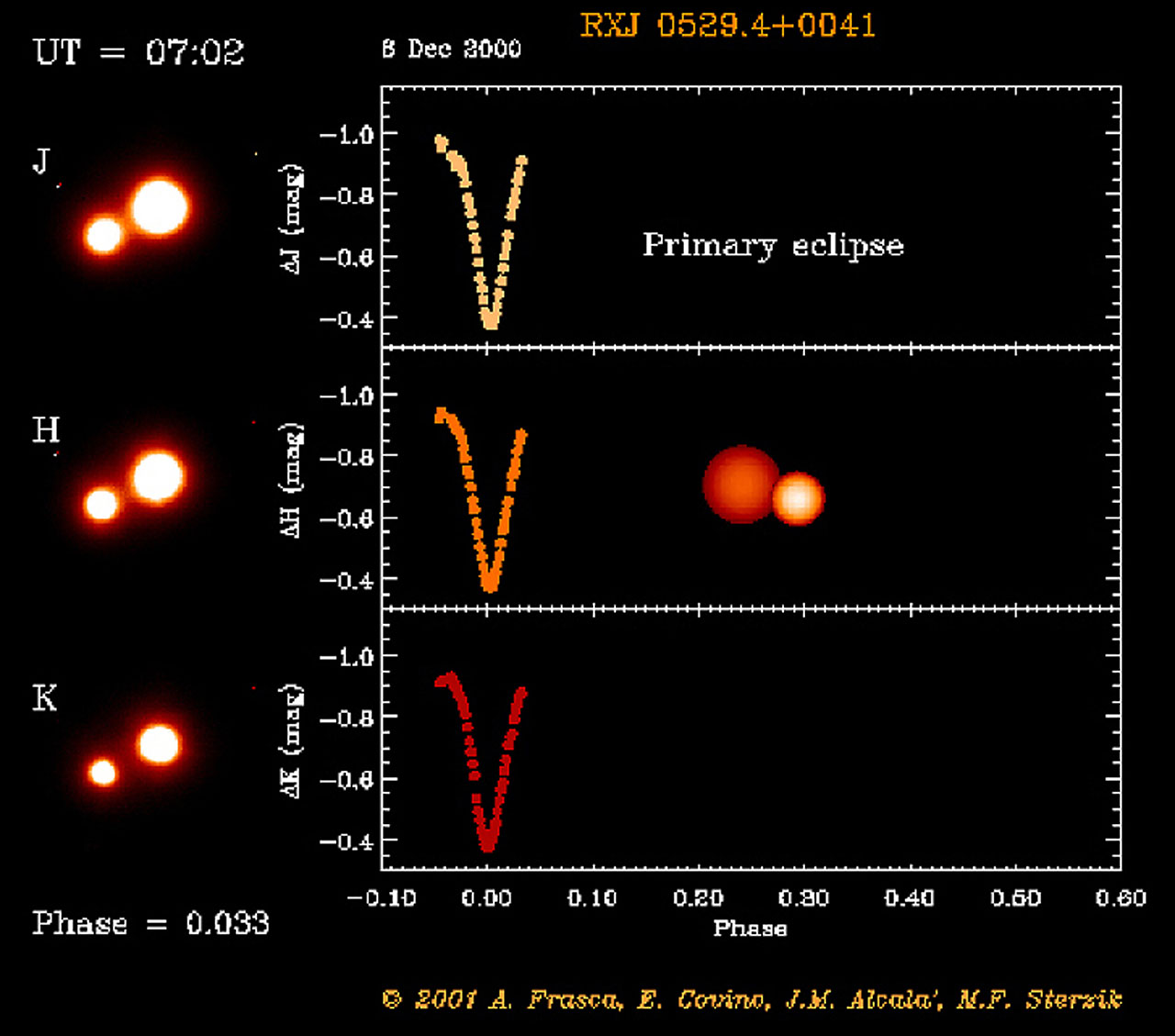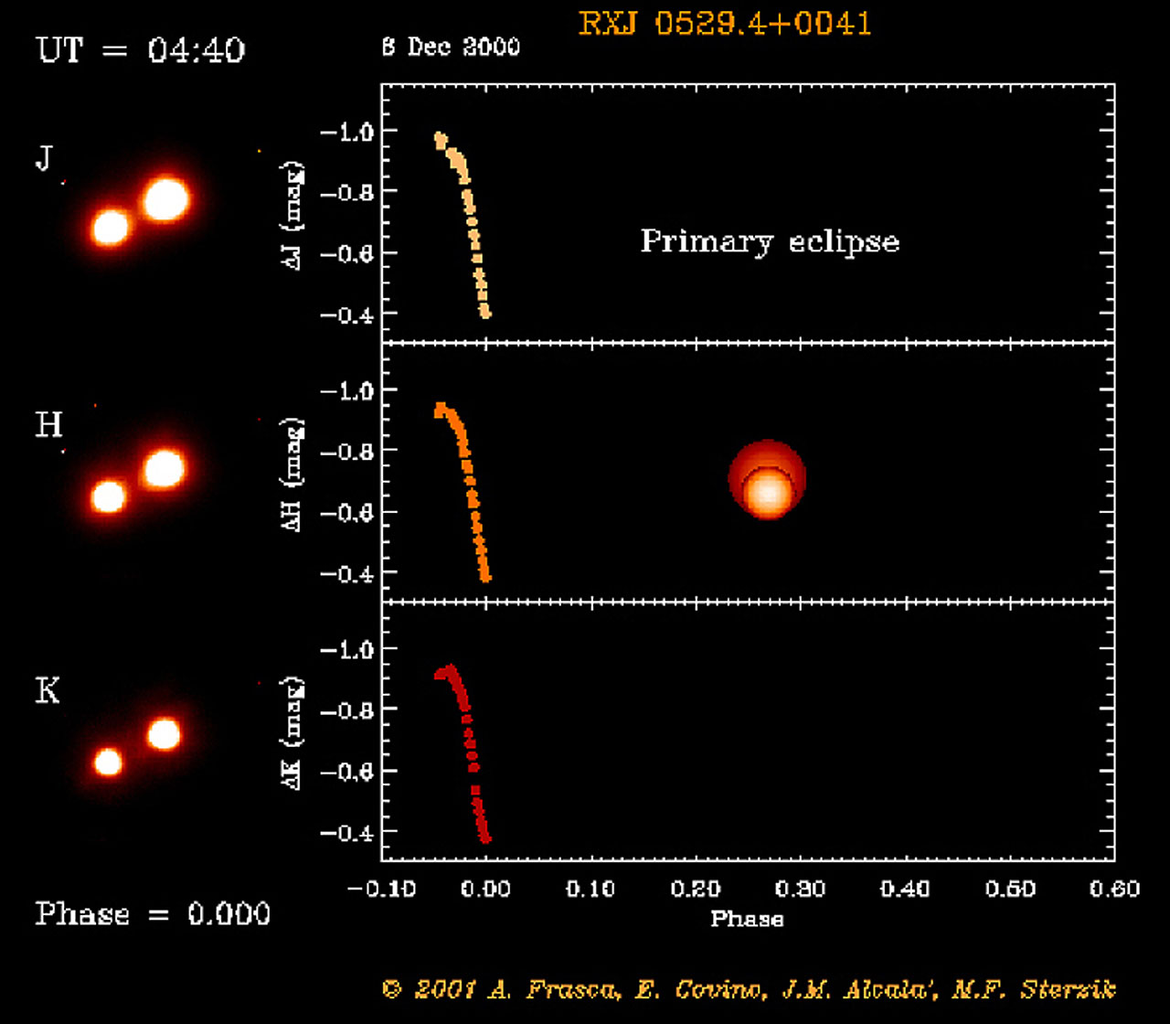 The right-hand panel shows a build-up of the observed light curves for the binary system. It represents the brightness difference between binary system and the third object that shines with constant light. Both the primary, deeper and the secondary, less deep eclipses are well visible. The primary eclipse was observed on December 8, 2000 and is here displayed at phase zero. During this minimum, the brightness of the binary system decreases by about 45% (0.4 magnitudes). The primary eclipse takes place when the smaller component blocks the light from the brighter and hotter star. The orbital motions of the two stars are illustrated by a computer-generated, animated sequence.