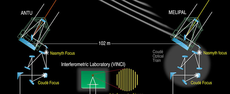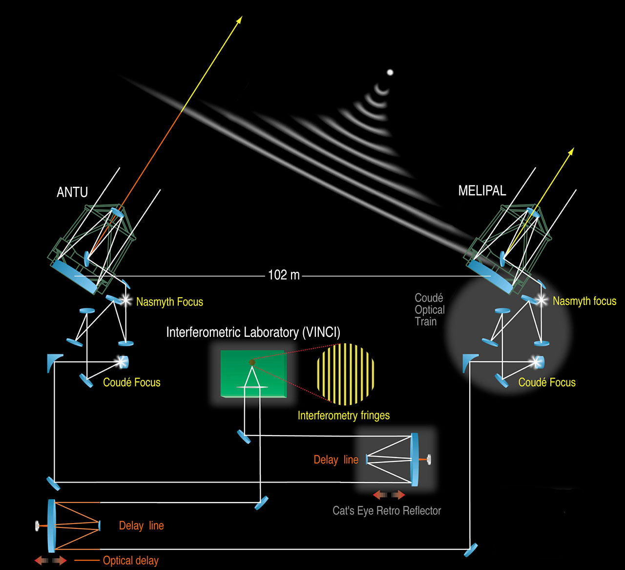 As can be seen on ESO Press Photo eso0134, the light from the observed star is first directed towards the Nasmyth focus by three mirrors in the telescope tube. From here, it continues towards the intermediate Coudé focus below the telescope and then onwards through a subterranean light duct to the VLTI Delay Lines that are installed in the Interferometric Tunnel. At the end of this long chain of mirrors and after traveling a distance of approximately 200 metres, the light finally reaches the VINCI instrument in which the two beams interact coherently (in phase) to produce "interferometric fringes".