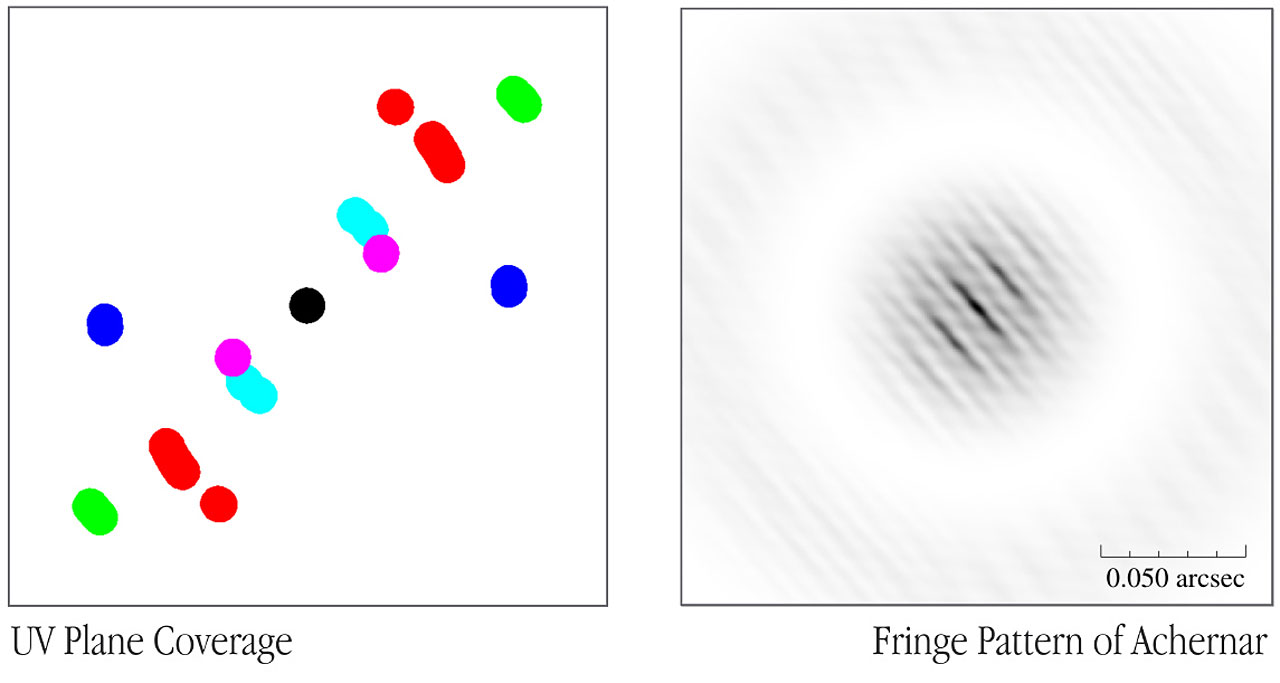 It turned out that the various predictions of mirror positions and angles were quite accurate and only a moderate amount of time was needed to "obtain fringes" in all different configurations. Measurements were then made on a number of stars, among them the brightest star in the southern constellation Eridanus (The River), known as Alpha Eridani or Achernar, that was observed several times with the different telescope pairings. This star is a hot dwarf (spectral type "B5 IV") that is located at a distance of about 145 light-years. It has also been extensively observed during earlier VLTI tests. It is a very suitable object for the present resolution tests as its angular diameter is only about 0.002 arcsec and it therefore remains unresolved at the near-infrared wavelength of the K-band used (2.2 µm).