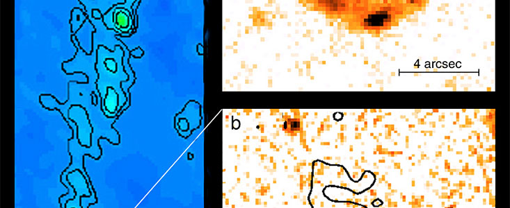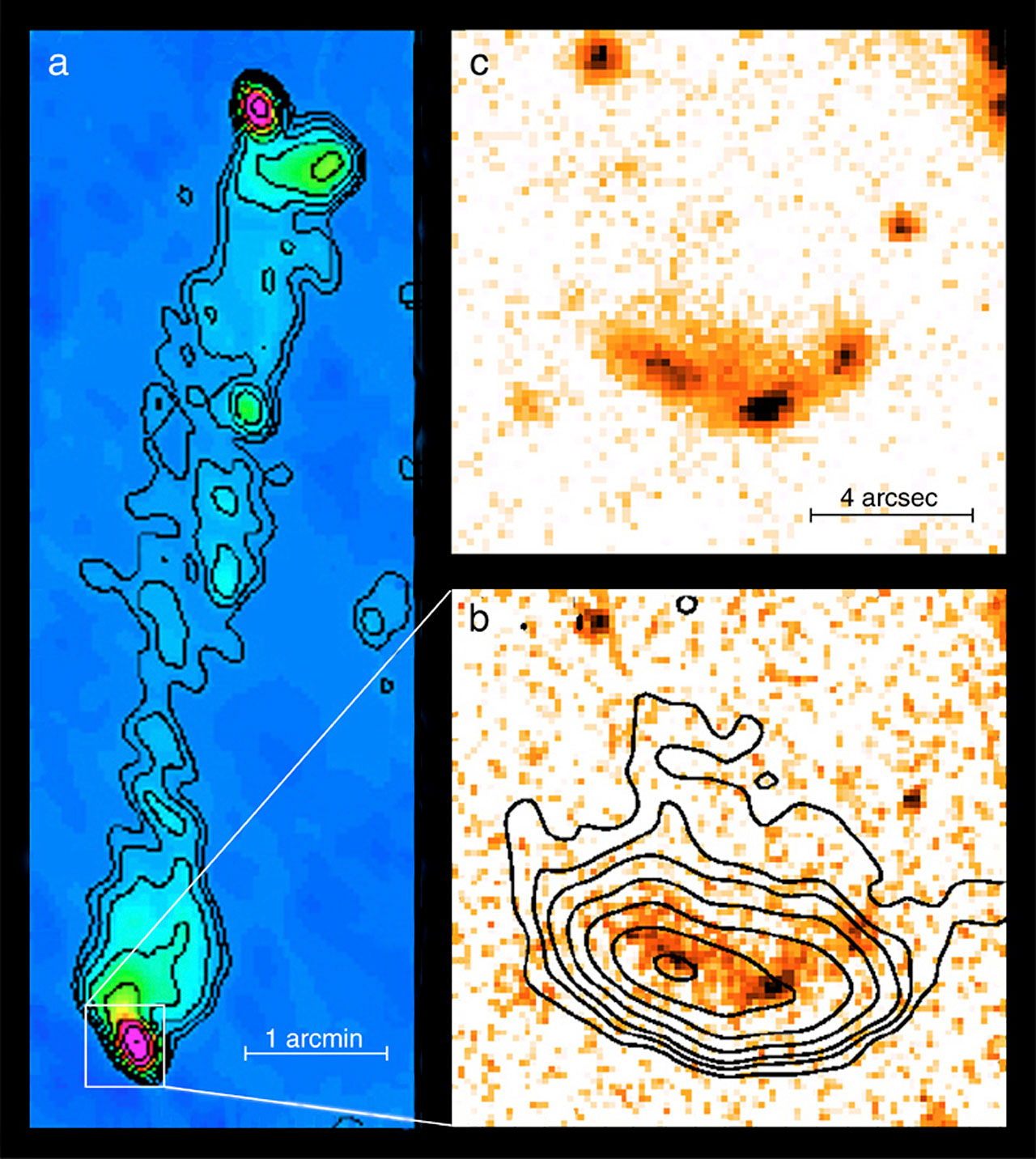 The region where the jets collide with the intergalactic medium are known as " hot spots ". Superposing the intensity contours of the radio emission from the southern "hot spot" on a near-infrared J-band (wavelength 1.25 µm) VLT ISAAC image ("b") shows three distinct emitting areas; they are even better visible on the I-band (0.9 µm) FORS1 image ("c"). This emission is obviously associated with the shock front visible on the radio image.