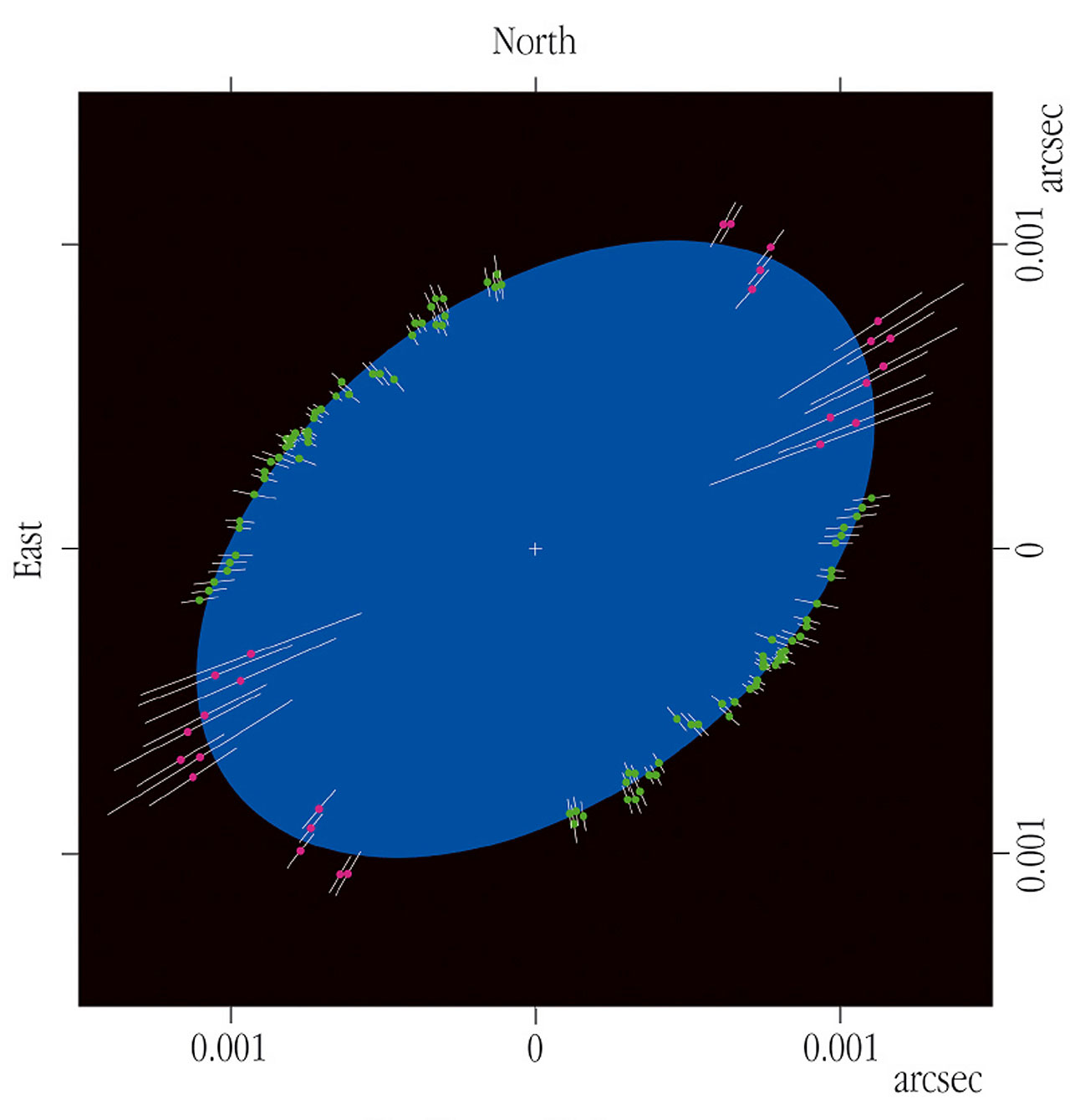 The angular size of Achernar's elliptical profile as indicated in ESO Press Photo eso0316 is 0.00253 ± 0.00006 arcsec (major axis) and 0.00162 ± 0.00001 arcsec (minor axis) [4], respectively. At the indicated distance, the corresponding stellar radii are equal to 12.0 ± 0.4 and 7.7 ± 0.2 solar radii, or 8.4 and 5.4 million km, respectively. The first value is a measure of the star's equatorial radius. The second is an upper value for the polar radius - depending on the inclination of the star's polar axis to the line-of-sight, it may well be even smaller.