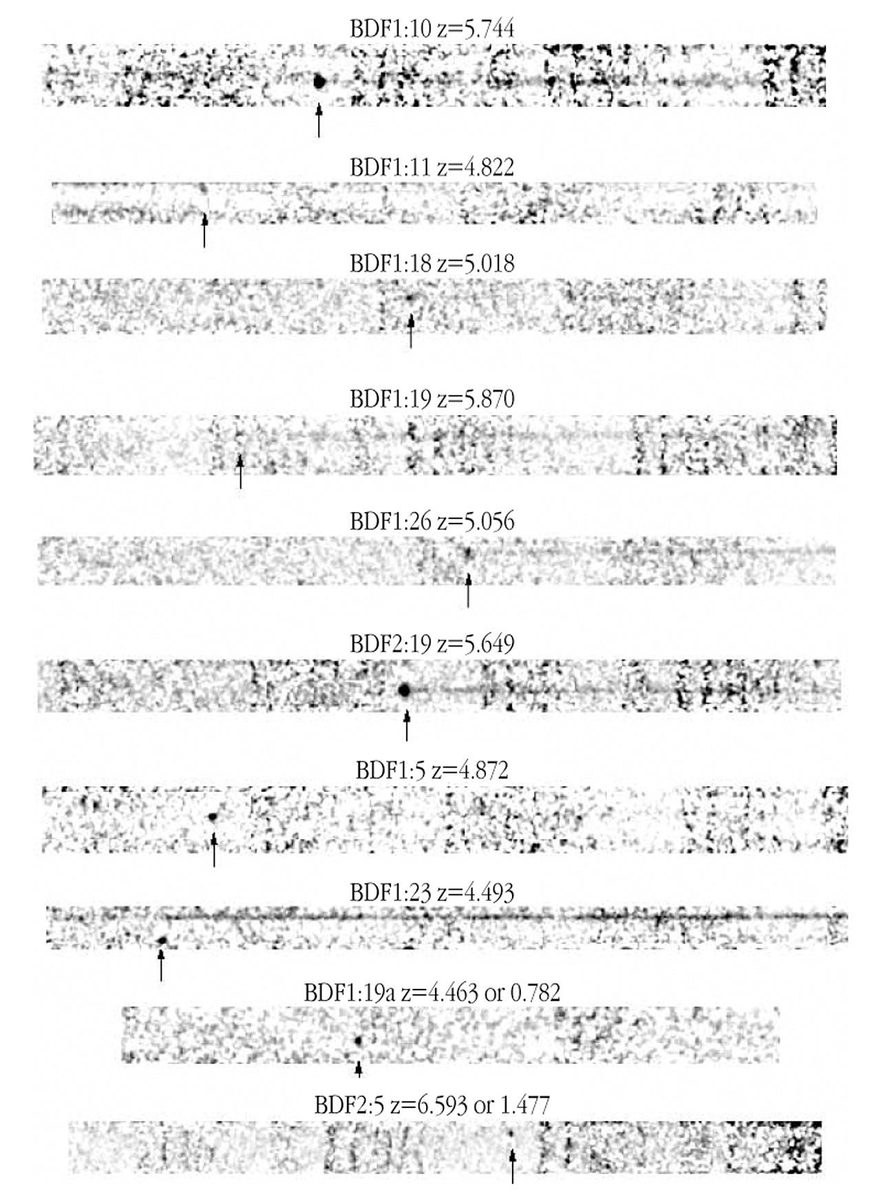 [3]: The measured redshifts of the galaxies in the Bremer Deep Field are z = 4.8-5.8, with one unexpected (and surprising) redshift of 6.6. In astronomy, the redshift denotes the fraction by which the lines in the spectrum of an object are shifted towards longer wavelengths. The observed redshift of a remote galaxy provides an estimate of its distance. The distances indicated in the present text are based on an age of the Universe of 13.7 billion years. At the indicated redshift, the Lyman-alpha line of atomic hydrogen (rest wavelength 121.6 nm) is observed at 680 to 920 nm, i.e. in the red spectral region.