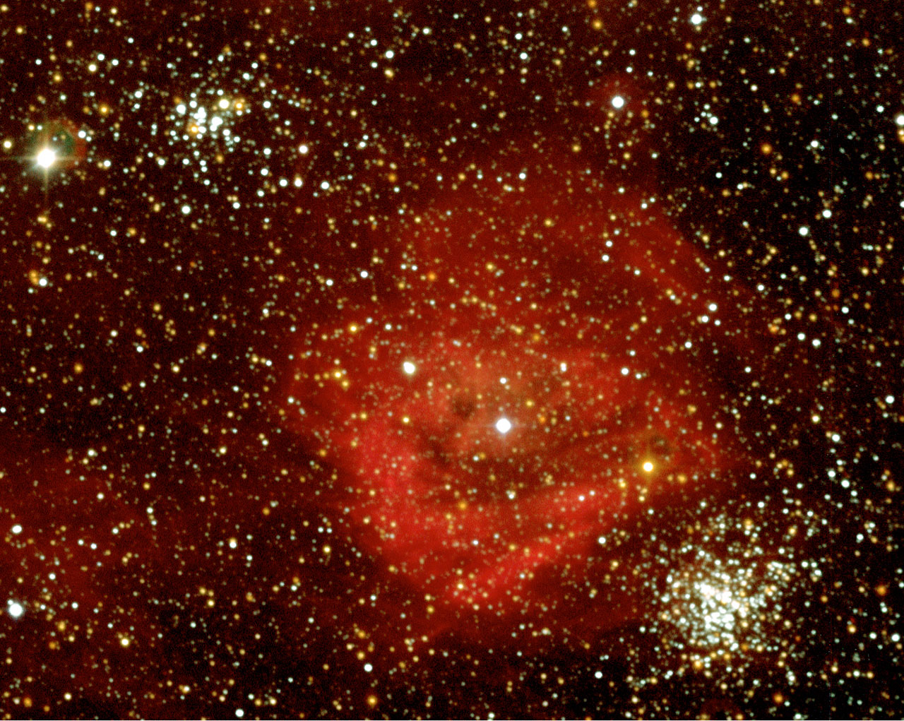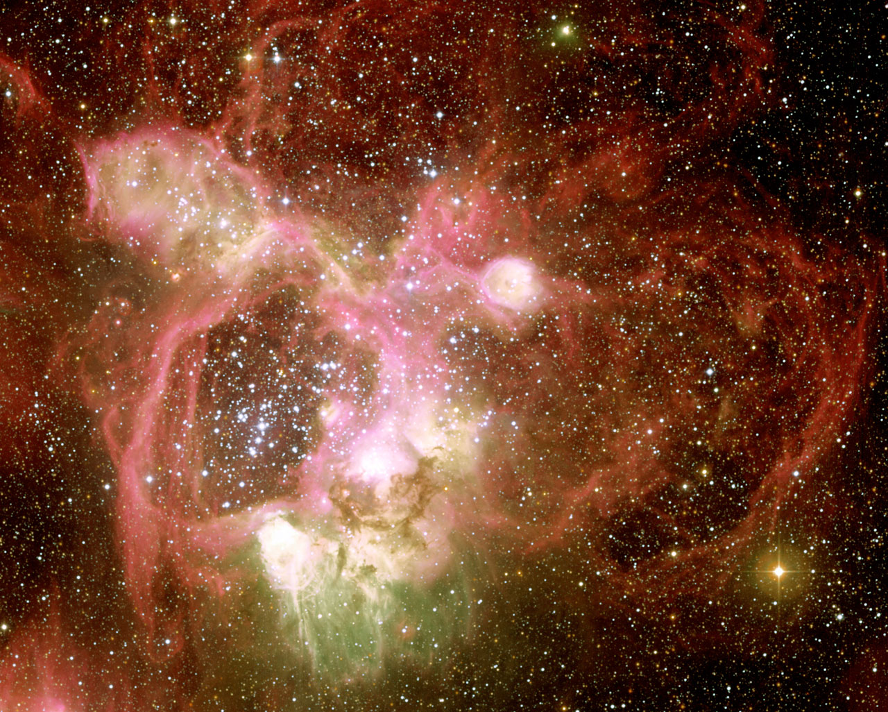 N44 [2] in the Large Magellanic Cloud is a spectacular example of such a giant H II region. Having observed it in 1999, a team of European astronomers [3] again used the Wide-Field-Imager (WFI) at the MPG/ESO 2.2-m telescope of the La Silla Observatory, pointing this 67-million pixel digital camera to the same sky region in order to provide another striking - and scientifically extremely rich - image of this complex of nebulae. With a size of roughly 1,000 light-years, the peculiar shape of N44 clearly outlines a ring that includes a bright stellar association of about 40 very luminous and bluish stars.