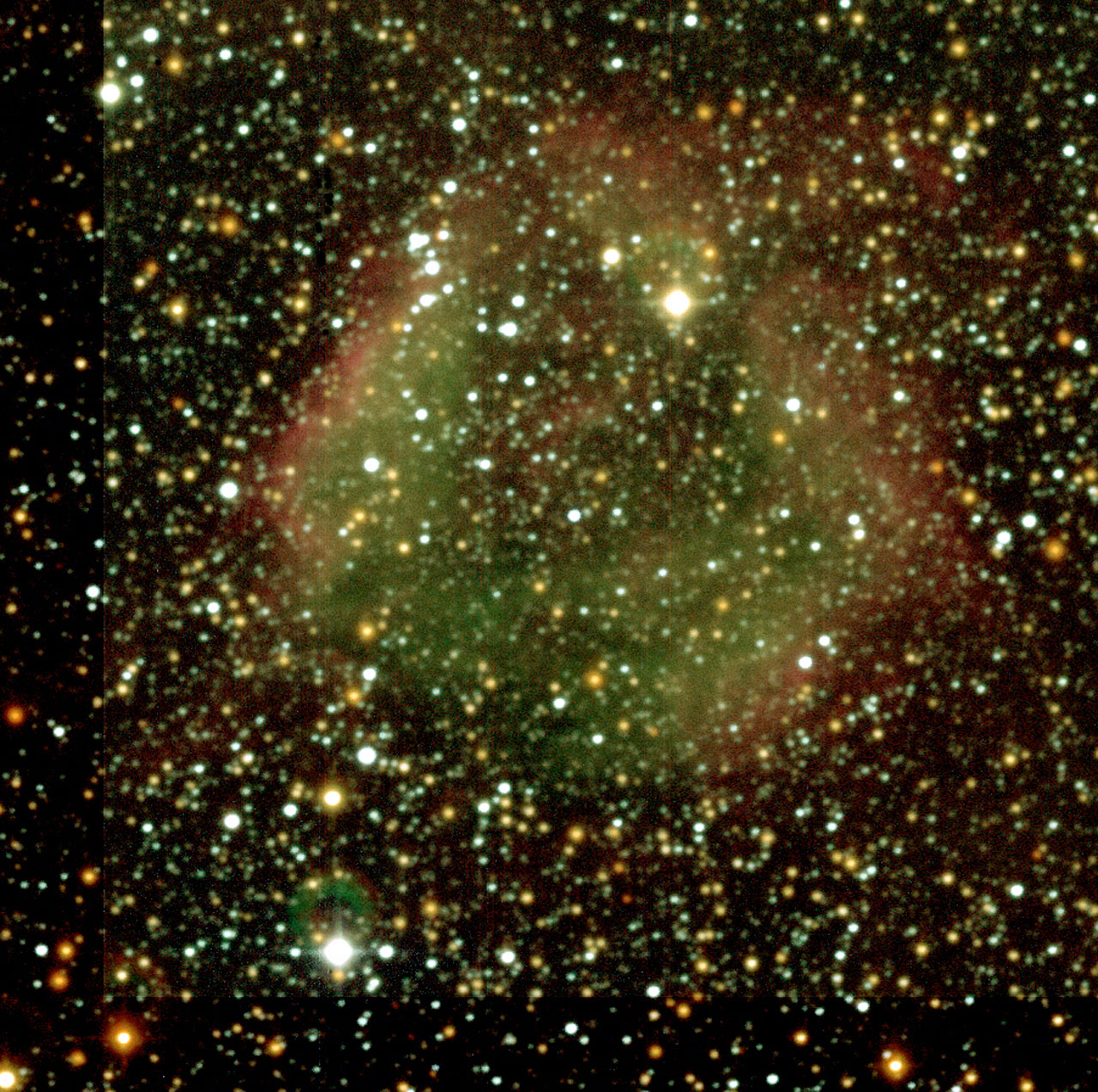 The composite photo produced in this way approximates the real colours of the nebula. Most of the region appears with a pinkish colour (a mixture of blue and red) since, under the normal temperature conditions that characterize most of this H II region, the red light emitted in the H-alpha line and the blue light emitted in the line of singly-ionised oxygen are more intense than that emitted in the line of the doubly-ionised oxygen (green).