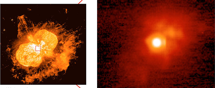This image shows that the central region of the Homunculus nebula is dominated by an object that is seen as a point-like light source with many luminous "blobs" in the immediate vicinity.