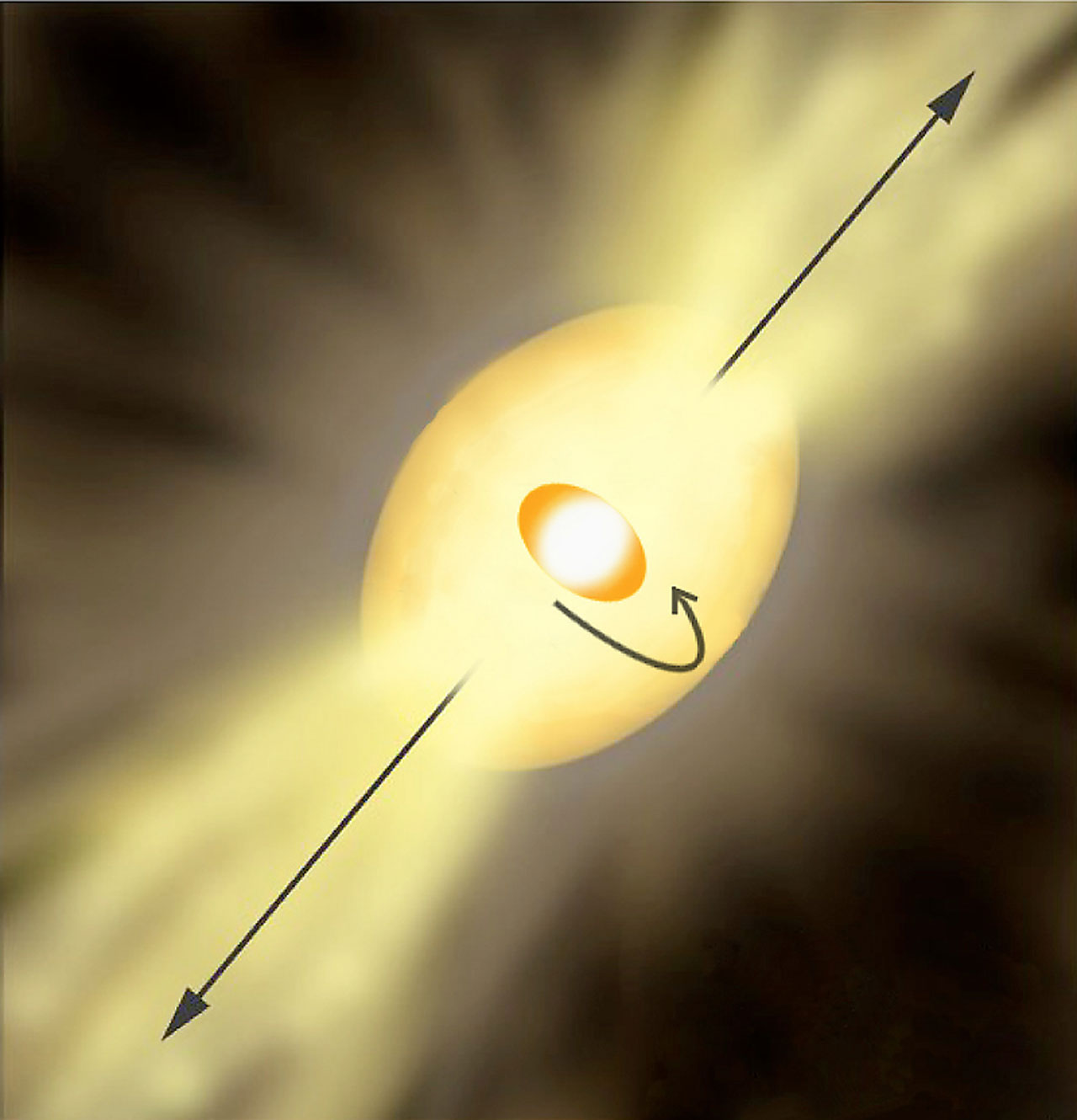 According to mainstream theories, stars lose most mass around their equator. This is because this is where the stellar wind gets "lifting" assistance from the centrifugal force caused by the star's rotation. However, if this were so in the case of Eta Carinae, the axis of rotation (through the star's poles) would then be perpendicular to both mushroom-shaped clouds. But it is virtually impossible that the mushroom clouds are positioned like spokes in a wheel, relative to the rotating star. The matter ejected in 1841 would then have been stretched into a ring or torus.