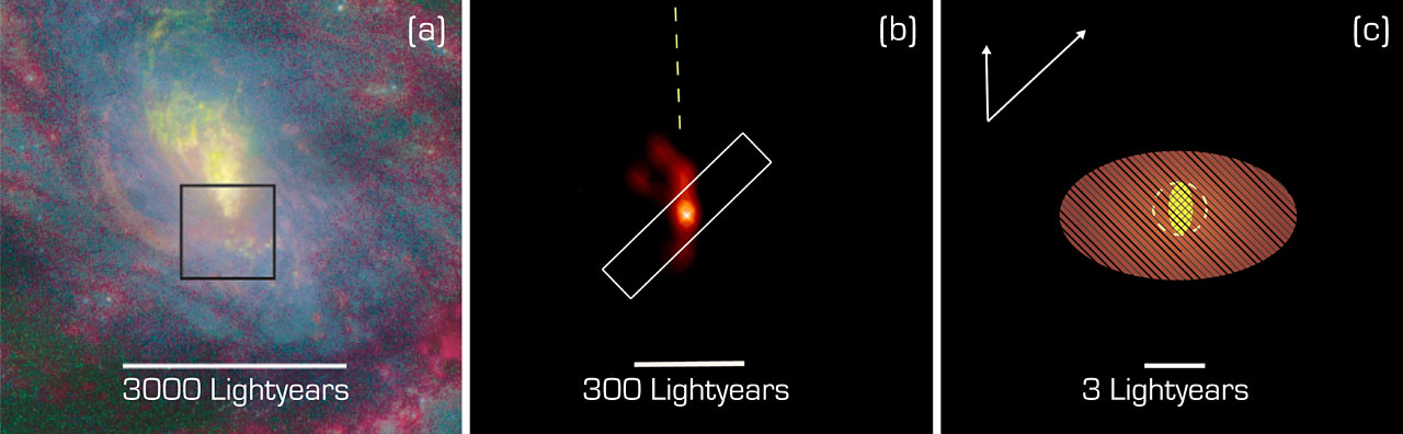 They detect the presence of an innermost, comparatively "hot" cloud of dust, heated to about 500°C and with a diameter equal to or smaller than the achieved image sharpness, i.e. about 3 light-years. It is surrounded by a cooler, dusty region, with a temperature of about 50°C, measuring 11 light-years across and about 7 light-years thick. This is most likely the predicted central, disc-shaped cloud that rotates around the black hole.