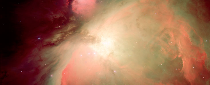 Orion the Hunter is perhaps the best-known constellation in the sky, well placed in the winter for observers in both the northern and southern hemispheres, and instantly recognisable. Just below Orion's belt (three distinctive stars in a row), the hilt of his sword holds a great jewel in the sky, the beautiful Orion Nebula. Bright enough to be seen with the naked eye, the nebula, also known as Messier 42, is a wide complex of gas and dust, illuminated by several massive and hot stars at its core, the famous Trapezium stars.